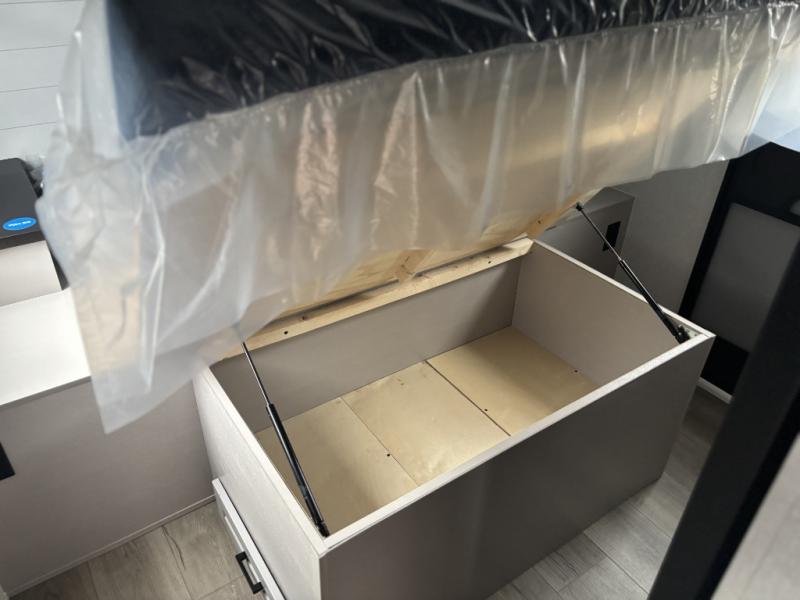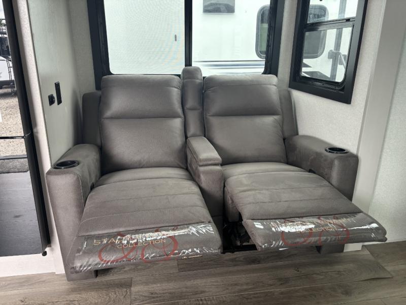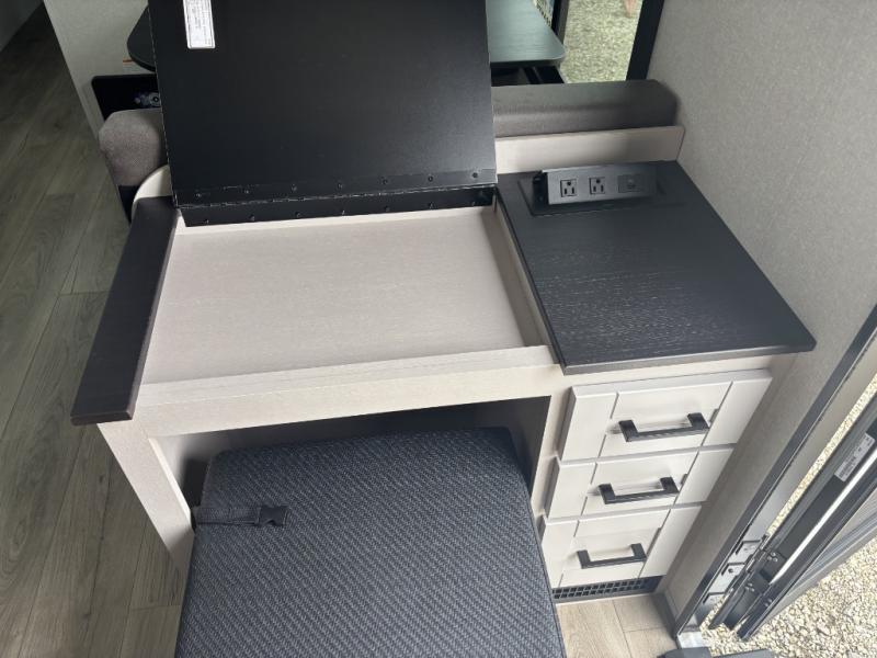 The chef of your group will love this rear kitchen trailer with generous counter space to prep meals! Your crew can dine at the booth dinette or under the 20' power awning with LED lights, and when you're ready to relax, the theater seat with table trays will provide comfort. There is also a storage/desk cabinet with a pull-out ottoman that will allow you to utilize this space however you need it! The spacious full bath will let you clean up each day, and the front private bedroom is sure to make you feel at home. Here, you'll find a queen bed, three wardrobes, plus one of the dual entry doors for added convenience!