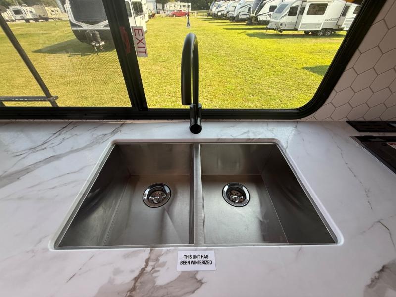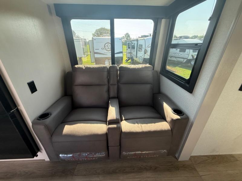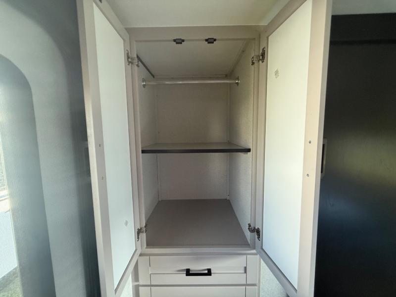 The chef of your group will love this rear kitchen trailer with generous counter space to prep meals! Your crew can dine at the booth dinette or under the 20' power awning with LED lights, and when you're ready to relax, the theater seat with table trays will provide comfort. There is also a storage/desk cabinet with a pull-out ottoman that will allow you to utilize this space however you need it! The spacious full bath will let you clean up each day, and the front private bedroom is sure to make you feel at home. Here, you'll find a queen bed, three wardrobes, plus one of the dual entry doors for added convenience!