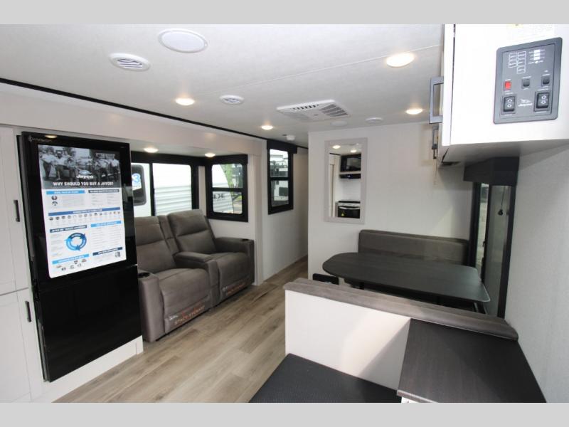 With any Jay Feather travel trailer by Jayco, you will enjoy lightweight towing, convenient exterior amenities, and at-home comforts inside! The Overlander 1 Solar Package included within the Jay Sport Package comes with a 200W solar panel and a 30-amp digital controller so you can enjoy some off-grid camping. There is also a modern graphics package with a dual-colored sidewall, LCI Solid Step fold-down aluminum tread steps on the main entry door, and Climate Shield 0 -100° F tested weather insulation package that will allow you to camp in all sorts of climates. The Customer Value Package will make time outdoors easier than ever with a power tongue jack and a Rock Solid stabilizer system, plus American-made nitro-filled Goodyear tires with self-adjusting electric brakes. More exterior features include a Keyed-Alike locking system, marine grade exterior speakers, a Magnum Truss roof system, and the list goes on! And we haven't even touched on the interior comforts, like the residential style seamless countertops and vinyl flooring throughout, decorative backsplash, handcrafted hardwood door/drawer fronts, and multiple USB charging ports to keep you going!