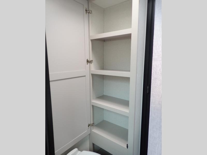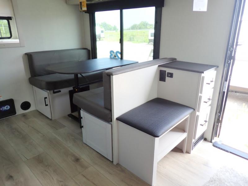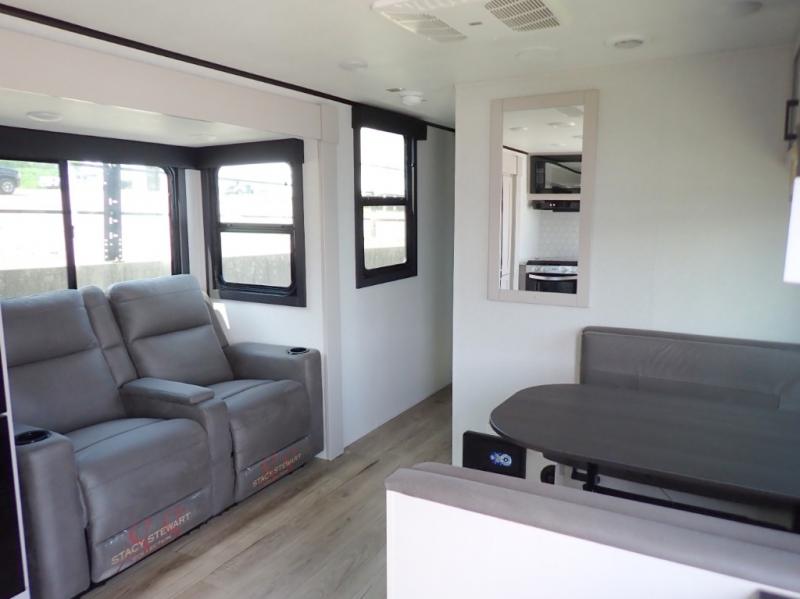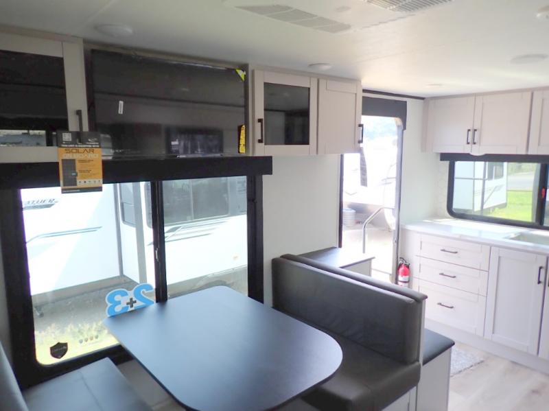 The chef of your group will love this rear kitchen trailer with generous counter space to prep meals! Your crew can dine at the booth dinette or under the 20' power awning with LED lights, and when you're ready to relax, the theater seat with table trays will provide comfort. There is also a storage/desk cabinet with a pull-out ottoman that will allow you to utilize this space however you need it! The spacious full bath will let you clean up each day, and the front private bedroom is sure to make you feel at home. Here, you'll find a queen bed, three wardrobes, plus one of the dual entry doors for added convenience!