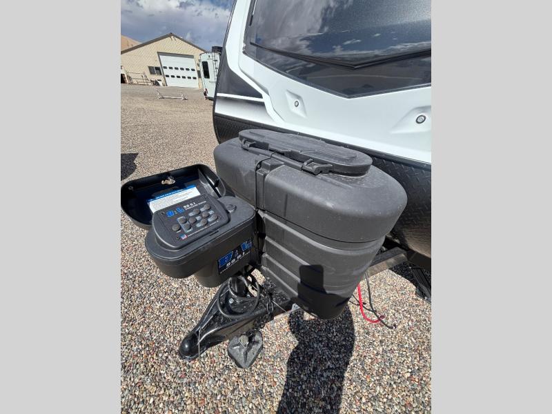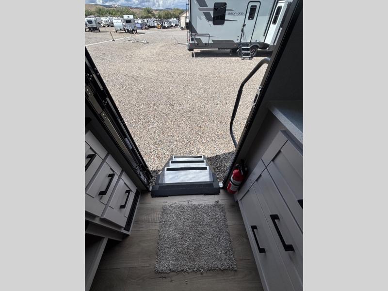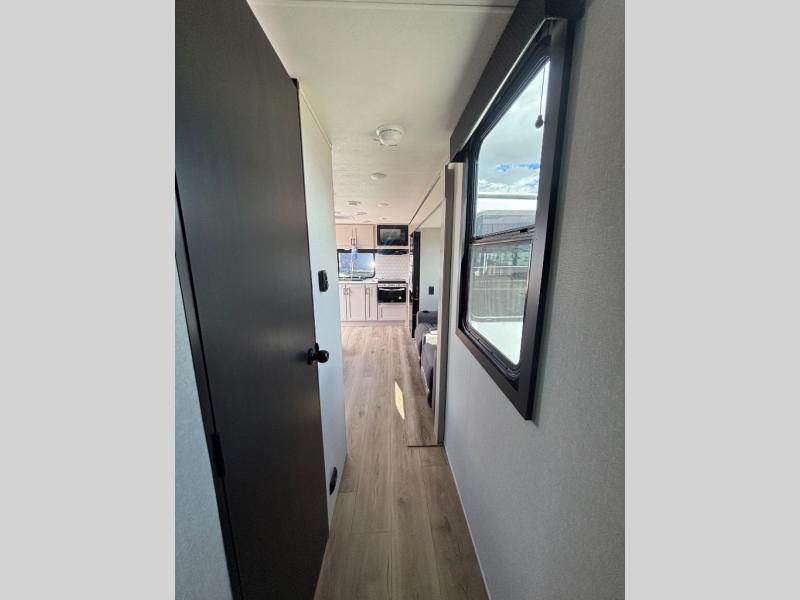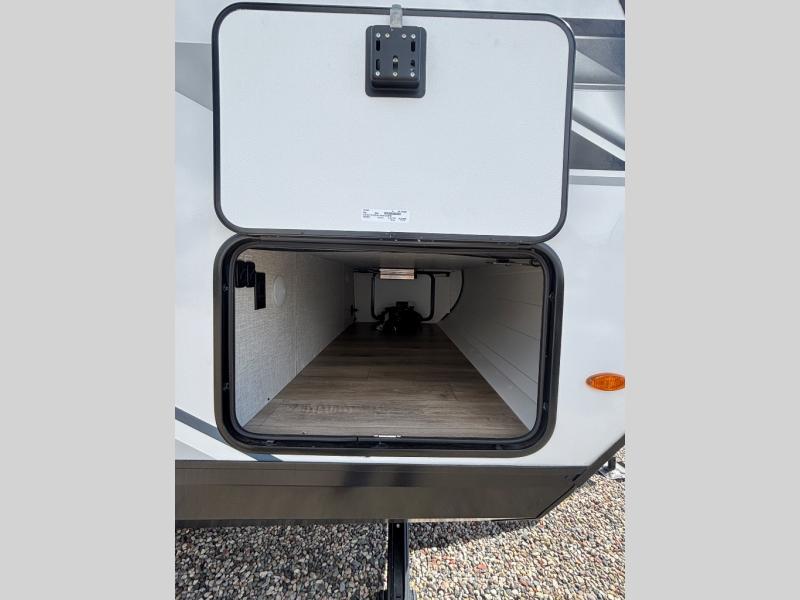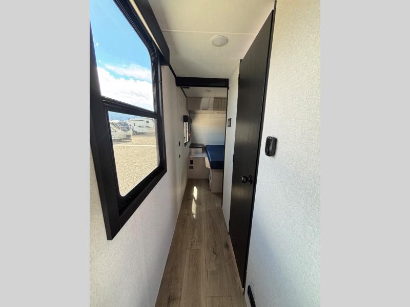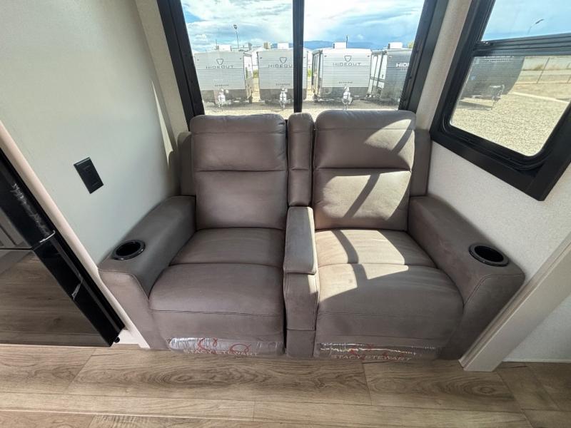 The chef of your group will love this rear kitchen trailer with generous counter space to prep meals! Your crew can dine at the booth dinette or under the 20' power awning with LED lights, and when you're ready to relax, the theater seat with table trays will provide comfort. There is also a storage/desk cabinet with a pull-out ottoman that will allow you to utilize this space however you need it! The spacious full bath will let you clean up each day, and the front private bedroom is sure to make you feel at home. Here, you'll find a queen bed, three wardrobes, plus one of the dual entry doors for added convenience!