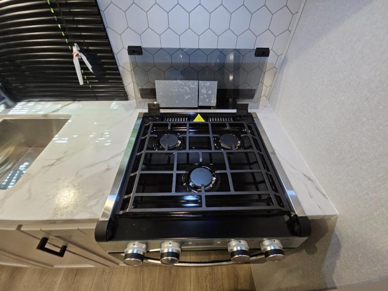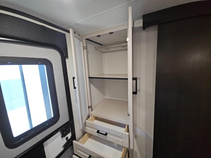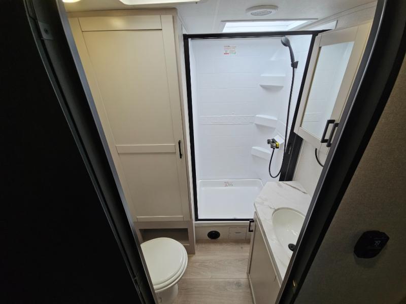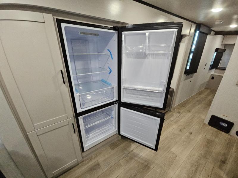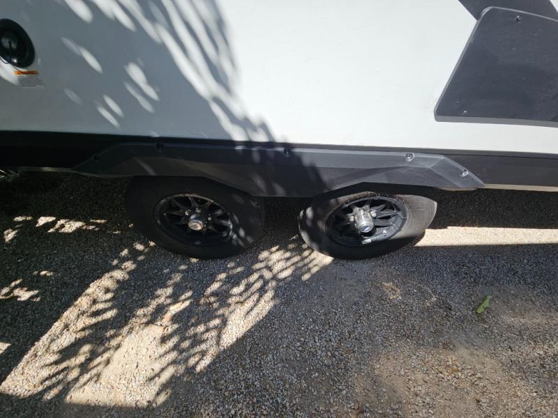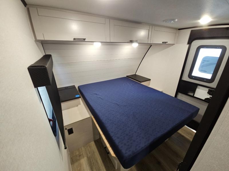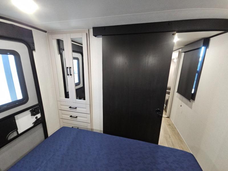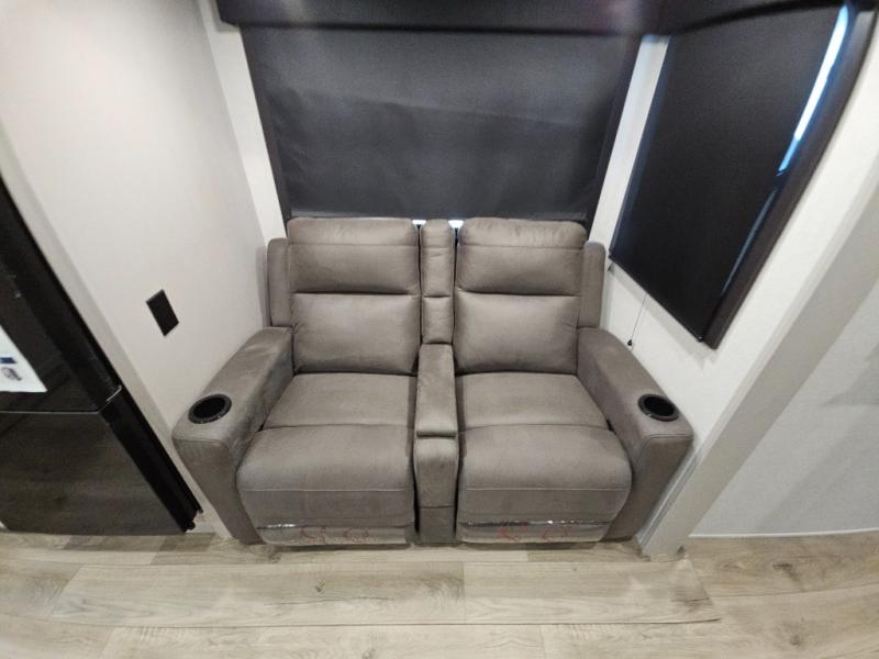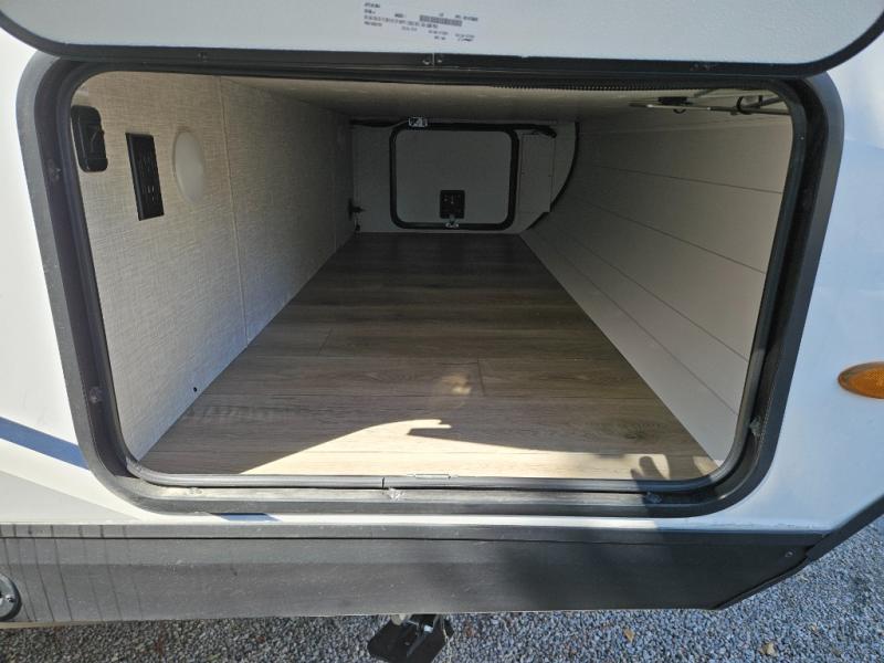 The chef of your group will love this rear kitchen trailer with generous counter space to prep meals! Your crew can dine at the booth dinette or under the 20' power awning with LED lights, and when you're ready to relax, the theater seat with table trays will provide comfort. There is also a storage/desk cabinet with a pull-out ottoman that will allow you to utilize this space however you need it! The spacious full bath will let you clean up each day, and the front private bedroom is sure to make you feel at home. Here, you'll find a queen bed, three wardrobes, plus one of the dual entry doors for added convenience!