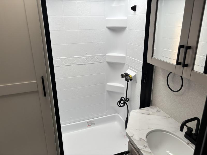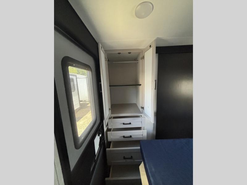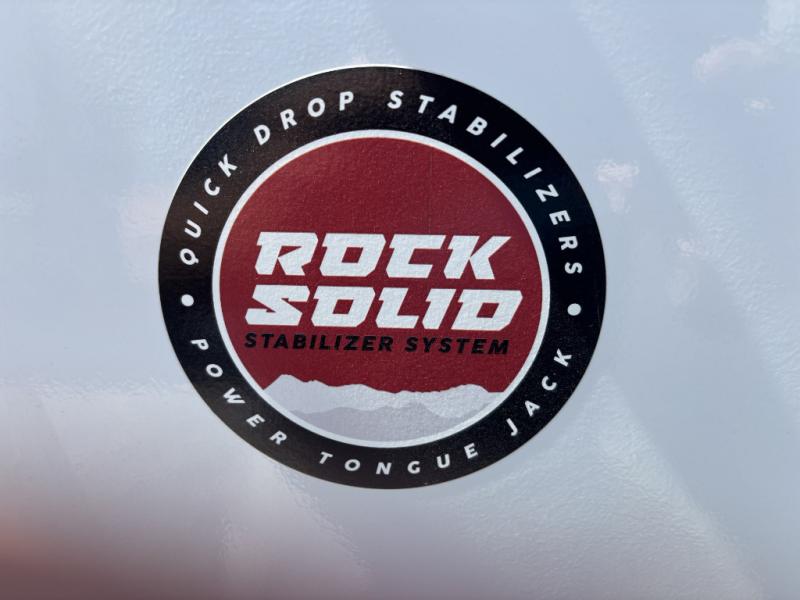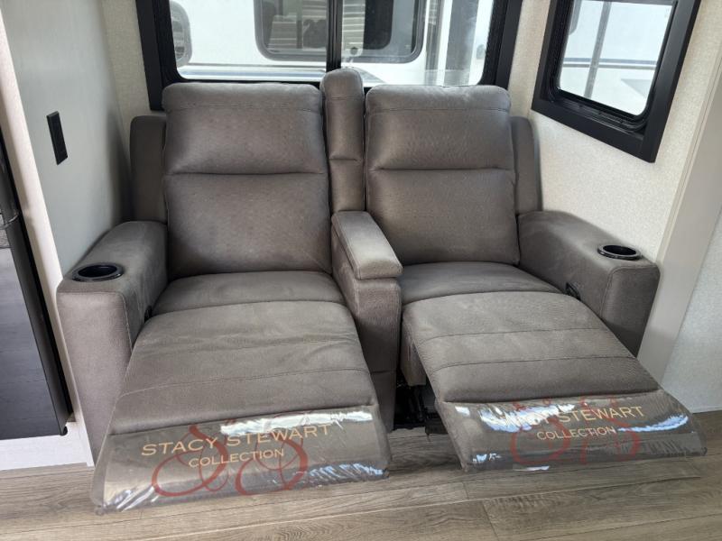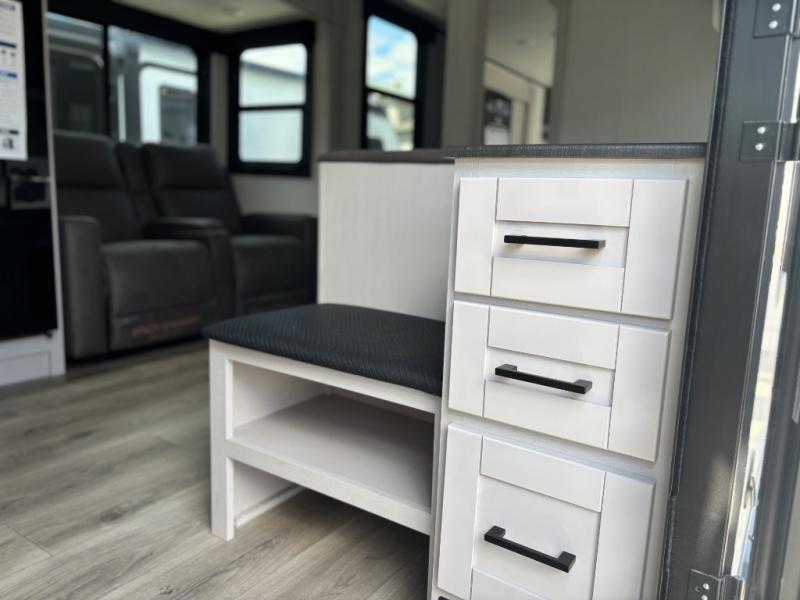 The chef of your group will love this rear kitchen trailer with generous counter space to prep meals! Your crew can dine at the booth dinette or under the 20' power awning with LED lights, and when you're ready to relax, the theater seat with table trays will provide comfort. There is also a storage/desk cabinet with a pull-out ottoman that will allow you to utilize this space however you need it! The spacious full bath will let you clean up each day, and the front private bedroom is sure to make you feel at home. Here, you'll find a queen bed, three wardrobes, plus one of the dual entry doors for added convenience!