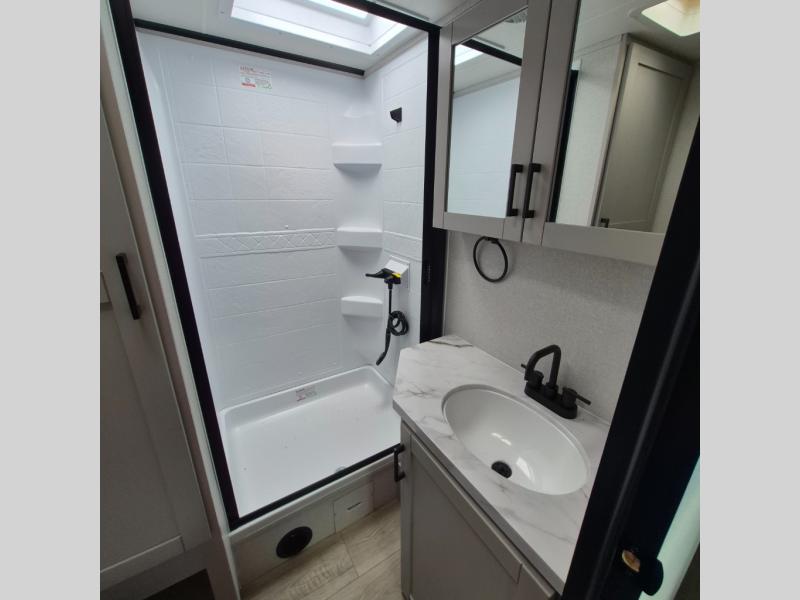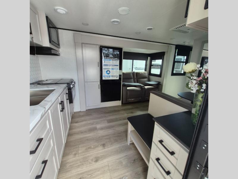 With any Jay Feather travel trailer by Jayco, you will enjoy lightweight towing, convenient exterior amenities, and at-home comforts inside! The Overlander 1 Solar Package included within the Jay Sport Package comes with a 200W solar panel and a 30-amp digital controller so you can enjoy some off-grid camping. There is also a modern graphics package with a dual-colored sidewall, LCI Solid Step fold-down aluminum tread steps on the main entry door, and Climate Shield 0 -100° F tested weather insulation package that will allow you to camp in all sorts of climates. The Customer Value Package will make time outdoors easier than ever with a power tongue jack and a Rock Solid stabilizer system, plus American-made nitro-filled Goodyear tires with self-adjusting electric brakes. More exterior features include a Keyed-Alike locking system, marine grade exterior speakers, a Magnum Truss roof system, and the list goes on! And we haven't even touched on the interior comforts, like the residential style seamless countertops and vinyl flooring throughout, decorative backsplash, handcrafted hardwood door/drawer fronts, and multiple USB charging ports to keep you going!