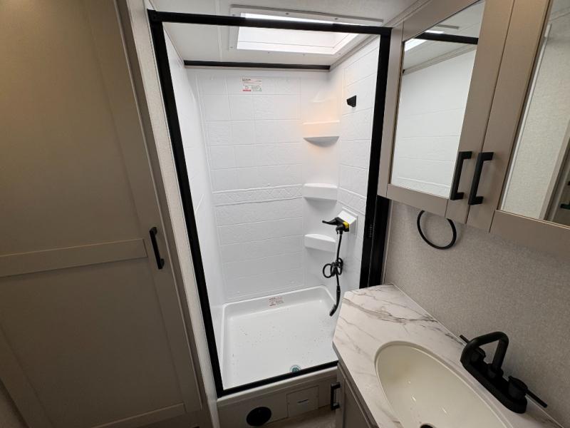 With any Jay Feather travel trailer by Jayco, you will enjoy lightweight towing, convenient exterior amenities, and at-home comforts inside! The Overlander 1 Solar Package included within the Jay Sport Package comes with a 200W solar panel and a 30-amp digital controller so you can enjoy some off-grid camping. There is also a modern graphics package with a dual-colored sidewall, LCI Solid Step fold-down aluminum tread steps on the main entry door, and Climate Shield 0 -100° F tested weather insulation package that will allow you to camp in all sorts of climates. The Customer Value Package will make time outdoors easier than ever with a power tongue jack and a Rock Solid stabilizer system, plus American-made nitro-filled Goodyear tires with self-adjusting electric brakes. More exterior features include a Keyed-Alike locking system, marine grade exterior speakers, a Magnum Truss roof system, and the list goes on! And we haven't even touched on the interior comforts, like the residential style seamless countertops and vinyl flooring throughout, decorative backsplash, handcrafted hardwood door/drawer fronts, and multiple USB charging ports to keep you going!