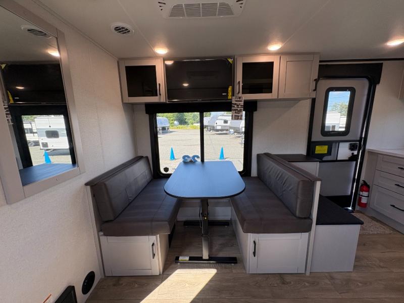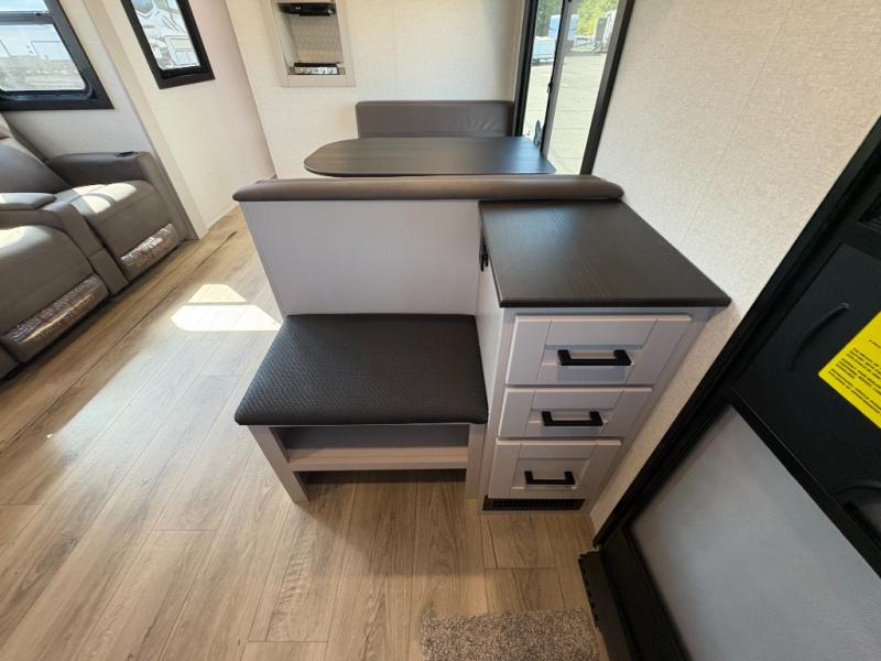 The chef of your group will love this rear kitchen trailer with generous counter space to prep meals! Your crew can dine at the booth dinette or under the 20' power awning with LED lights, and when you're ready to relax, the theater seat with table trays will provide comfort. There is also a storage/desk cabinet with a pull-out ottoman that will allow you to utilize this space however you need it! The spacious full bath will let you clean up each day, and the front private bedroom is sure to make you feel at home. Here, you'll find a queen bed, three wardrobes, plus one of the dual entry doors for added convenience!