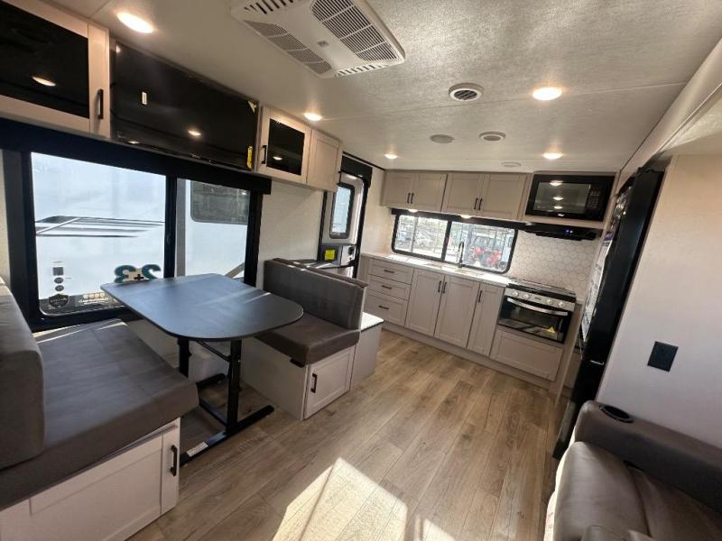 The chef of your group will love this rear kitchen trailer with generous counter space to prep meals! Your crew can dine at the booth dinette or under the 20' power awning with LED lights, and when you're ready to relax, the theater seat with table trays will provide comfort. There is also a storage/desk cabinet with a pull-out ottoman that will allow you to utilize this space however you need it! The spacious full bath will let you clean up each day, and the front private bedroom is sure to make you feel at home. Here, you'll find a queen bed, three wardrobes, plus one of the dual entry doors for added convenience!