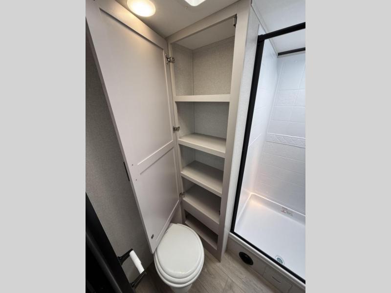 The chef of your group will love this rear kitchen trailer with generous counter space to prep meals! Your crew can dine at the booth dinette or under the 20' power awning with LED lights, and when you're ready to relax, the theater seat will provide comfort. There is also a storage cabinet with a bench that will allow you to utilize this space however you need it! The spacious full bath will let you clean up each day, and the front private bedroom is sure to make you feel at home. Here, you'll find a queen bed, three wardrobes, plus one of the dual entry doors for added convenience!