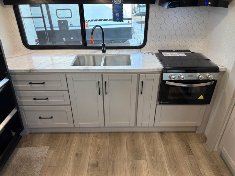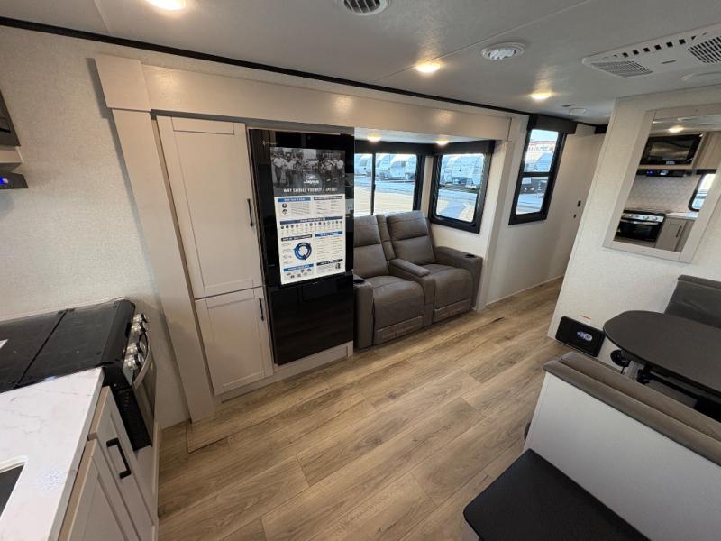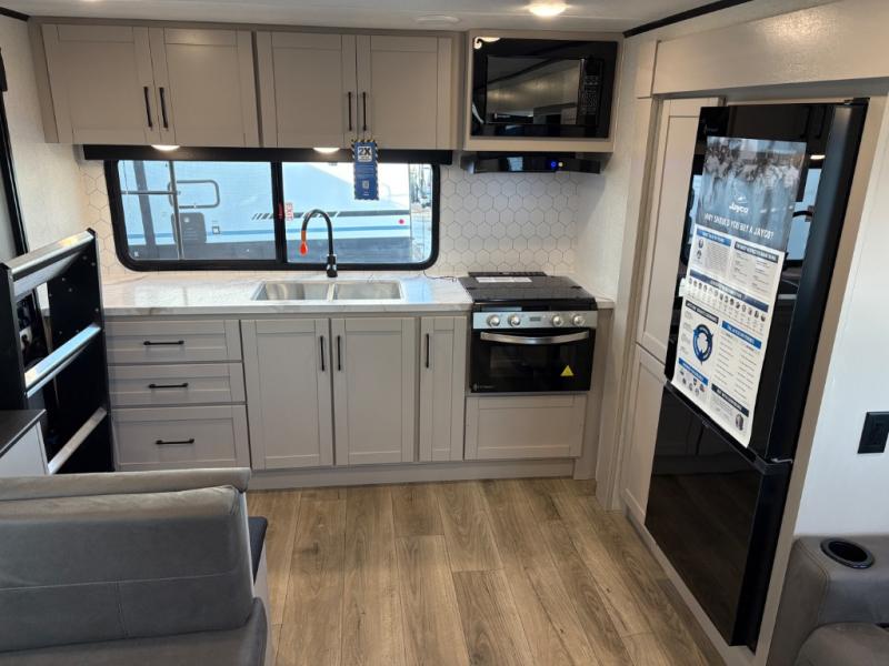 With any Jay Feather travel trailer by Jayco, you will enjoy lightweight towing, convenient exterior amenities, and at-home comforts inside! The Overlander 1 Solar Package included within the Jay Sport Package comes with a 200W solar panel and a 30-amp digital controller so you can enjoy some off-grid camping. There is also a modern graphics package, Solid fold-down step with aluminum tread steps on the main entry doorstep, and Climate Shield 0 -100° F tested weather insulation package that will allow you to camp in various types of climates. The Customer Value Package will make time outdoors easier than ever with a power tongue jack and Automotive-style aluminum rims, plus radial tires with self-adjusting electric brakes. More exterior features include a Keyed-Alike doors, a Magnum Truss roof system, and the list goes on! And we haven't even touched on the interior comforts, like the seamless countertops and Residential vinyl flooring throughout, decorative kitchen backsplash, handcrafted hardwood door/drawer fronts, and multiple USB charging ports to keep you going!