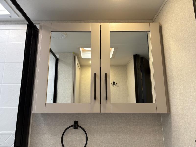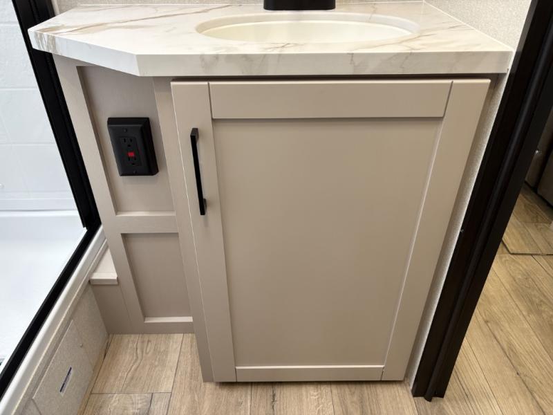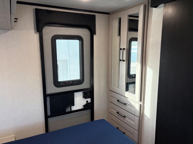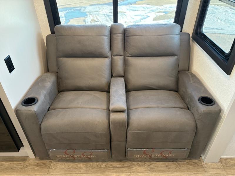The chef of your group will love this rear kitchen trailer with generous counter space to prep meals! Your crew can dine at the booth dinette or under the 20' power awning with LED lights, and when you're ready to relax, the theater seat will provide comfort. There is also a storage cabinet with a bench that will allow you to utilize this space however you need it! The spacious full bath will let you clean up each day, and the front private bedroom is sure to make you feel at home. Here, you'll find a queen bed, three wardrobes, plus one of the dual entry doors for added convenience!
