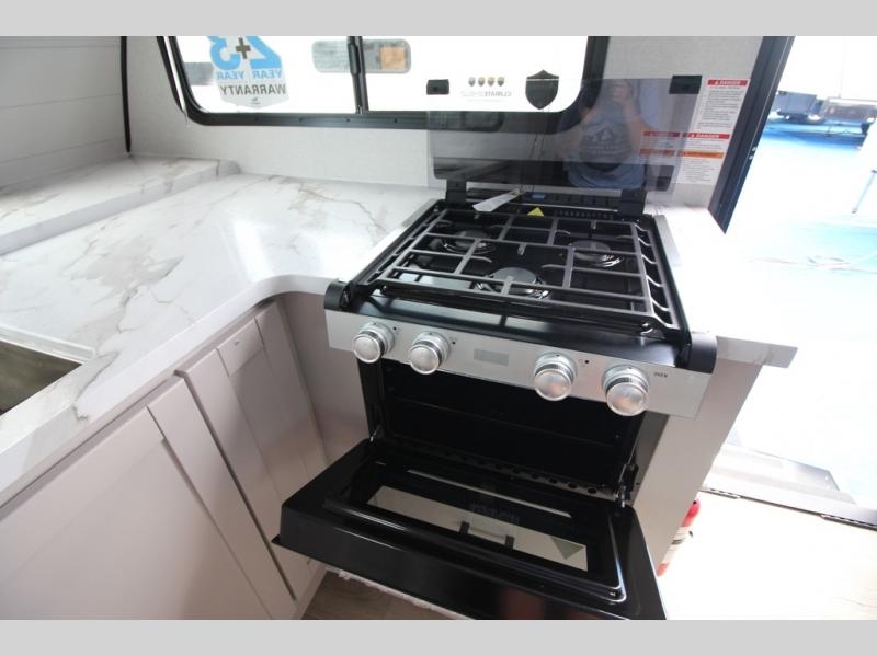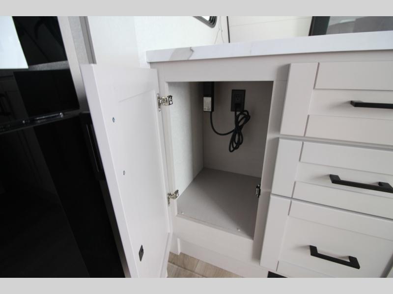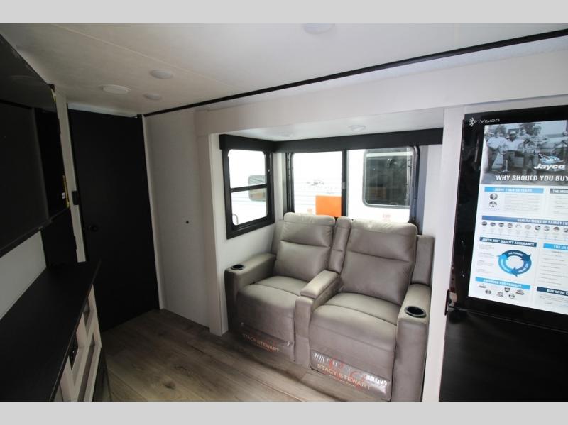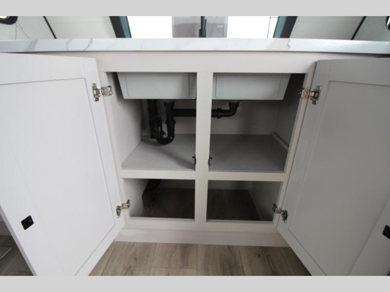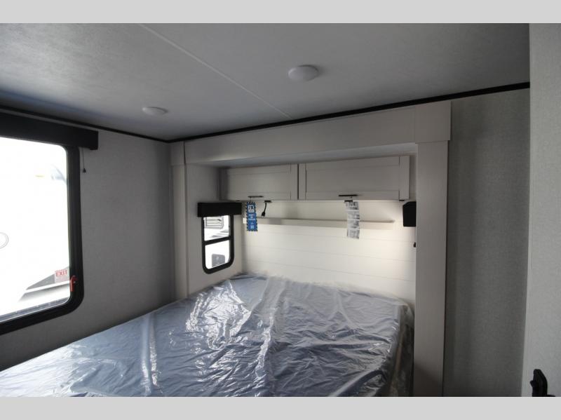 Step inside this spacious travel trailer through the front entry and you find the front kitchen that spans the width of the unit, providing plenty of counter space for meal prep. The kitchen is fully equipped with a stainless-steel sink, a decorative backsplash, a 3-burner cooktop, and an 11-cu. ft. 12V refrigerator, perfect for storing all your groceries. Overhead shelves offer convenient storage, and a pantry adds extra space for essentials. Next to the kitchen, you’ll find 60" theater seating, ideal for enjoying meals or watching your favorite shows on the LED Smart TV. As you move down the hall, you’ll come to a full bathroom featuring a radius shower and two entry doors for easy access. At the rear of the trailer, the comfortable bedroom features a 60" x 80" Queen bed, a sliding mirror door closet for added storage, and a second entry door to the exterior.