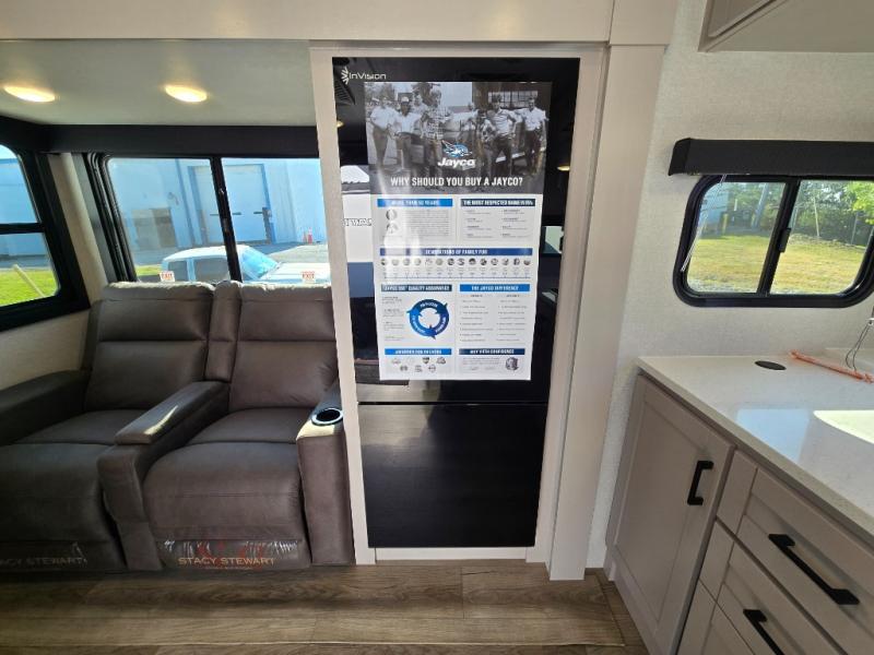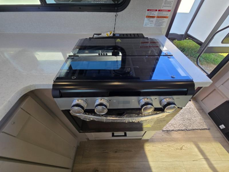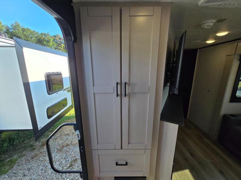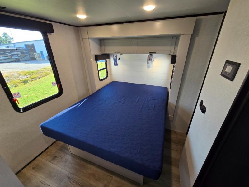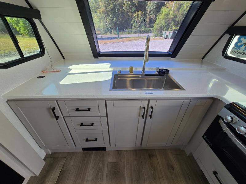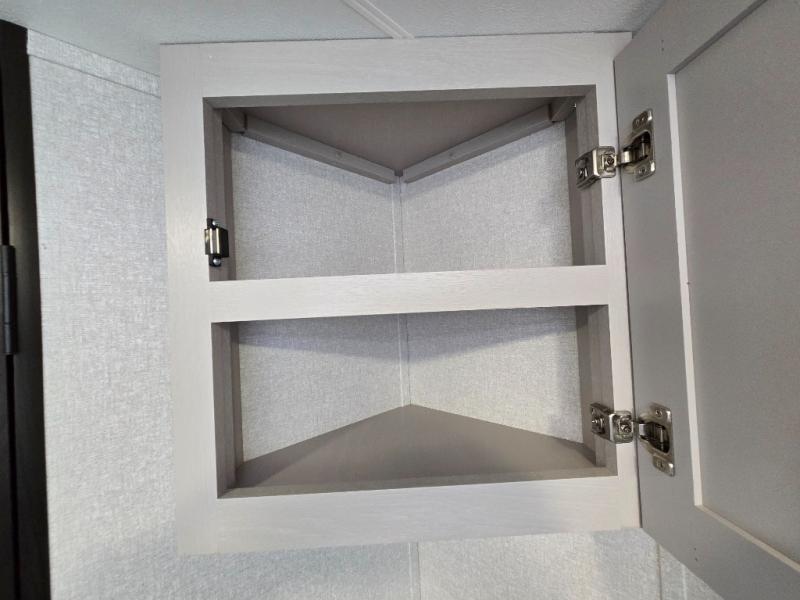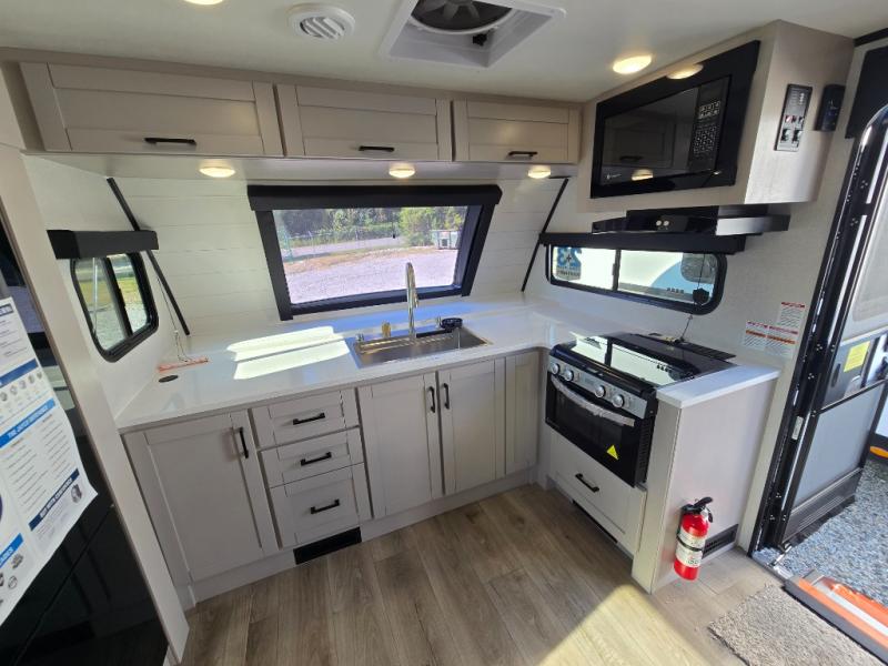 Step inside the Jay Feather 24FK and experience a travel trailer designed for comfort and convenience. The front kitchen stretches across the width of the unit, offering abundant counter space, a stainless-steel sink, a decorative backsplash, a three-burner cooktop, and an 11-cu. ft. 12V refrigerator — everything you need to cook up your favorite meals. There’s even a pantry and overhead shelving for all your kitchen essentials.