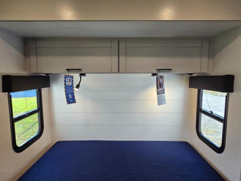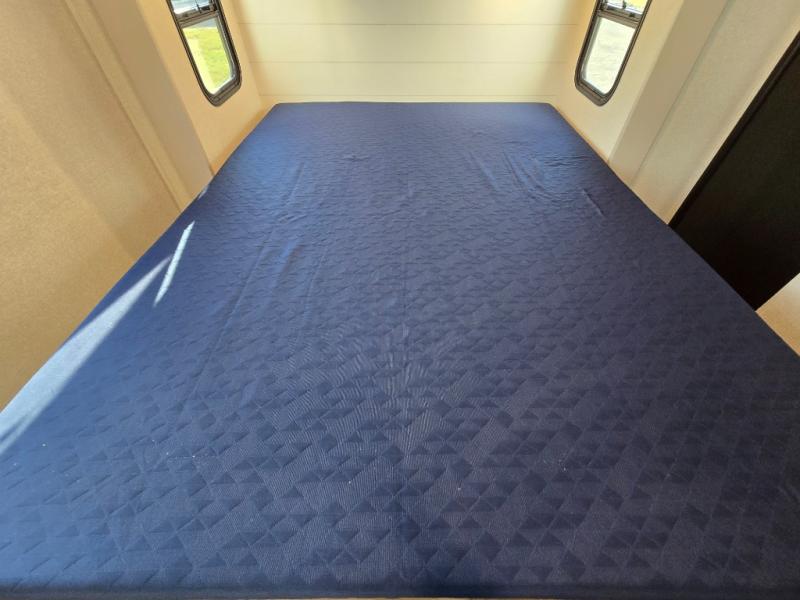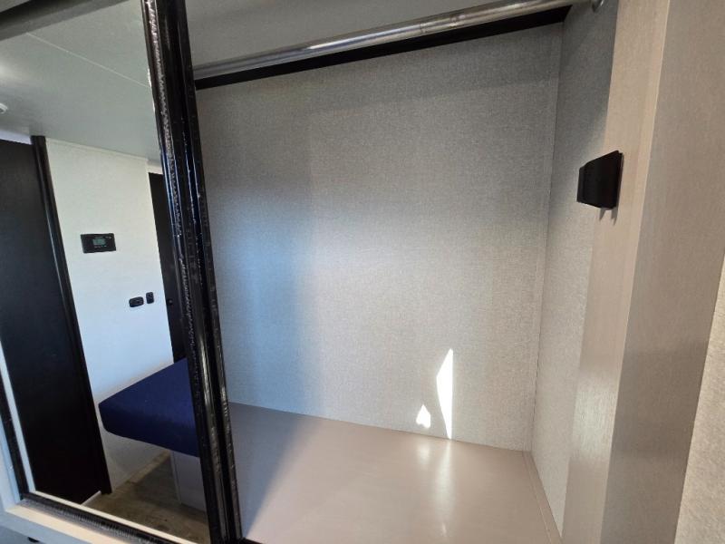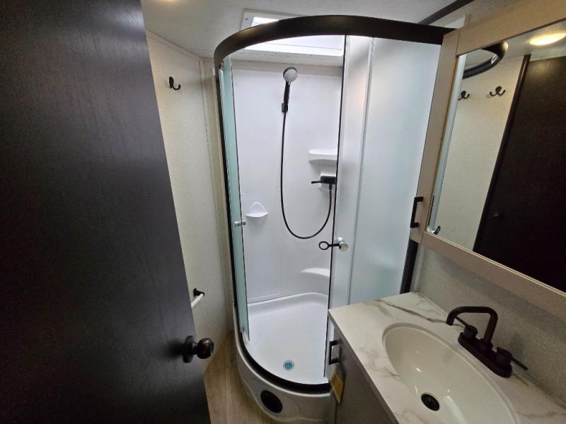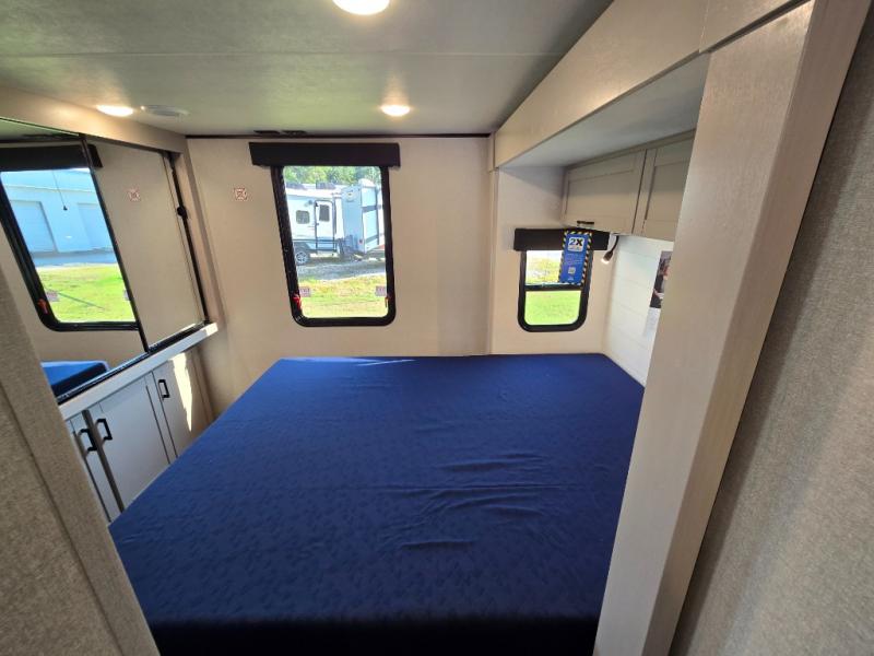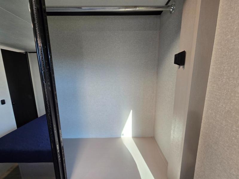 At the rear, the private bedroom provides a peaceful retreat with a 60" x 80" queen bed, a sliding mirror door closet, and its own exterior entry door, making it easy to access directly from outside.
