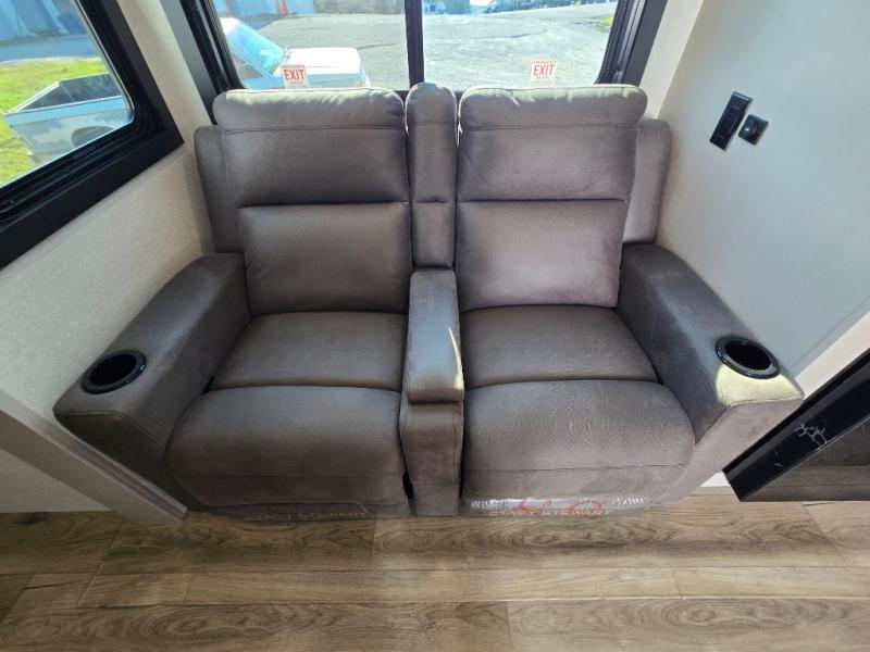 Adjacent to the kitchen is the 60" theater seating, perfectly positioned for relaxing and watching the LED Smart TV. Down the hall, a full bathroom awaits, featuring a radius shower and dual entry doors for added convenience.