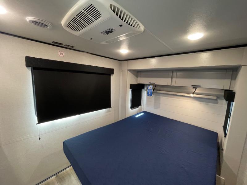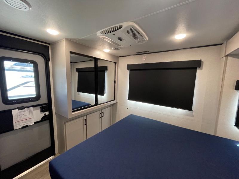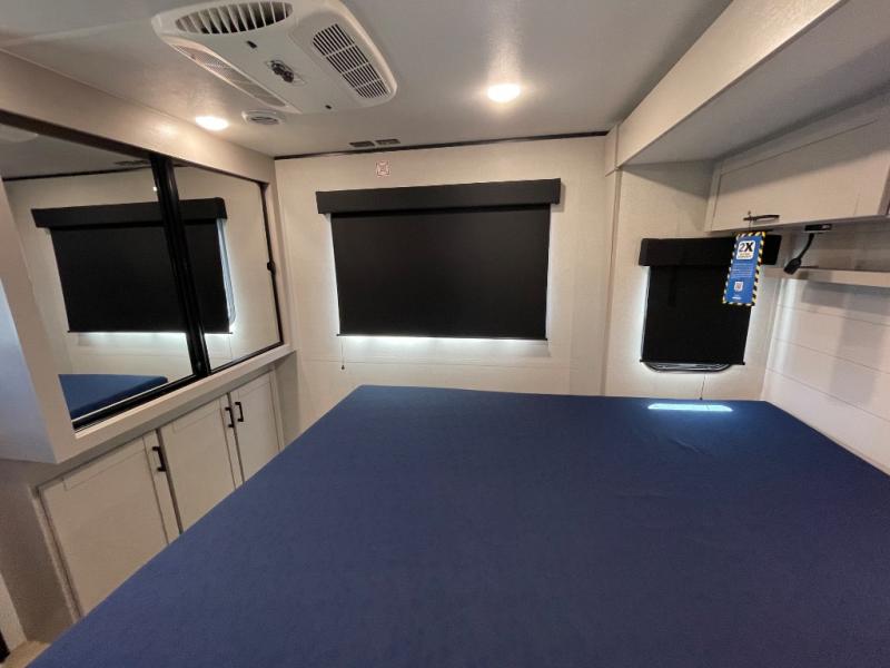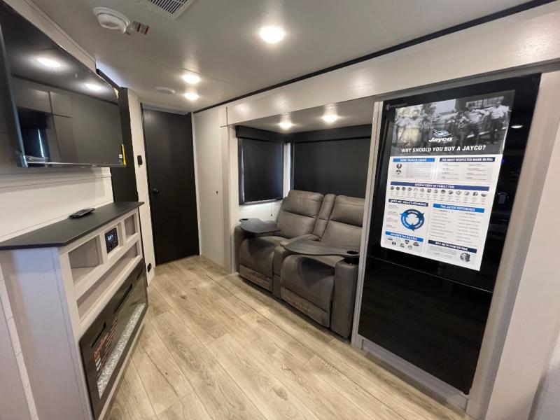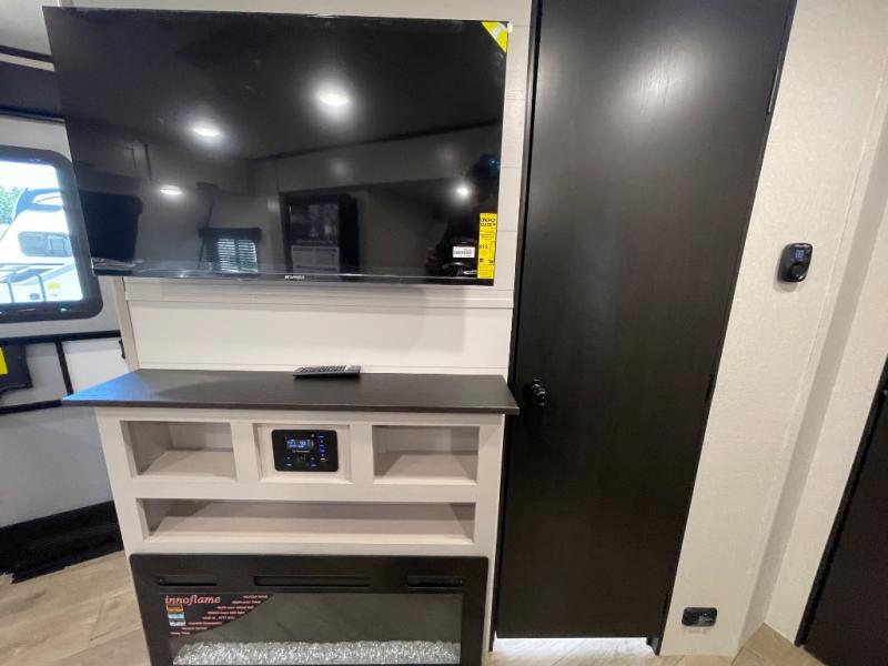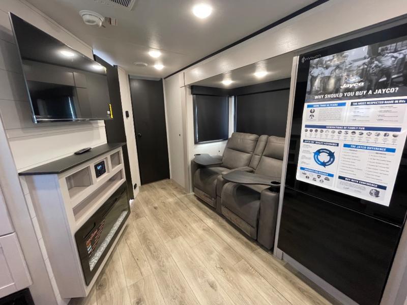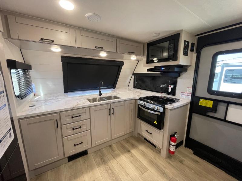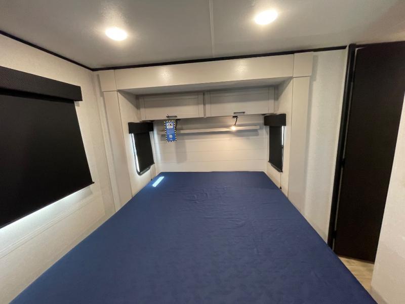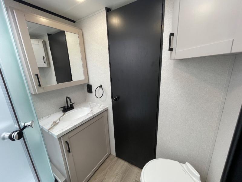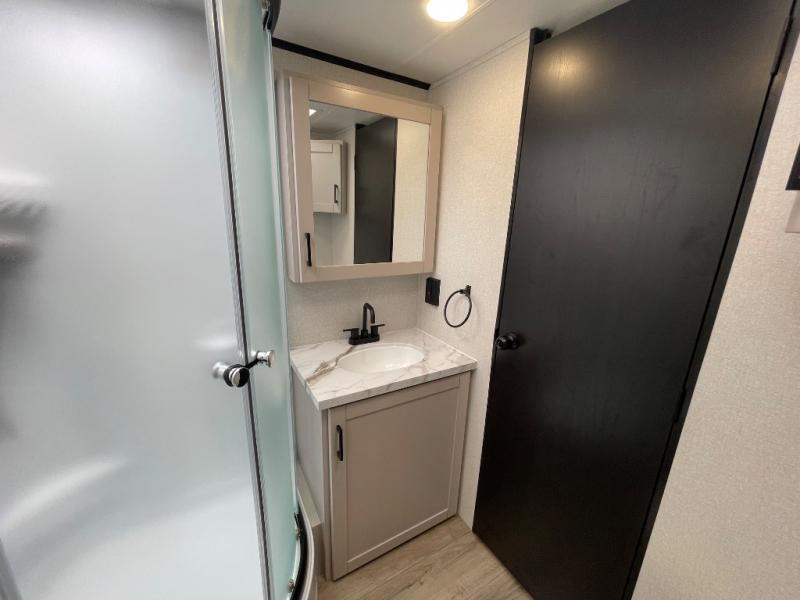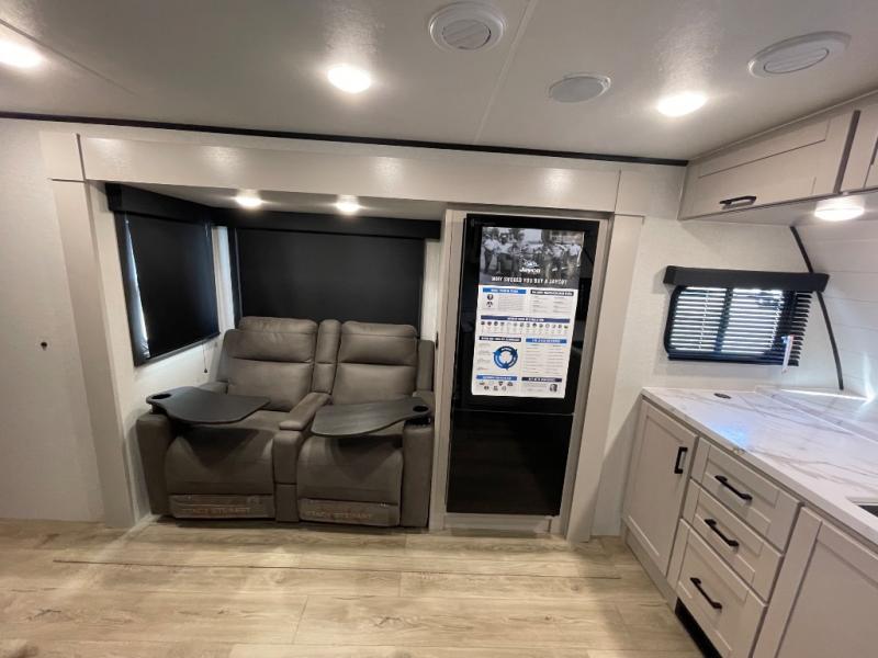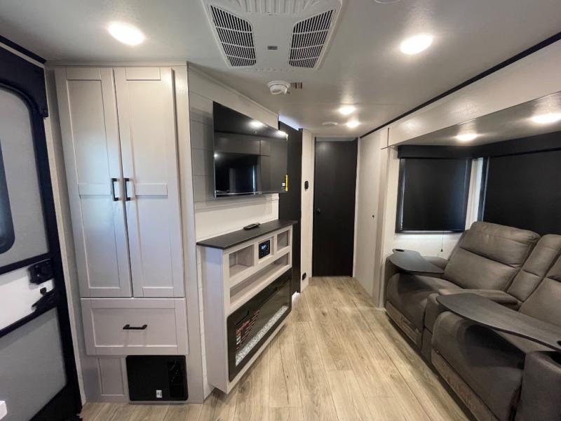 Step inside this spacious travel trailer through the front entry and you find the front kitchen that spans the width of the unit, providing plenty of counter space for meal prep. The kitchen is fully equipped with a stainless-steel sink, a decorative backsplash, a 3-burner cooktop, and an 11-cu. ft. 12V refrigerator, perfect for storing all your groceries. Overhead shelves offer convenient storage, and a pantry adds extra space for essentials. Next to the kitchen, you’ll find 60" theater seating, ideal for enjoying meals or watching your favorite shows on the LED Smart TV. As you move down the hall, you’ll come to a full bathroom featuring a radius shower and two entry doors for easy access. At the rear of the trailer, the comfortable bedroom features a 60" x 80" Queen bed, a sliding mirror door closet for added storage, and a second entry door to the exterior.