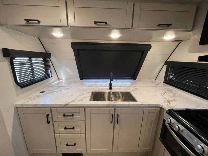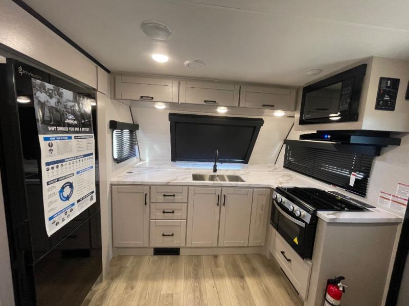 With any Jay Feather travel trailer by Jayco, you will enjoy lightweight towing, convenient exterior amenities, and at-home comforts inside! The Overlander 1 Solar Package included within the Jay Sport Package comes with a 200W solar panel and a 30-amp digital controller so you can enjoy some off-grid camping. There is also a modern graphics package, Solid fold-down step with aluminum tread steps on the main entry doorstep, and Climate Shield 0 -100° F tested weather insulation package that will allow you to camp in various types of climates. The Customer Value Package will make time outdoors easier than ever with a power tongue jack and Automotive-style aluminum rims, plus radial tires with self-adjusting electric brakes. More exterior features include a Keyed-Alike doors, a Magnum Truss roof system, and the list goes on! And we haven't even touched on the interior comforts, like the seamless countertops and Residential vinyl flooring throughout, decorative kitchen backsplash, handcrafted hardwood door/drawer fronts, and multiple USB charging ports to keep you going!