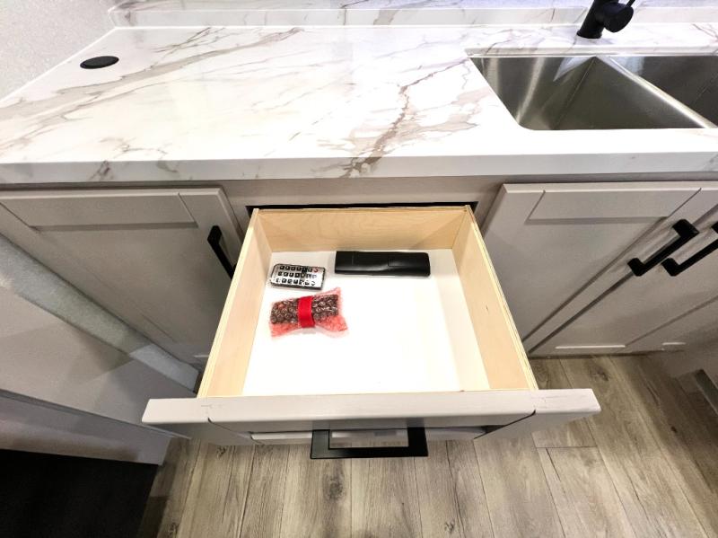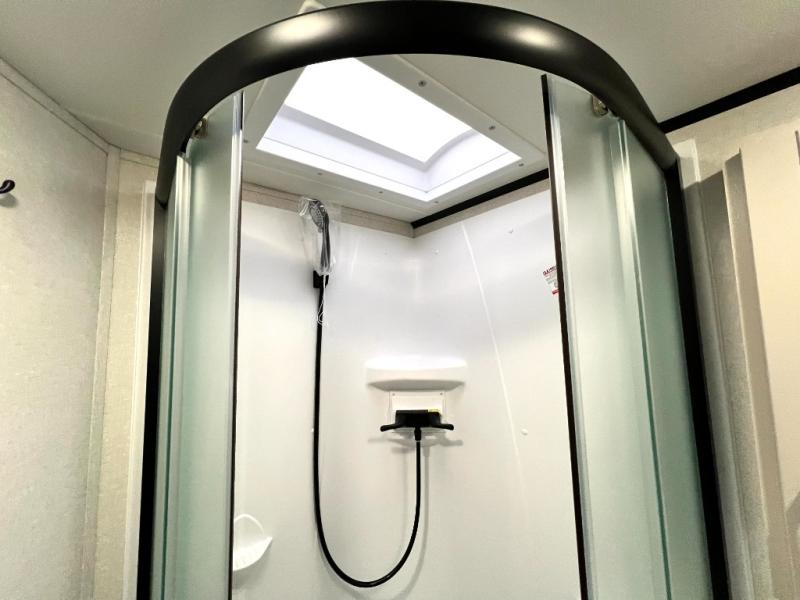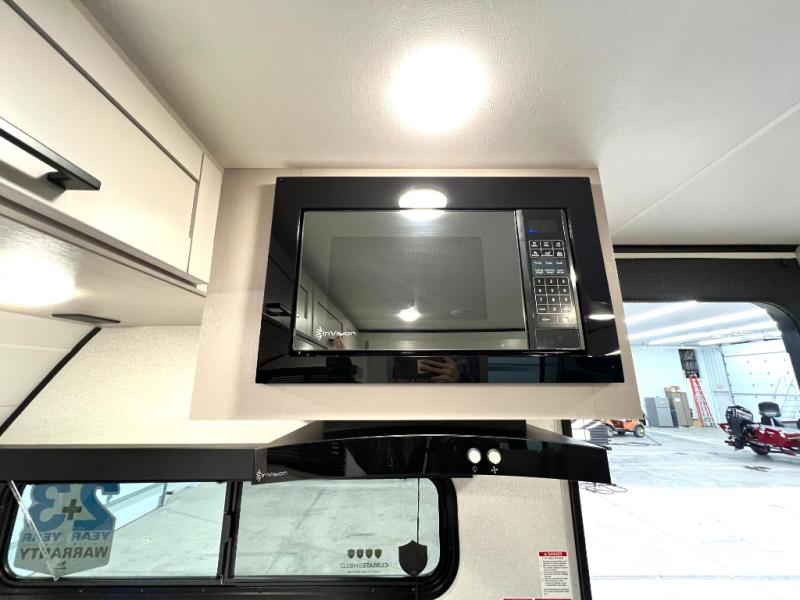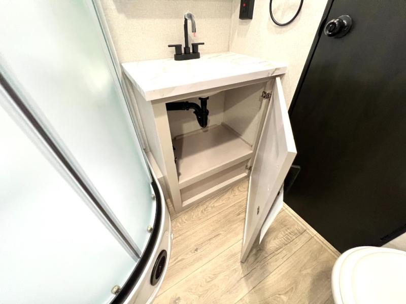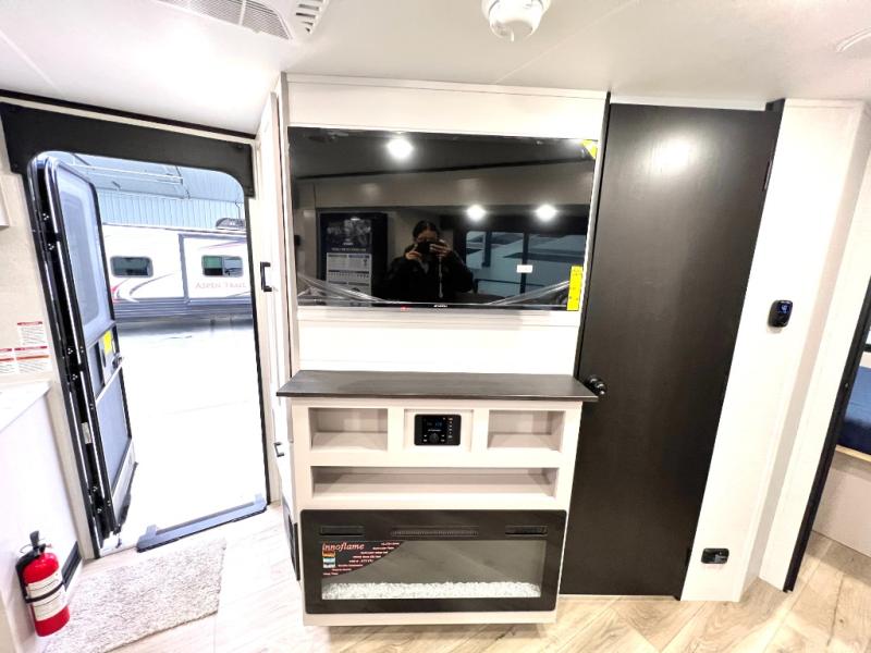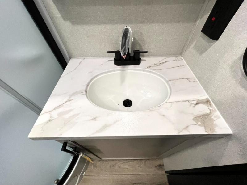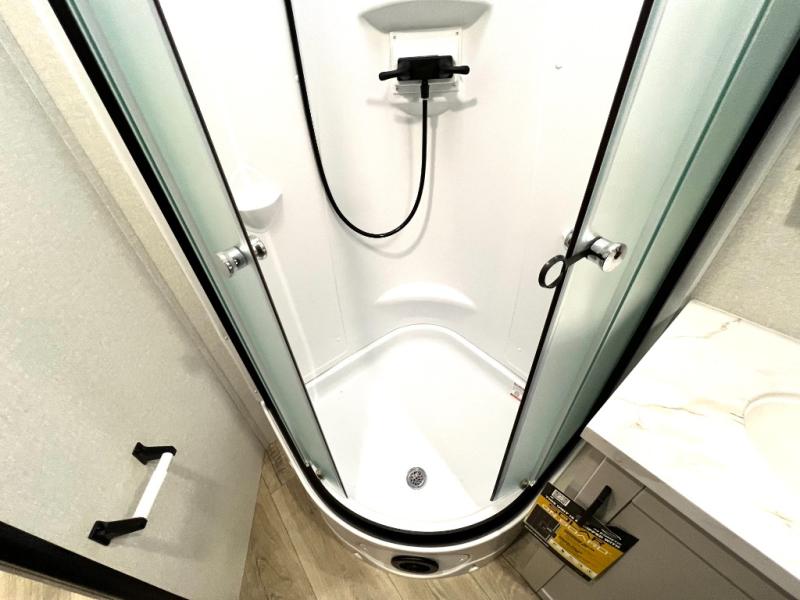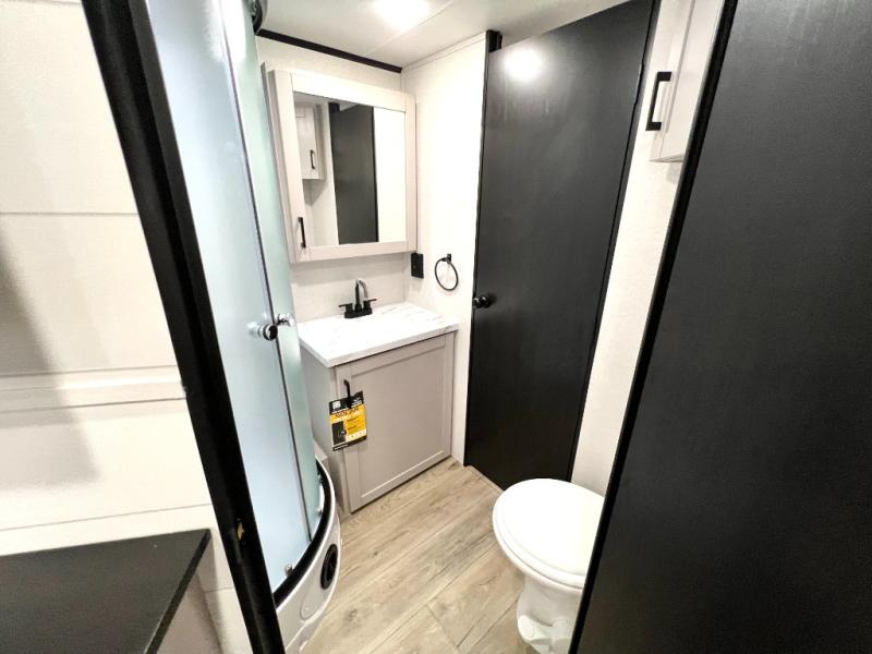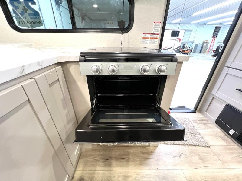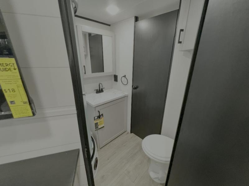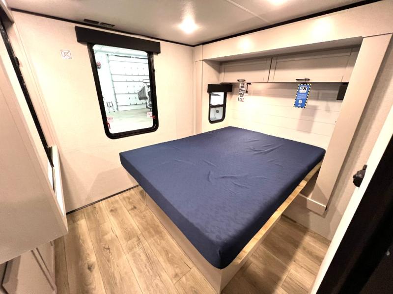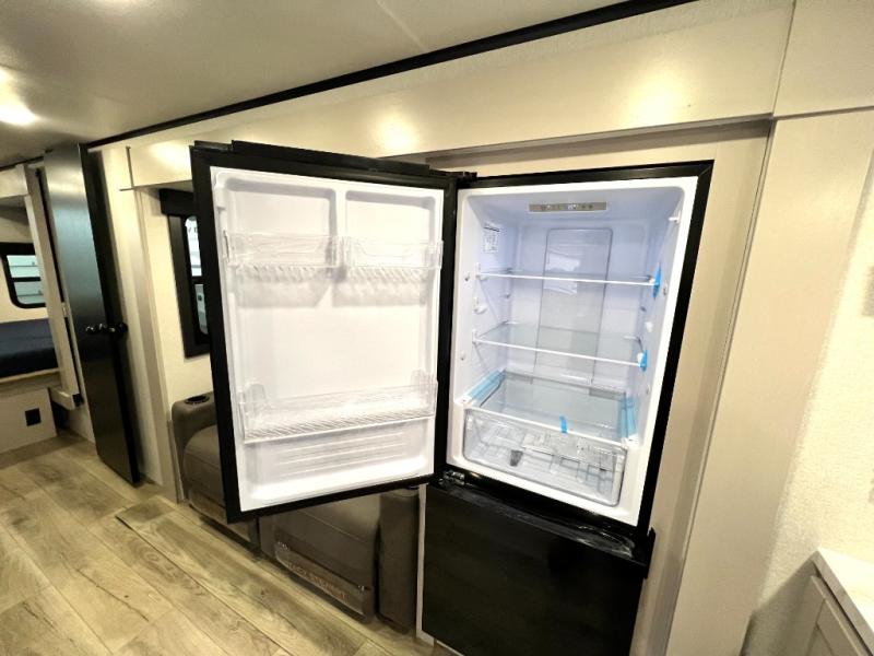 Step inside this spacious travel trailer through the front entry and you find the front kitchen that spans the width of the unit, providing plenty of counter space for meal prep. The kitchen is fully equipped with a stainless-steel sink, a decorative backsplash, a 3-burner cooktop, and an 11-cu. ft. 12V refrigerator, perfect for storing all your groceries. Overhead shelves offer convenient storage, and a pantry adds extra space for essentials. Next to the kitchen, you’ll find 60" theater seating, ideal for enjoying meals or watching your favorite shows on the LED Smart TV. As you move down the hall, you’ll come to a full bathroom featuring a radius shower and two entry doors for easy access. At the rear of the trailer, the comfortable bedroom features a 60" x 80" Queen bed, a sliding mirror door closet for added storage, and a second entry door to the exterior.