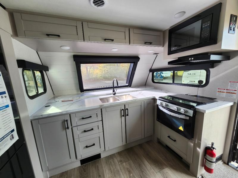 With any Jay Feather travel trailer by Jayco, you will enjoy lightweight towing, convenient exterior amenities, and at-home comforts inside! The Overlander 1 Solar Package included within the Jay Sport Package comes with a 200W solar panel and a 30-amp digital controller so you can enjoy some off-grid camping. There is also a modern graphics package, Solid fold-down step with aluminum tread steps on the main entry doorstep, and Climate Shield 0 -100° F tested weather insulation package that will allow you to camp in various types of climates. The Customer Value Package will make time outdoors easier than ever with a power tongue jack and Automotive-style aluminum rims, plus radial tires with self-adjusting electric brakes. More exterior features include a Keyed-Alike doors, a Magnum Truss roof system, and the list goes on! And we haven't even touched on the interior comforts, like the seamless countertops and Residential vinyl flooring throughout, decorative kitchen backsplash, handcrafted hardwood door/drawer fronts, and multiple USB charging ports to keep you going!