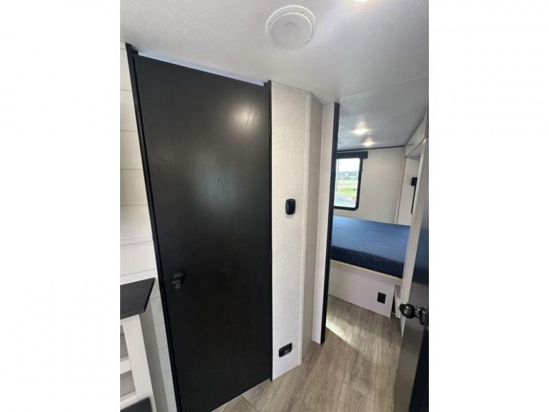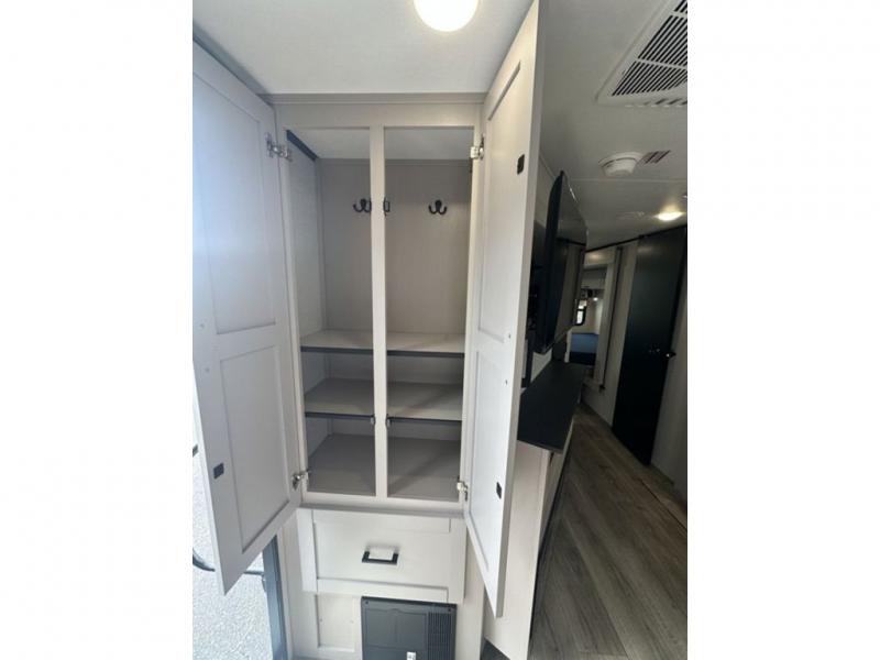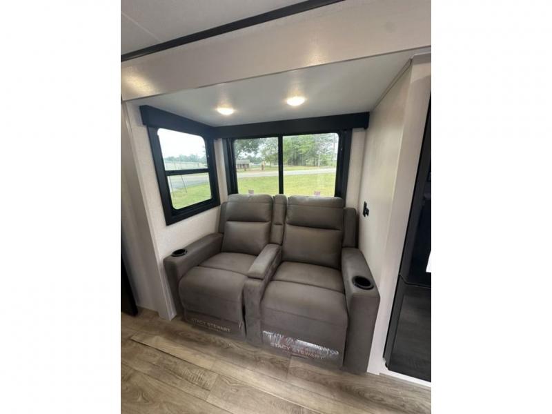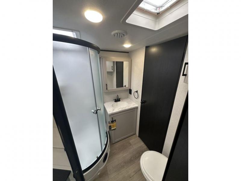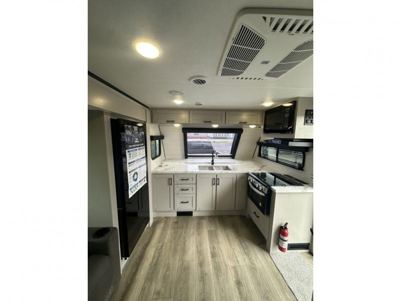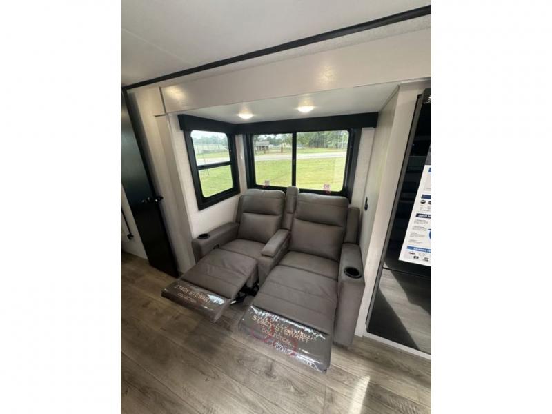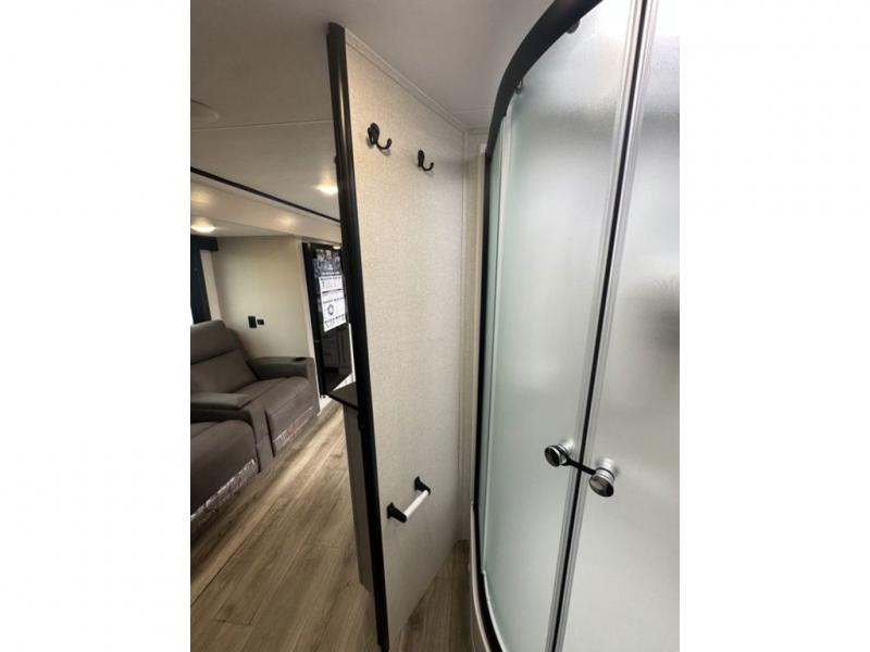 Step inside this spacious travel trailer through the front entry and you find the front kitchen that spans the width of the unit, providing plenty of counter space for meal prep. The kitchen is fully equipped with a stainless-steel sink, a decorative backsplash, a 3-burner cooktop, and an 11-cu. ft. 12V refrigerator, perfect for storing all your groceries. Overhead shelves offer convenient storage, and a pantry adds extra space for essentials. Next to the kitchen, you’ll find 60" theater seating, ideal for enjoying meals or watching your favorite shows on the LED Smart TV. As you move down the hall, you’ll come to a full bathroom featuring a radius shower and two entry doors for easy access. At the rear of the trailer, the comfortable bedroom features a 60" x 80" Queen bed, a sliding mirror door closet for added storage, and a second entry door to the exterior.