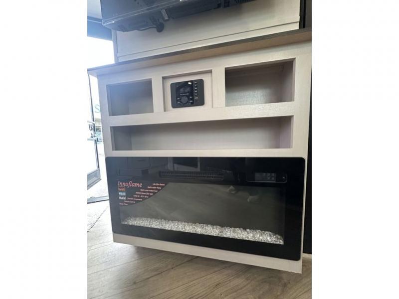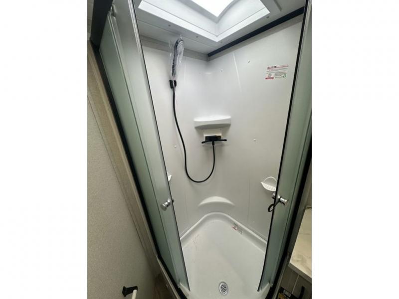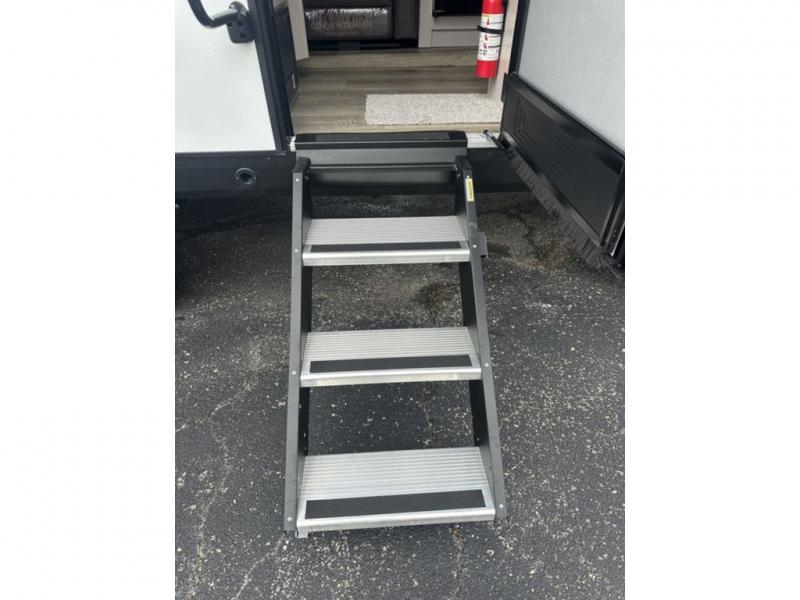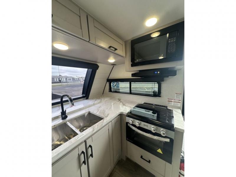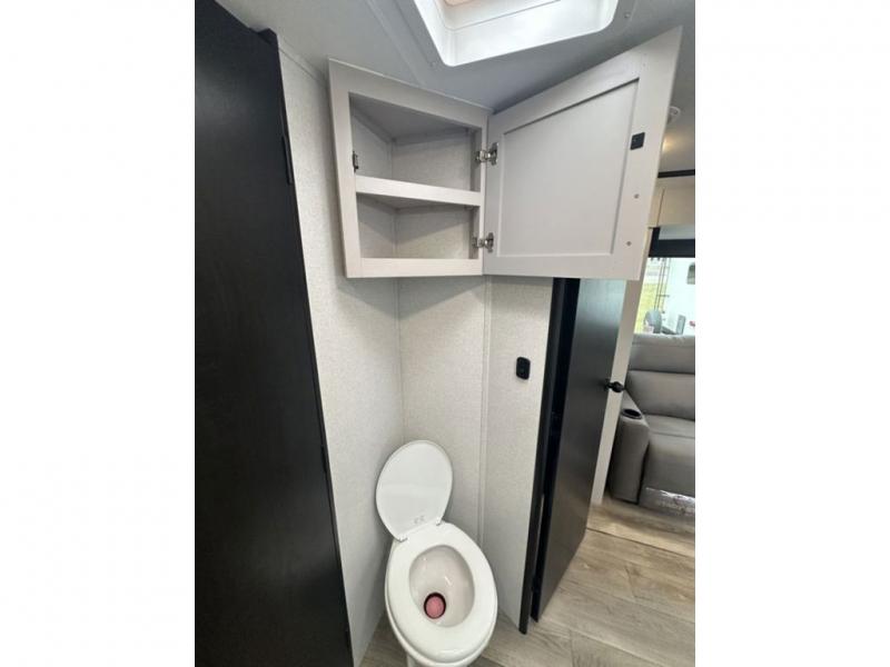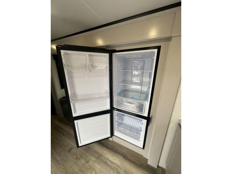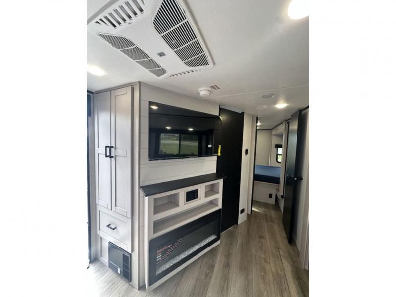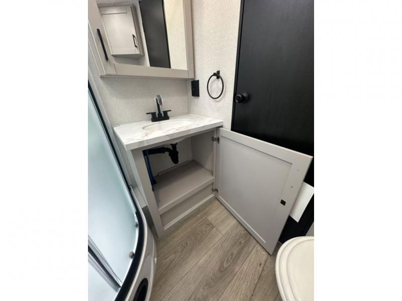 Step inside this spacious travel trailer through the front entry and you find the front kitchen that spans the width of the unit, providing plenty of counter space for meal prep. The kitchen is fully equipped with a stainless-steel sink, a decorative backsplash, a 3-burner cooktop, and an 11-cu. ft. 12V refrigerator, perfect for storing all your groceries. Overhead shelves offer convenient storage, and a pantry adds extra space for essentials. Next to the kitchen, you’ll find 60" theater seating, ideal for enjoying meals or watching your favorite shows on the LED Smart TV. As you move down the hall, you’ll come to a full bathroom featuring a radius shower and two entry doors for easy access. At the rear of the trailer, the comfortable bedroom features a 60" x 80" Queen bed, a sliding mirror door closet for added storage, and a second entry door to the exterior.
