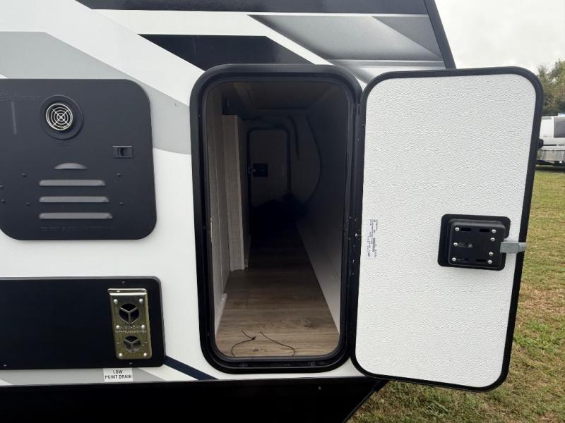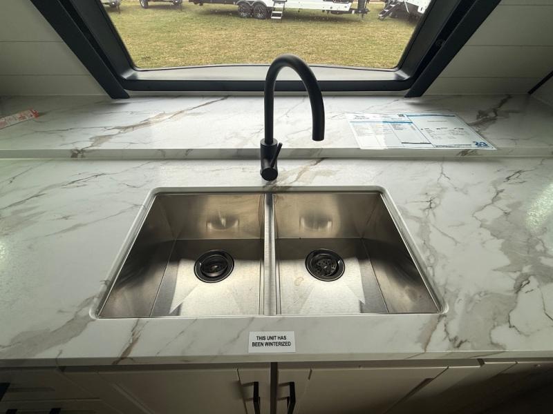 Step inside this spacious travel trailer through the front entry and you find the front kitchen that spans the width of the unit, providing plenty of counter space for meal prep. The kitchen is fully equipped with a stainless-steel sink, a decorative backsplash, a 3-burner cooktop, and an 11-cu. ft. 12V refrigerator, perfect for storing all your groceries. Overhead shelves offer convenient storage, and a pantry adds extra space for essentials. Next to the kitchen, you’ll find 60" theater seating, ideal for enjoying meals or watching your favorite shows on the LED Smart TV. As you move down the hall, you’ll come to a full bathroom featuring a radius shower and two entry doors for easy access. At the rear of the trailer, the comfortable bedroom features a 60" x 80" Queen bed, a sliding mirror door closet for added storage, and a second entry door to the exterior.