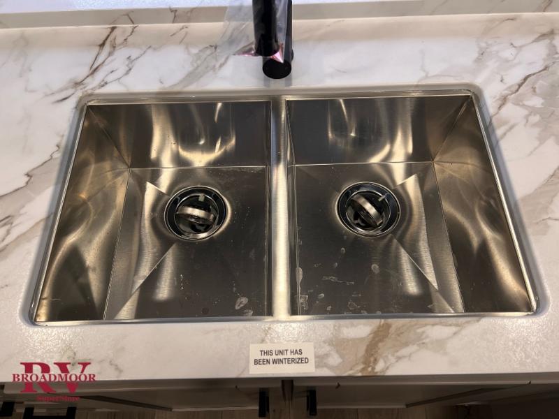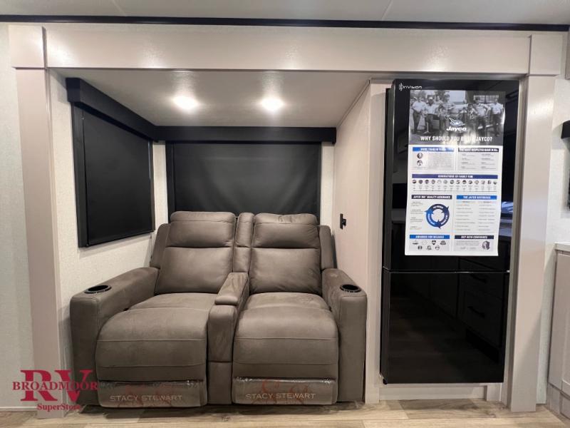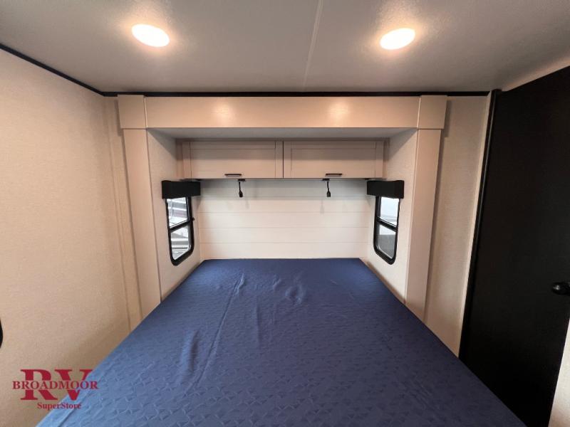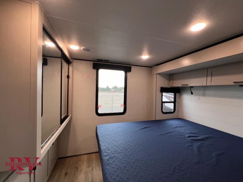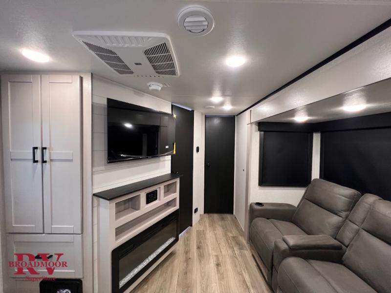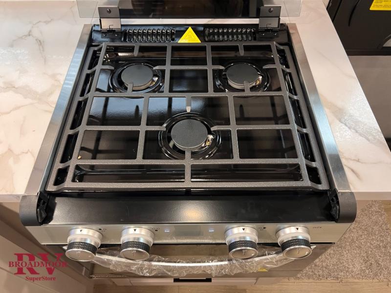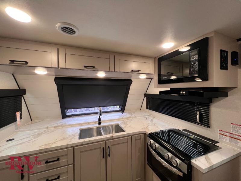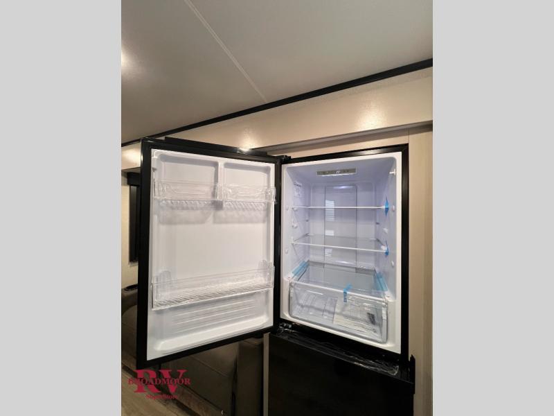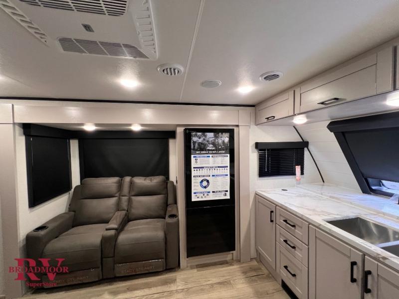 Step inside this spacious travel trailer through the front entry and you find the front kitchen that spans the width of the unit, providing plenty of counter space for meal prep. The kitchen is fully equipped with a stainless-steel sink, a decorative backsplash, a 3-burner cooktop, and an 11-cu. ft. 12V refrigerator, perfect for storing all your groceries. Overhead shelves offer convenient storage, and a pantry adds extra space for essentials. Next to the kitchen, you’ll find 60" theater seating, ideal for enjoying meals or watching your favorite shows on the LED Smart TV. As you move down the hall, you’ll come to a full bathroom featuring a radius shower and two entry doors for easy access. At the rear of the trailer, the comfortable bedroom features a 60" x 80" Queen bed, a sliding mirror door closet for added storage, and a second entry door to the exterior.