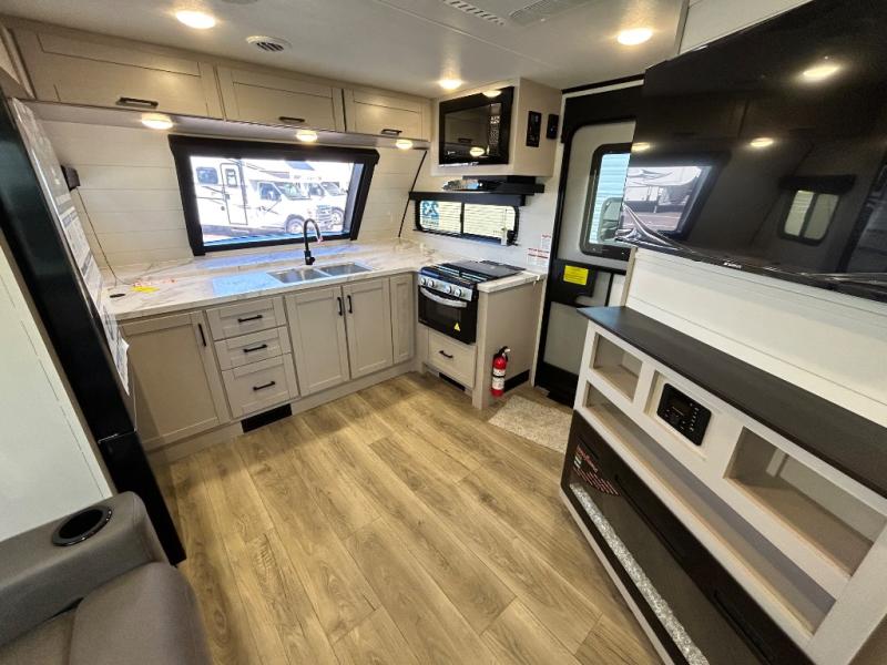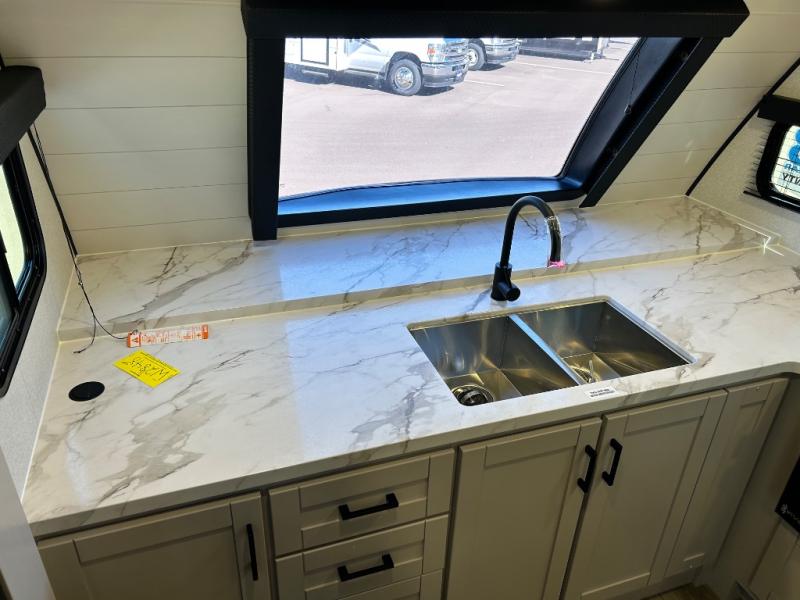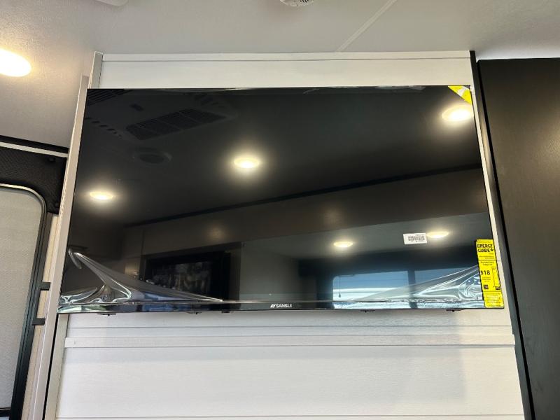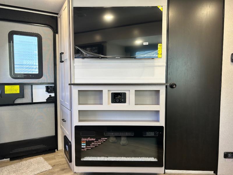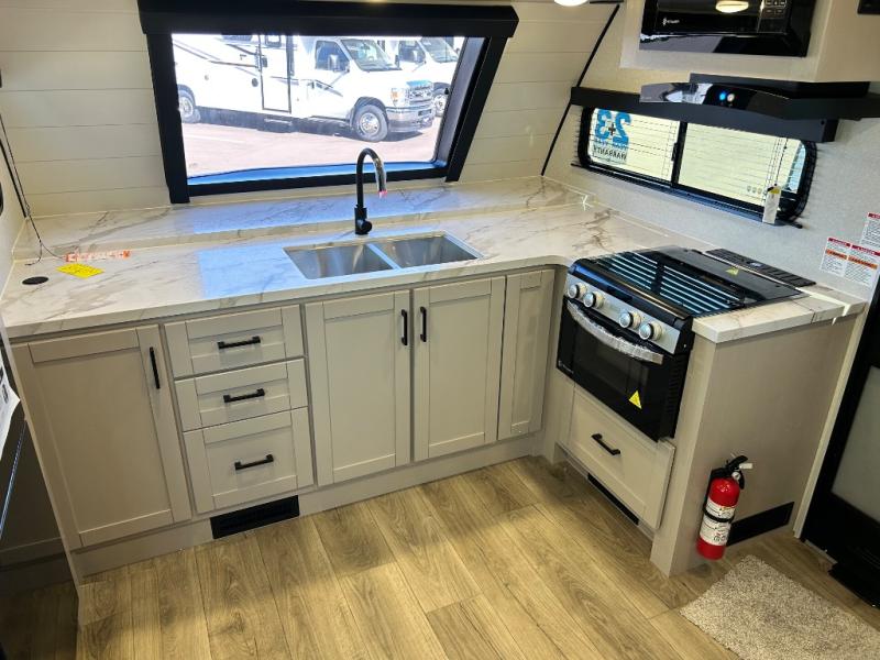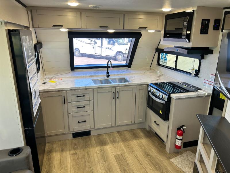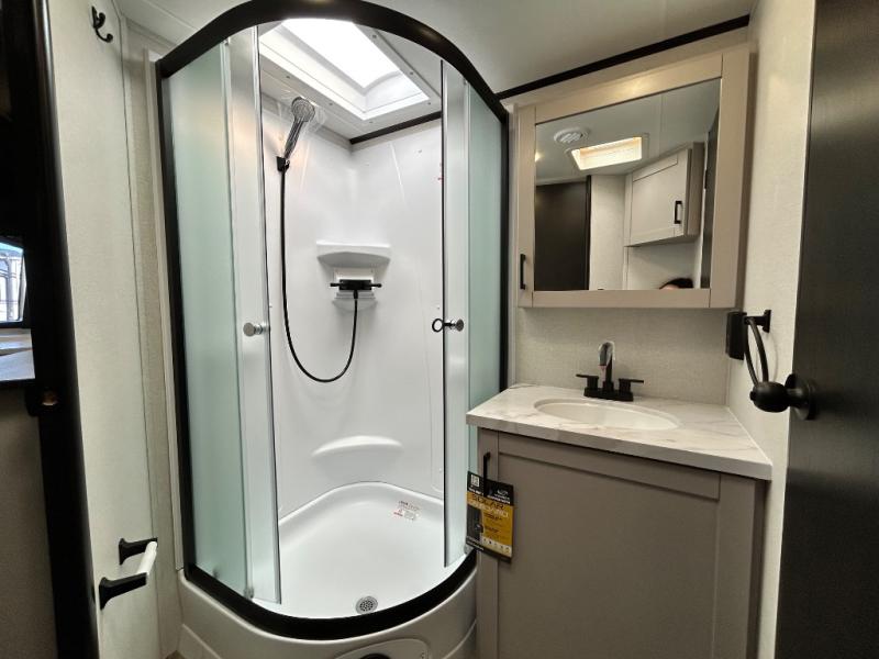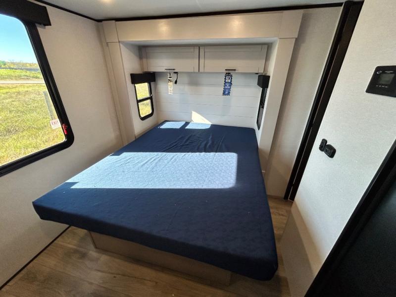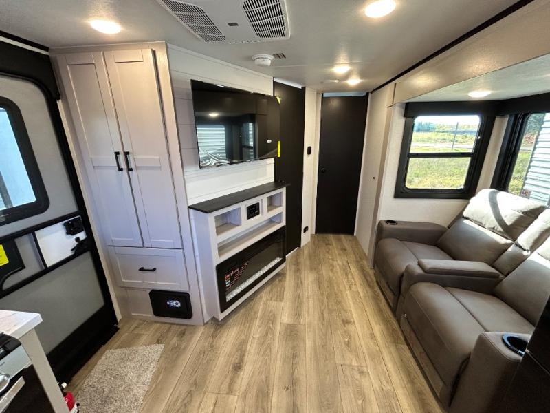 Step inside this spacious travel trailer through the front entry and you find the front kitchen that spans the width of the unit, providing plenty of counter space for meal prep. The kitchen is fully equipped with a stainless-steel sink, a decorative backsplash, a 3-burner cooktop, and an 11-cu. ft. 12V refrigerator, perfect for storing all your groceries. Overhead shelves offer convenient storage, and a pantry adds extra space for essentials. Next to the kitchen, you’ll find 60" theater seating, ideal for enjoying meals or watching your favorite shows on the LED Smart TV. As you move down the hall, you’ll come to a full bathroom featuring a radius shower and two entry doors for easy access. At the rear of the trailer, the comfortable bedroom features a 60" x 80" Queen bed, a sliding mirror door closet for added storage, and a second entry door to the exterior.