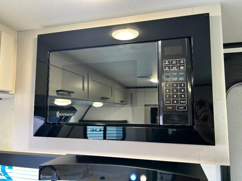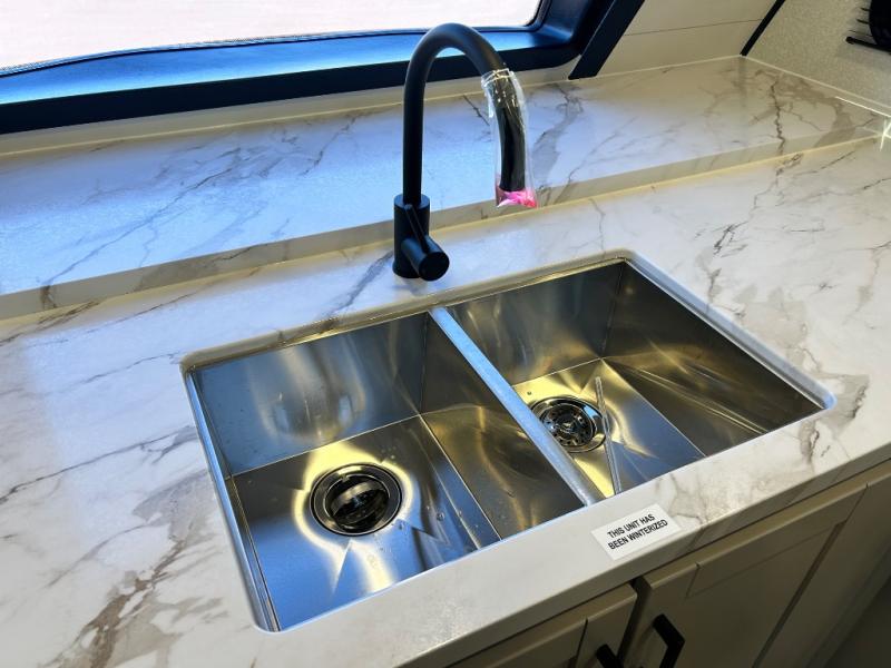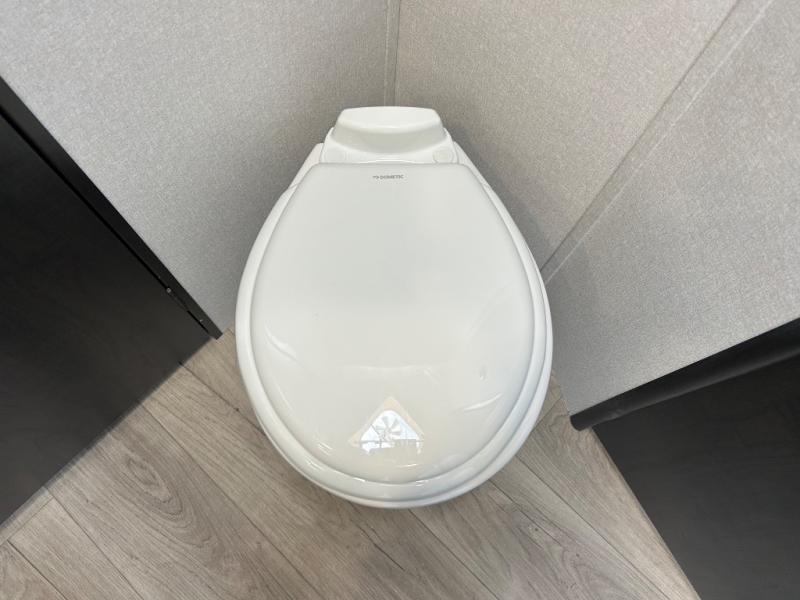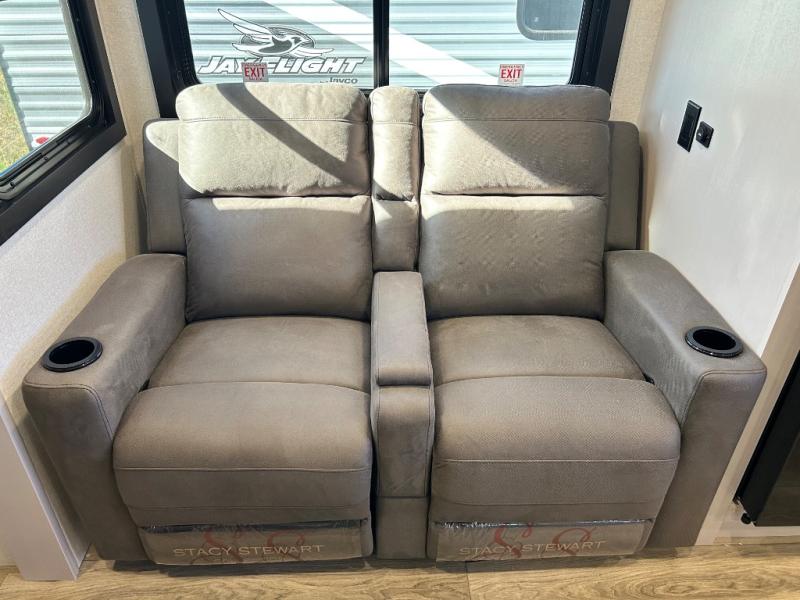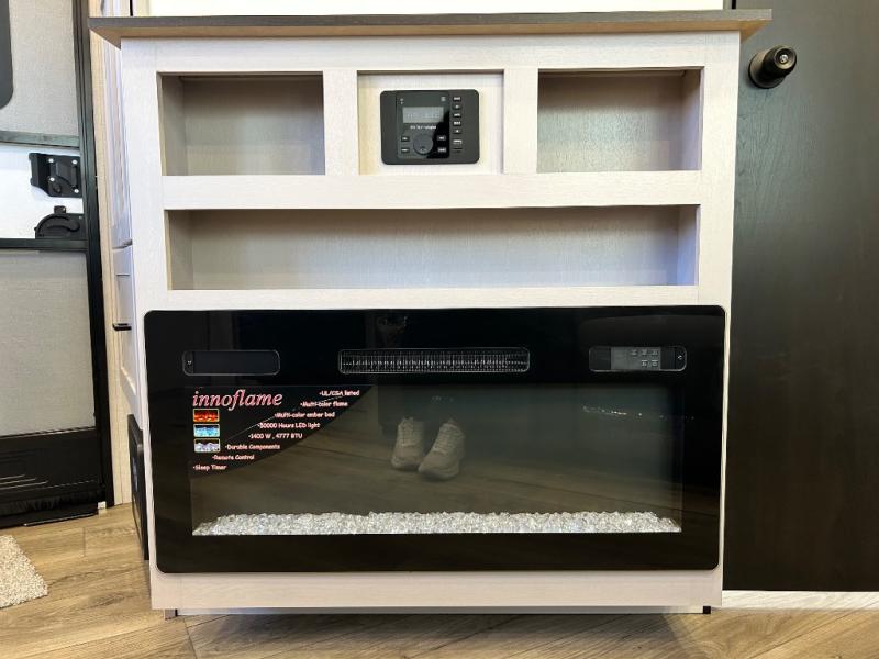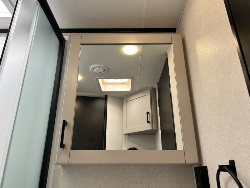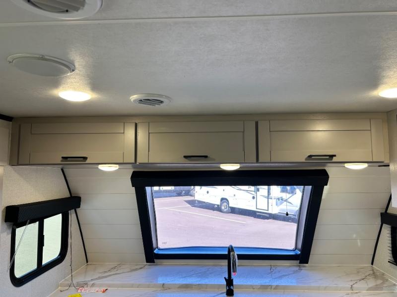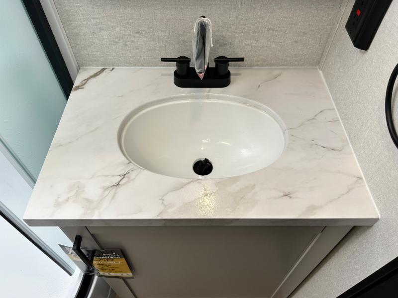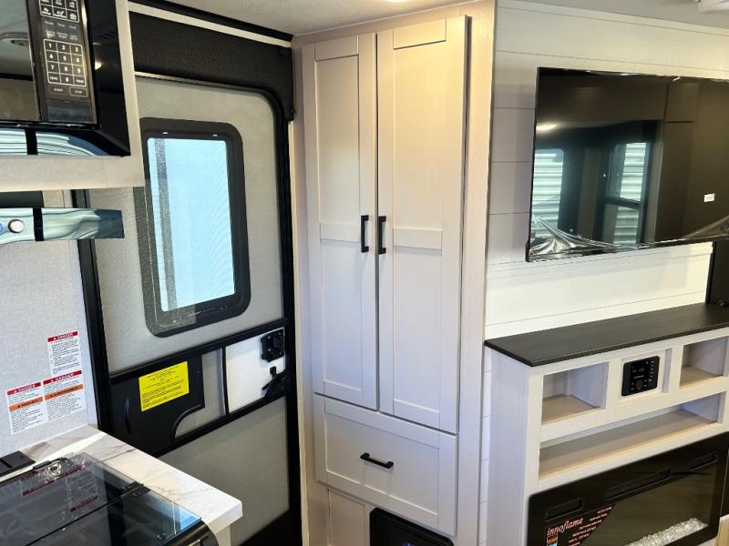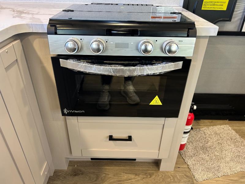 Step inside this spacious travel trailer through the front entry and you find the front kitchen that spans the width of the unit, providing plenty of counter space for meal prep. The kitchen is fully equipped with a stainless-steel sink, a decorative backsplash, a 3-burner cooktop, and an 11-cu. ft. 12V refrigerator, perfect for storing all your groceries. Overhead shelves offer convenient storage, and a pantry adds extra space for essentials. Next to the kitchen, you’ll find 60" theater seating, ideal for enjoying meals or watching your favorite shows on the LED Smart TV. As you move down the hall, you’ll come to a full bathroom featuring a radius shower and two entry doors for easy access. At the rear of the trailer, the comfortable bedroom features a 60" x 80" Queen bed, a sliding mirror door closet for added storage, and a second entry door to the exterior.