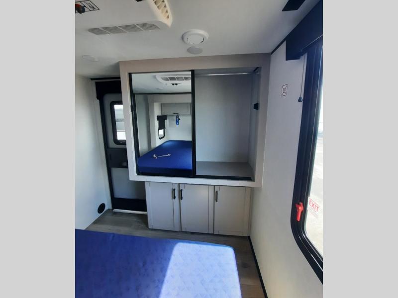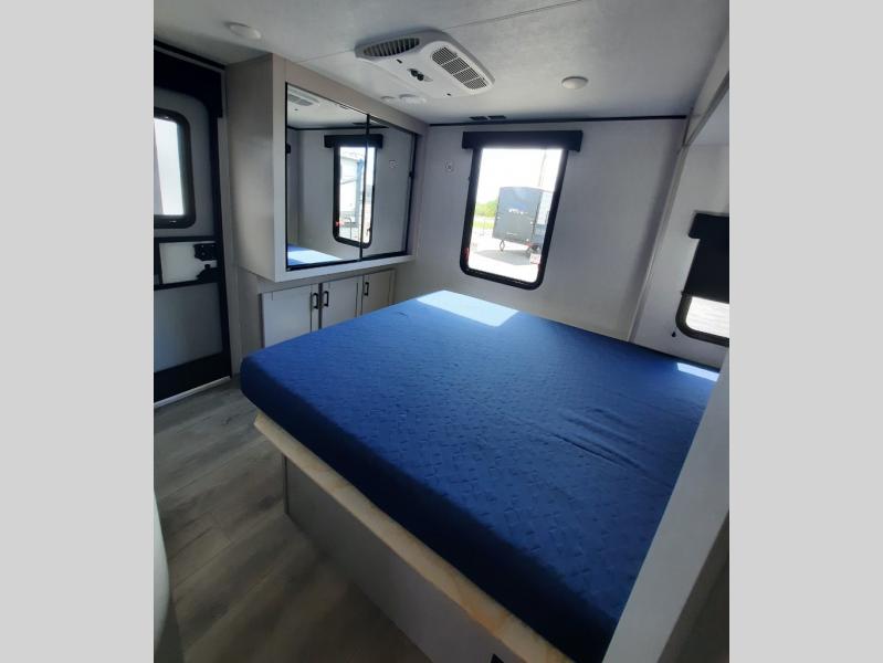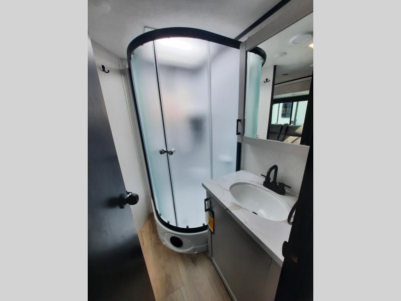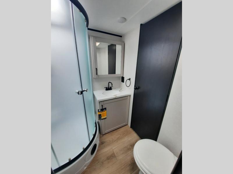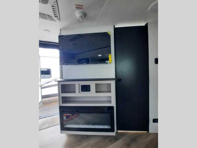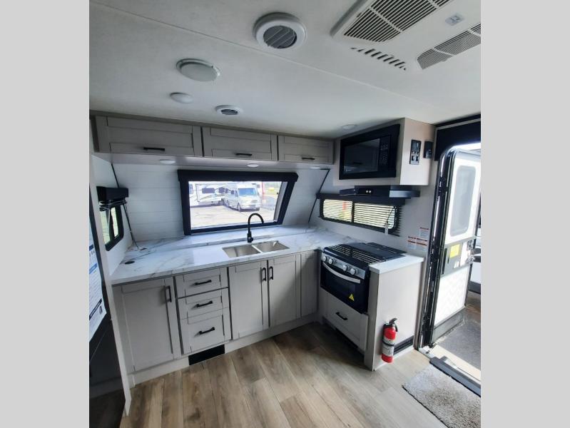 Step inside this spacious travel trailer through the front entry and you find the front kitchen that spans the width of the unit, providing plenty of counter space for meal prep. The kitchen is fully equipped with a stainless-steel sink, a decorative backsplash, a 3-burner cooktop, and an 11-cu. ft. 12V refrigerator, perfect for storing all your groceries. Overhead shelves offer convenient storage, and a pantry adds extra space for essentials. Next to the kitchen, you’ll find 60" theater seating, ideal for enjoying meals or watching your favorite shows on the LED Smart TV. As you move down the hall, you’ll come to a full bathroom featuring a radius shower and two entry doors for easy access. At the rear of the trailer, the comfortable bedroom features a 60" x 80" Queen bed, a sliding mirror door closet for added storage, and a second entry door to the exterior.