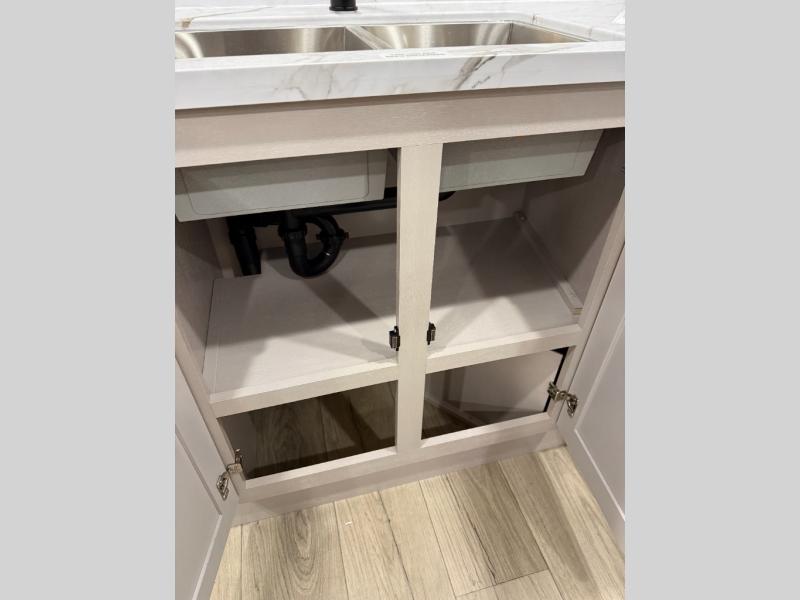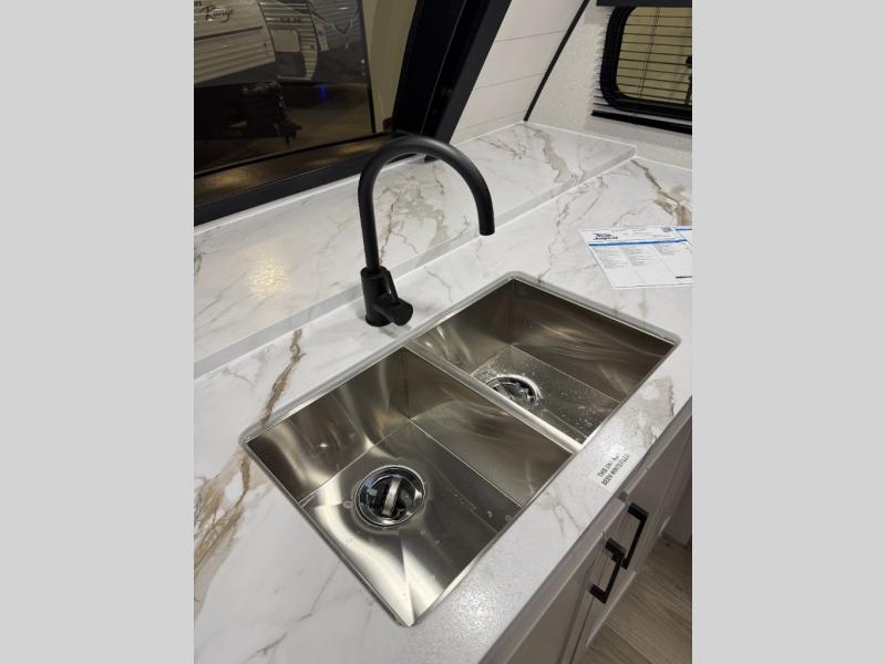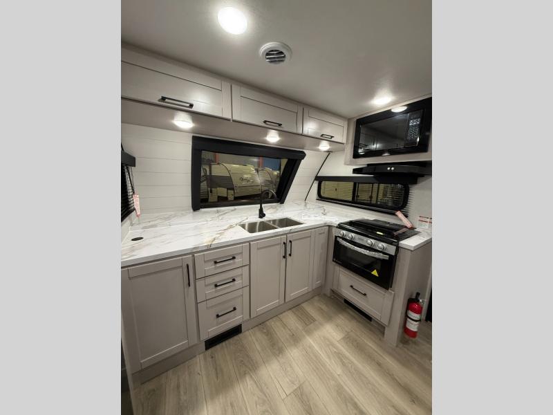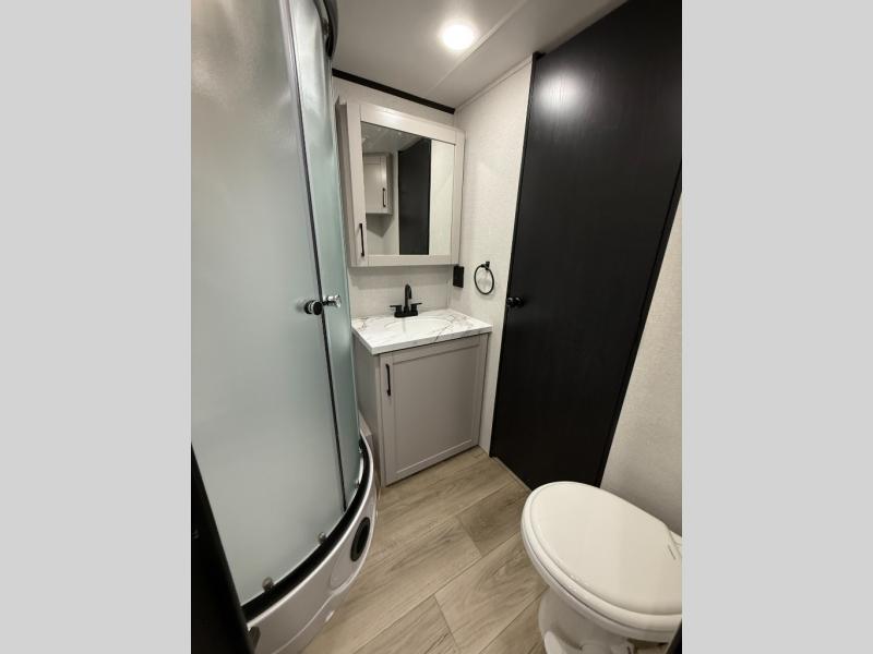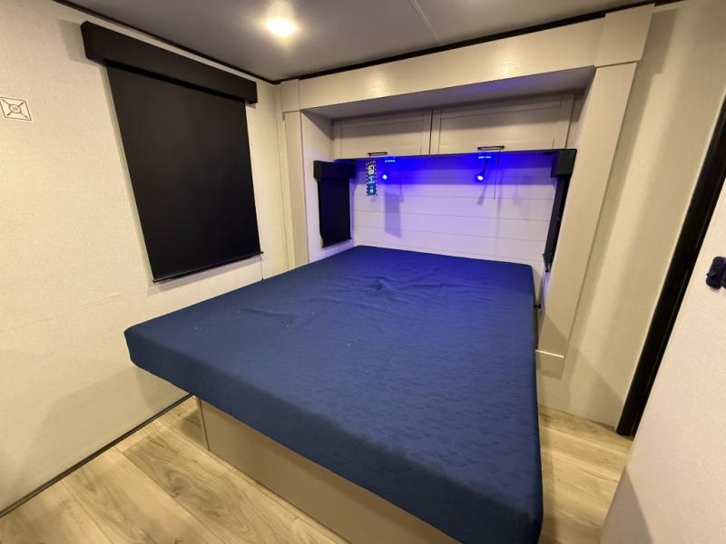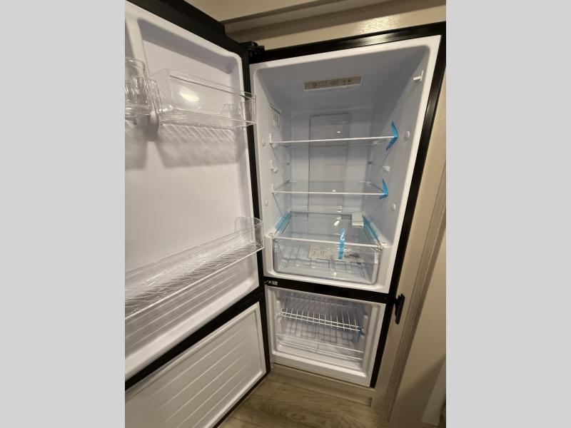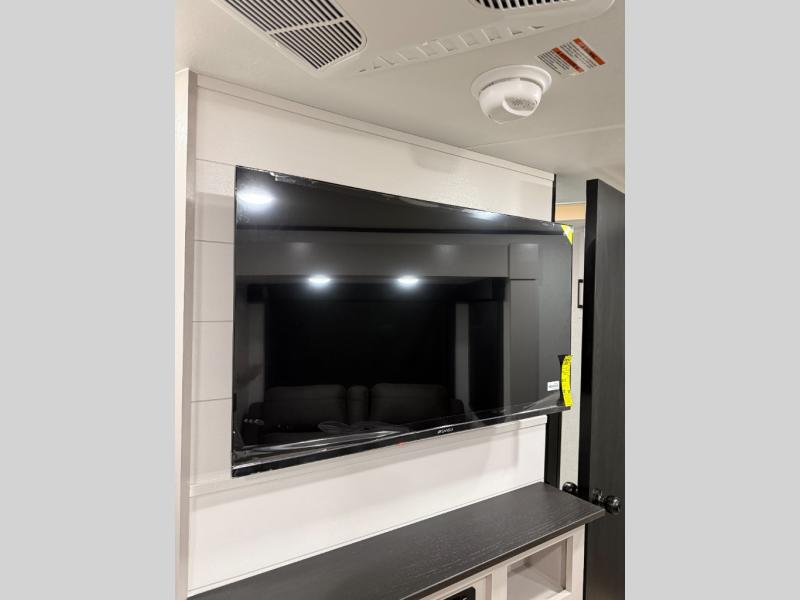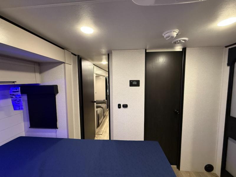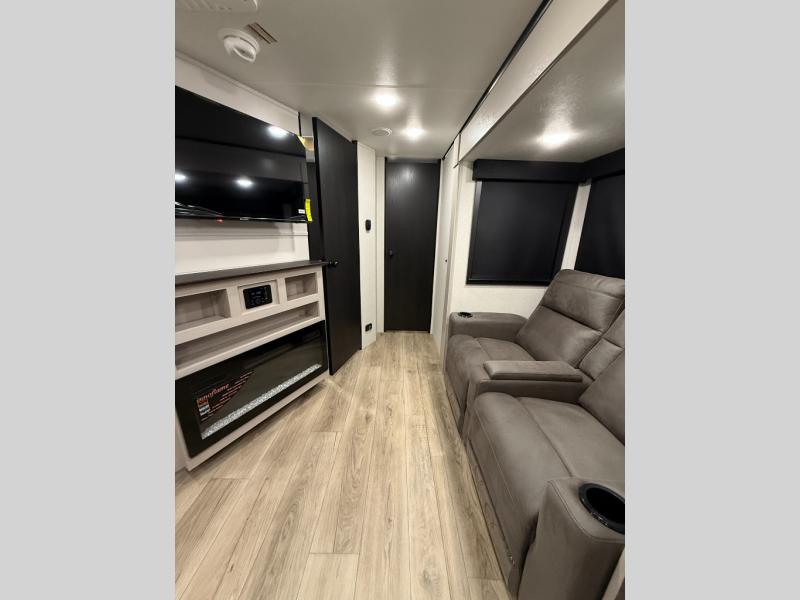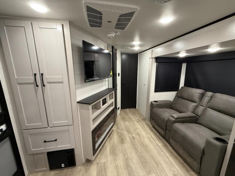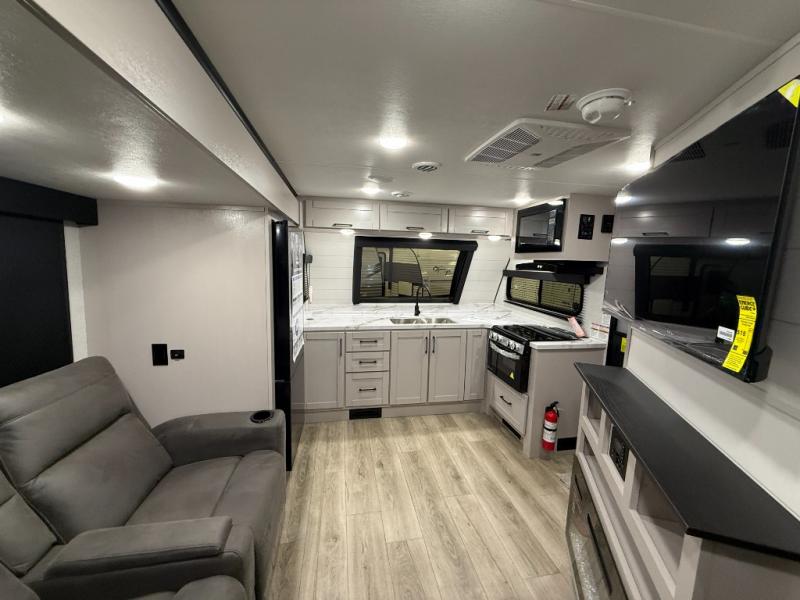 Step inside this spacious travel trailer through the front entry and you find the front kitchen that spans the width of the unit, providing plenty of counter space for meal prep. The kitchen is fully equipped with a stainless-steel sink, a decorative backsplash, a 3-burner cooktop, and an 11-cu. ft. 12V refrigerator, perfect for storing all your groceries. Overhead shelves offer convenient storage, and a pantry adds extra space for essentials. Next to the kitchen, you’ll find 60" theater seating, ideal for enjoying meals or watching your favorite shows on the LED Smart TV. As you move down the hall, you’ll come to a full bathroom featuring a radius shower and two entry doors for easy access. At the rear of the trailer, the comfortable bedroom features a 60" x 80" Queen bed, a sliding mirror door closet for added storage, and a second entry door to the exterior.