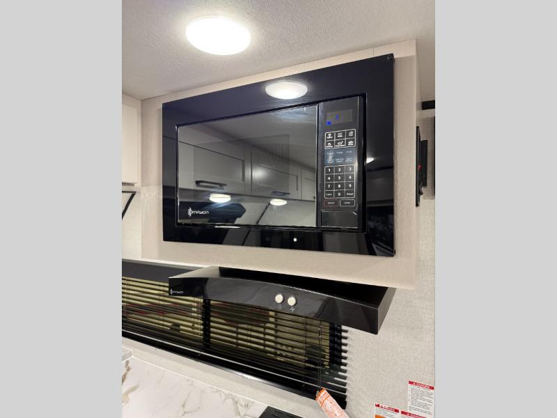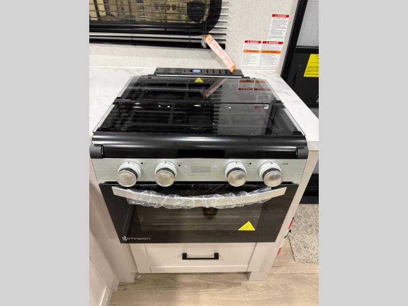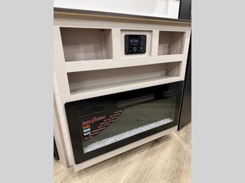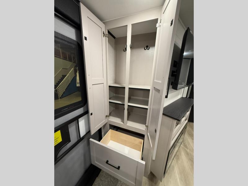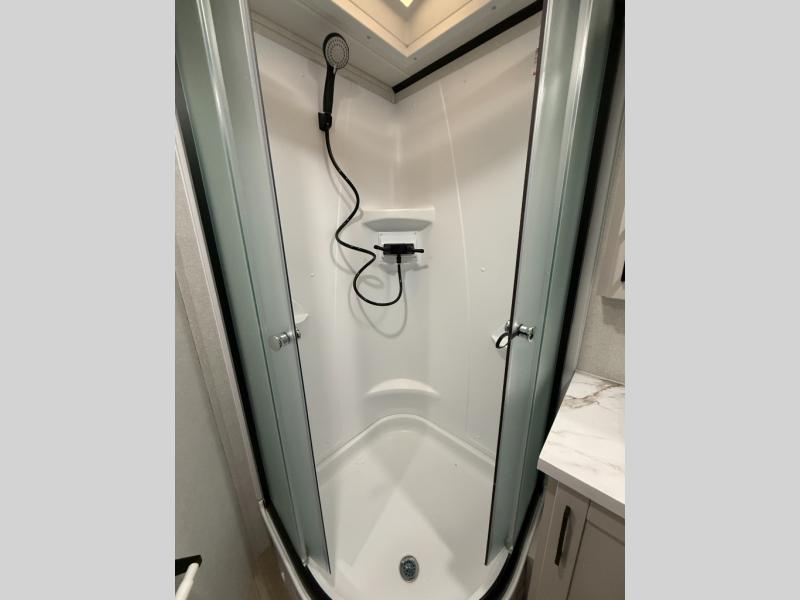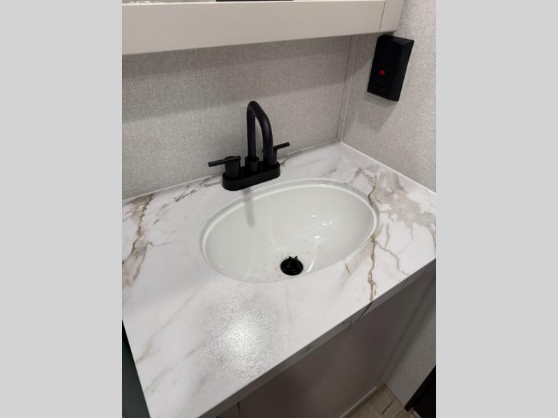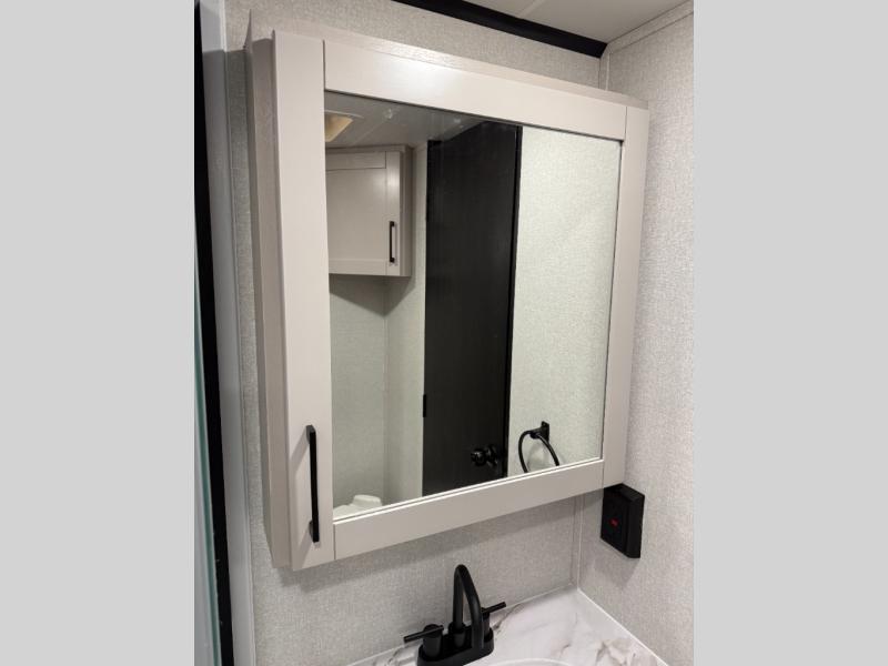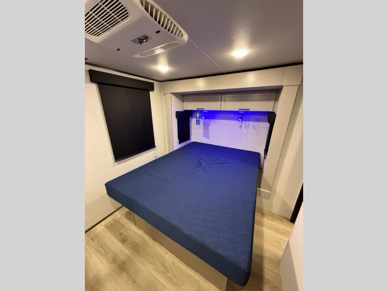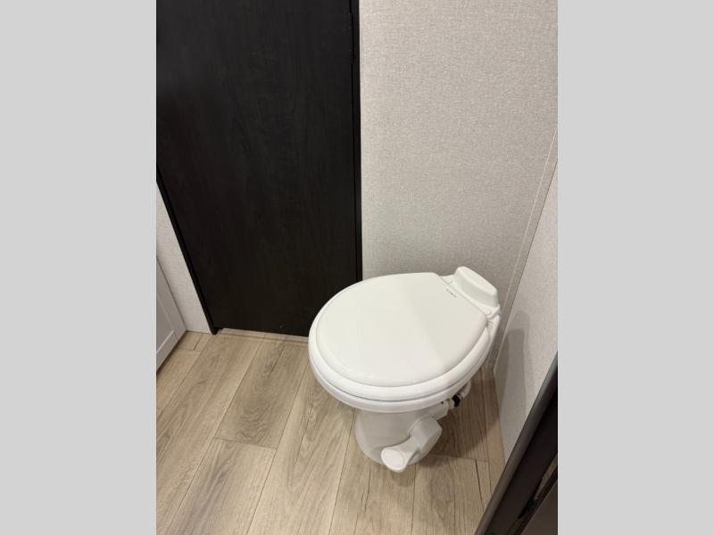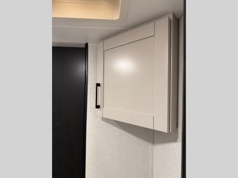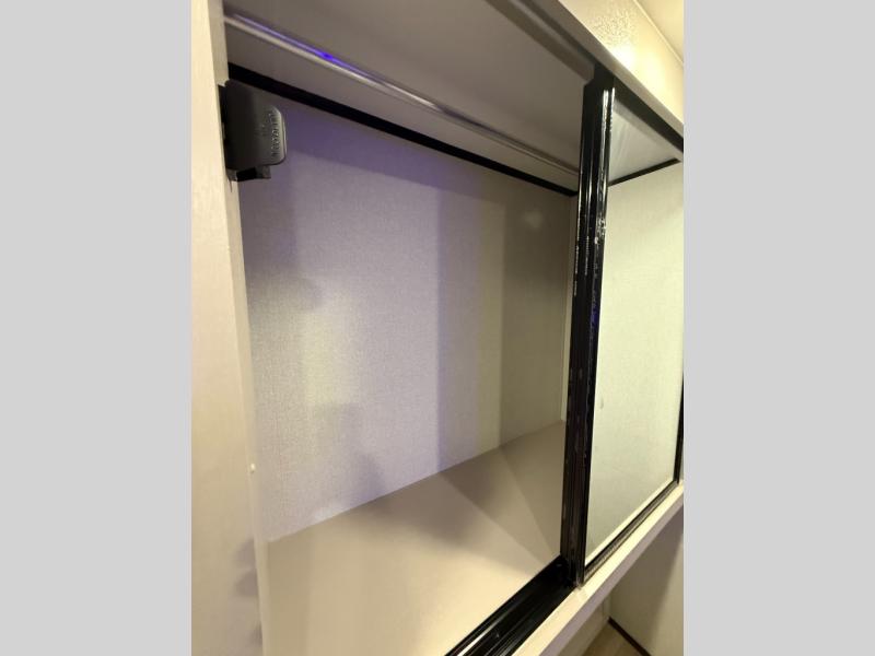Step inside this spacious travel trailer through the front entry and you find the front kitchen that spans the width of the unit, providing plenty of counter space for meal prep. The kitchen is fully equipped with a stainless-steel sink, a decorative backsplash, a 3-burner cooktop, and an 11-cu. ft. 12V refrigerator, perfect for storing all your groceries. Overhead shelves offer convenient storage, and a pantry adds extra space for essentials. Next to the kitchen, you’ll find 60" theater seating, ideal for enjoying meals or watching your favorite shows on the LED Smart TV. As you move down the hall, you’ll come to a full bathroom featuring a radius shower and two entry doors for easy access. At the rear of the trailer, the comfortable bedroom features a 60" x 80" Queen bed, a sliding mirror door closet for added storage, and a second entry door to the exterior.