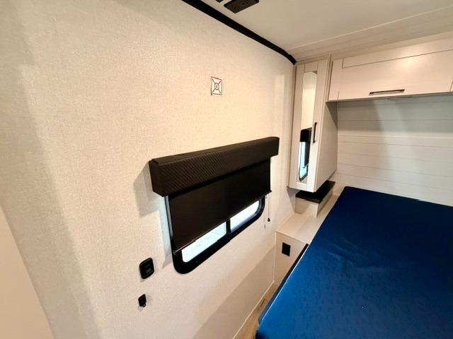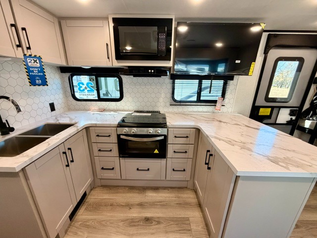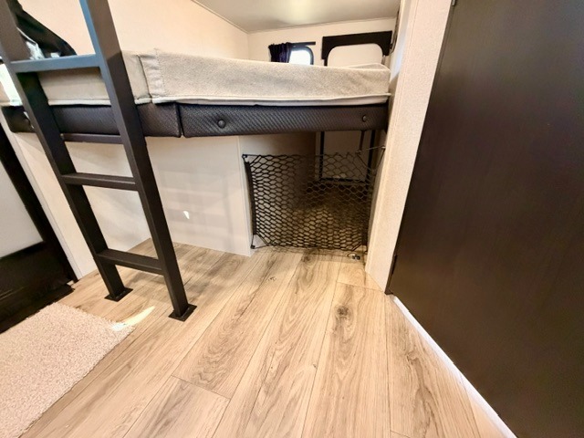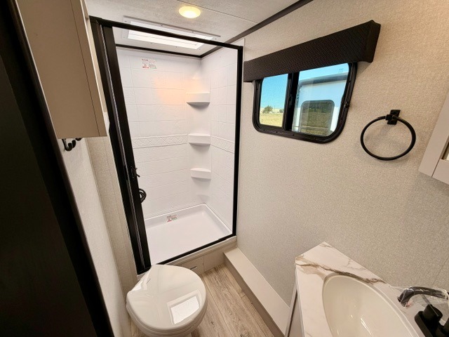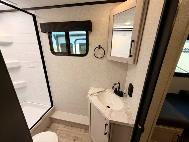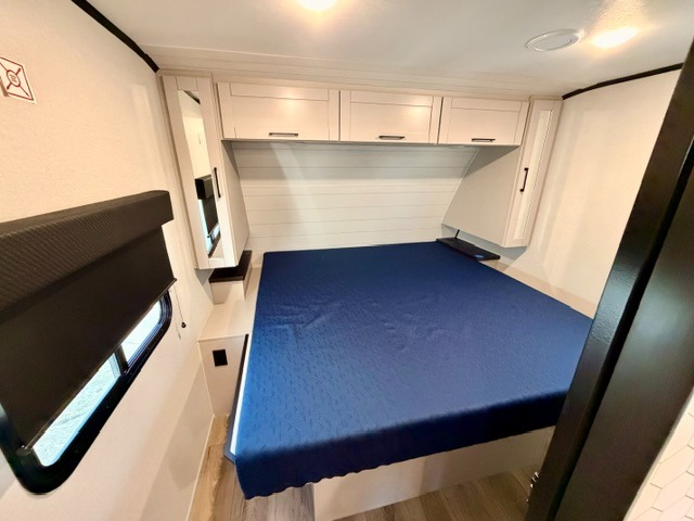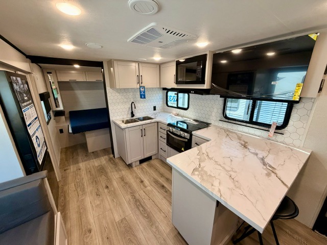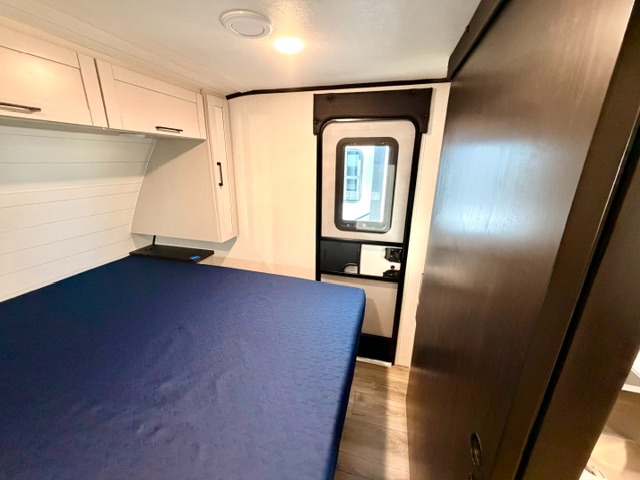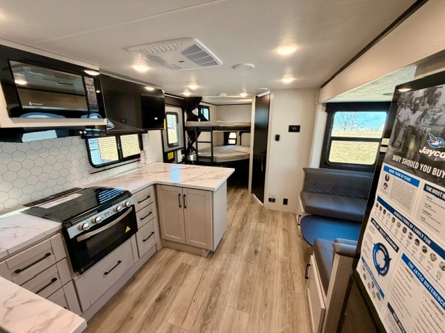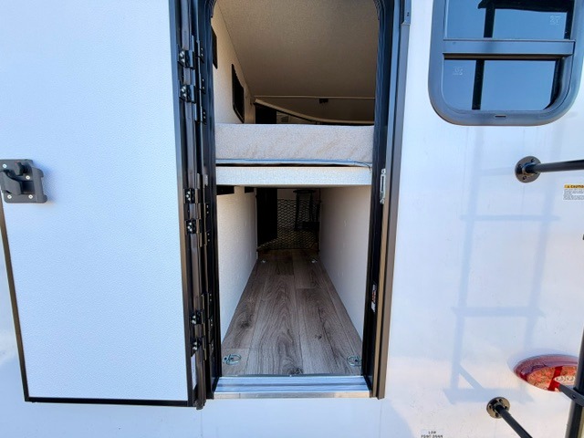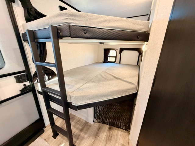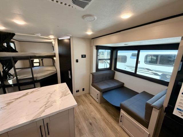 Step inside this thoughtfully designed travel trailer and experience comfort and convenience at every turn. At the front, you'll find a cozy bedroom featuring a 60" x 80" queen bed, in between wardrobes and nightstands on each side, perfect for storing your clothes and essentials. Moving to the center, the spacious living area boasts a large slide-out with a booth dinette that’s ideal for meals, board games, or even accommodating an extra guest. Right next to it, an 11-cu. ft. refrigerator and pantry provide ample space for groceries and dry goods. Opposite the slide is a functional U-shaped kitchen with a stainless-steel sink, solid surface countertops, and additional eating space with folding stools along the counter. At the rear, two roomy 50" x 73" bunks with flip-up storage offer sleeping space for guests and room for gear, while the adjacent corner bathroom includes a 30" x 36" shower and a porcelain foot flush toilet. A second entry door near the bunks adds extra convenience and easy access, making this trailer perfect for both relaxing getaways and adventurous trips.
