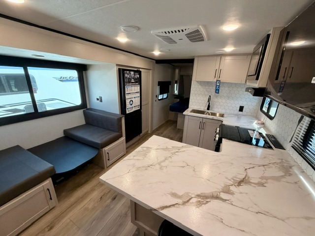 With any Jay Feather travel trailer by Jayco, you will enjoy lightweight towing, convenient exterior amenities, and at-home comforts inside! The Overlander 1 Solar Package included within the Jay Sport Package comes with a 200W solar panel and a 30-amp digital controller so you can enjoy some off-grid camping. There is also a modern graphics package, Solid fold-down step with aluminum tread steps on the main entry doorstep, and Climate Shield 0 -100° F tested weather insulation package that will allow you to camp in various types of climates. The Customer Value Package will make time outdoors easier than ever with a power tongue jack and Automotive-style aluminum rims, plus radial tires with self-adjusting electric brakes. More exterior features include a Keyed-Alike doors, a Magnum Truss roof system, and the list goes on! And we haven't even touched on the interior comforts, like the seamless countertops and Residential vinyl flooring throughout, decorative kitchen backsplash, handcrafted hardwood door/drawer fronts, and multiple USB charging ports to keep you going!
