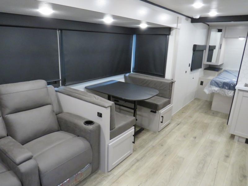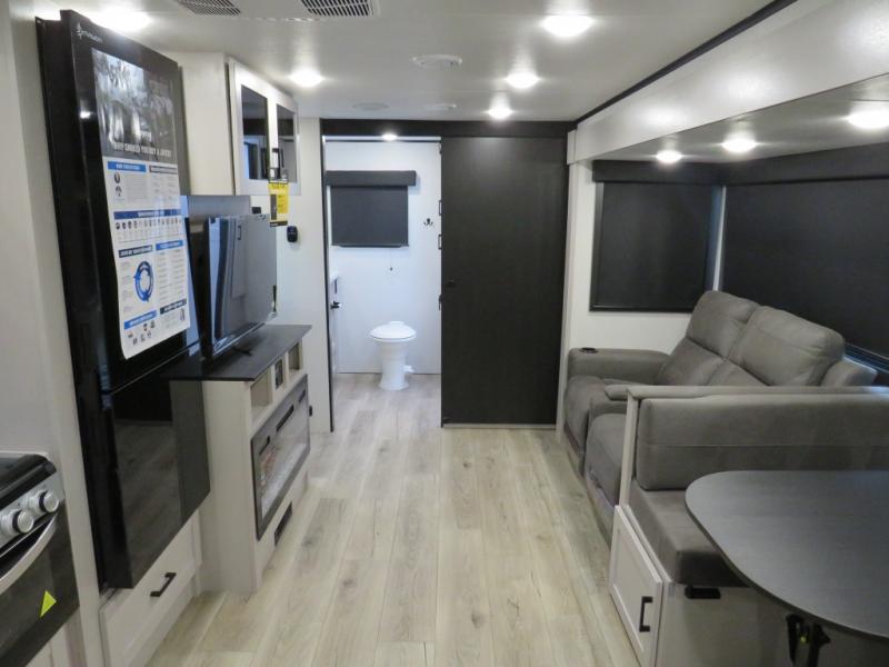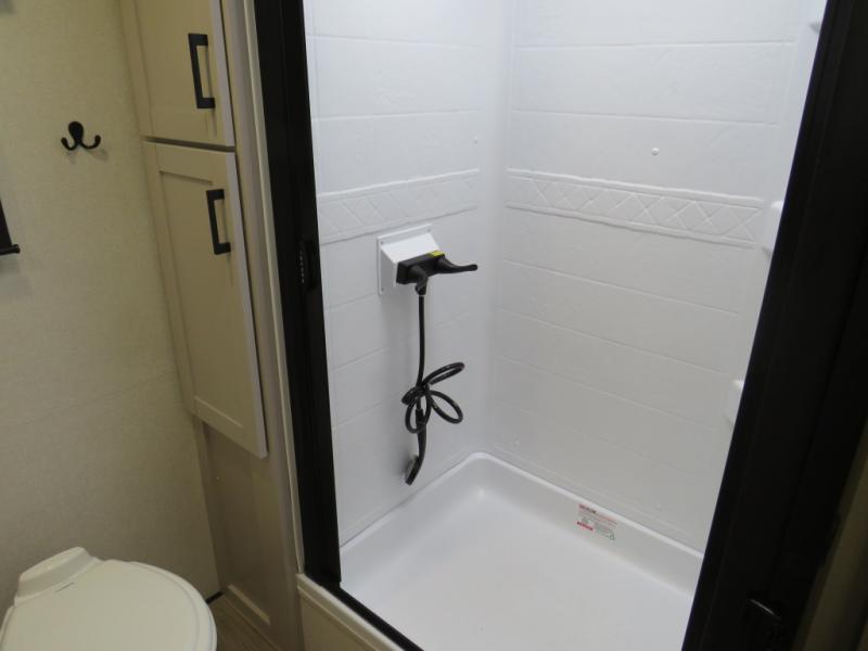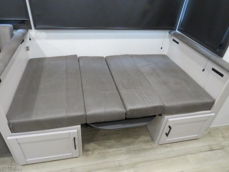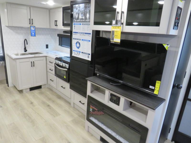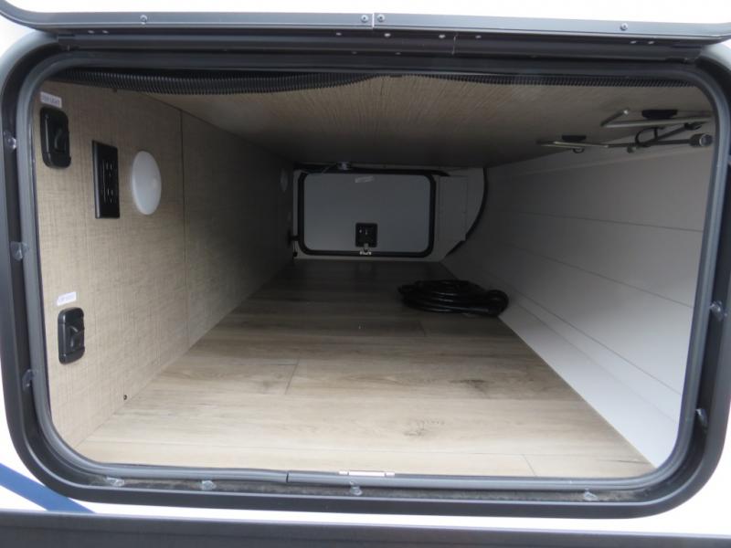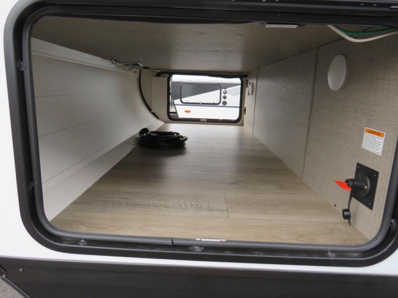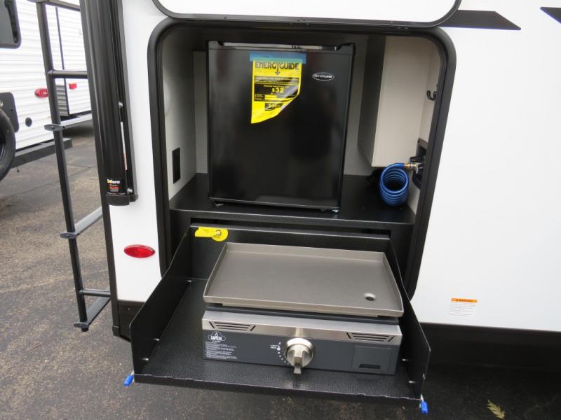 This travel trailer with a full rear bath is sure to bring you comfort wherever you camp. The front private bedroom with queen bed and dual wardrobes will have you feeling right at home. You can enjoy home cooked meals while at the campsite thanks to the three burner cooktop and 11 cu. ft. 12V refrigerator, plus there is a walk-in pantry to store all of your favorite snacks. The tri-fold sofa and booth dinette within the slide out offer comfortable places to relax. You can even cook breakfast outdoors using the outside kitchen and stay protected from the elements by the 19' power awning!