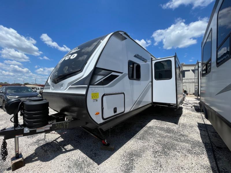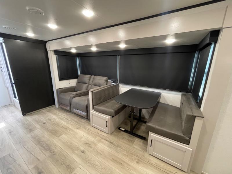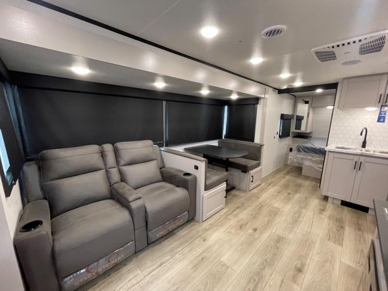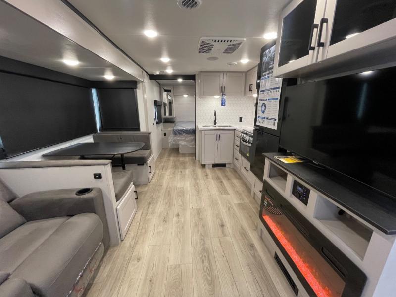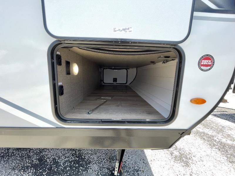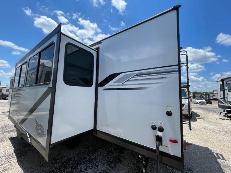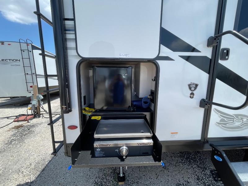 This travel trailer with a full rear bath is sure to bring you comfort wherever you camp. The front private bedroom with queen bed and dual wardrobes will have you feeling right at home. You can enjoy home cooked meals while at the campsite thanks to the three burner cooktop and 11 cu. ft. 12V refrigerator, plus there is a walk-in pantry to store all of your favorite snacks. The tri-fold sofa and booth dinette within the slide out offer comfortable places to relax. You can even cook breakfast outdoors using the outside kitchen and stay protected from the elements by the 19' power awning!