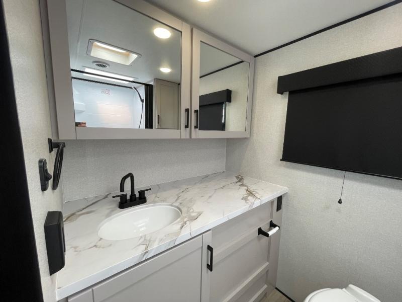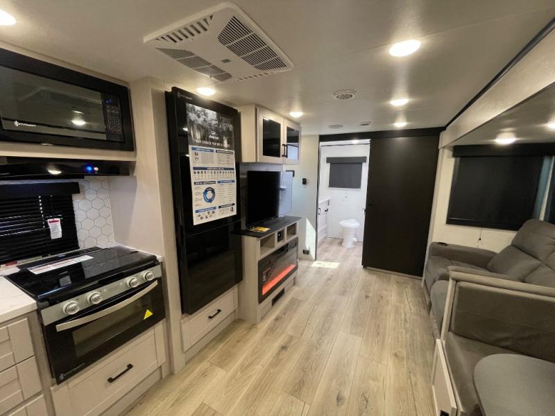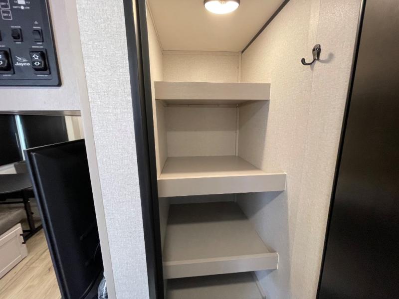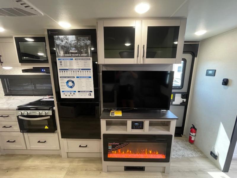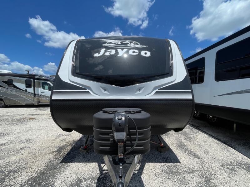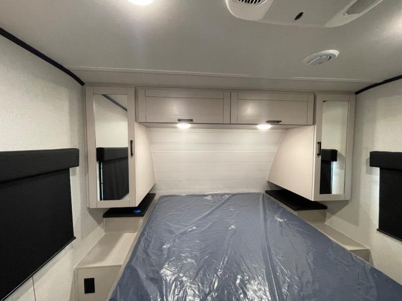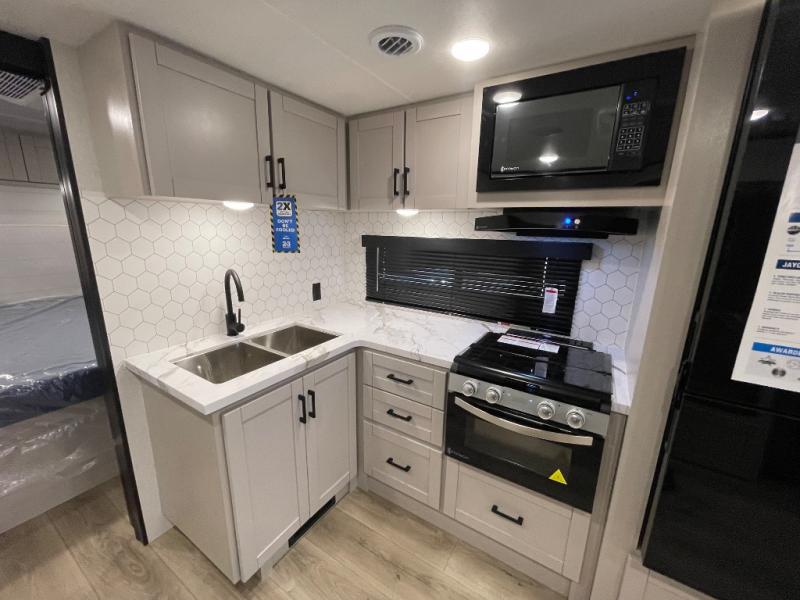 With any Jay Feather travel trailer by Jayco, you will enjoy lightweight towing, convenient exterior amenities, and at-home comforts inside! The Overlander 1 Solar Package included within the Jay Sport Package comes with a 200W solar panel and a 30-amp digital controller so you can enjoy some off-grid camping. There is also a modern graphics package with a dual-colored sidewall, LCI Solid Step fold-down aluminum tread steps on the main entry door, and Climate Shield 0 -100° F tested weather insulation package that will allow you to camp in all sorts of climates. The Customer Value Package will make time outdoors easier than ever with a power tongue jack and a Rock Solid stabilizer system, plus American-made nitro-filled Goodyear tires with self-adjusting electric brakes. More exterior features include a Keyed-Alike locking system, marine grade exterior speakers, a Magnum Truss roof system, and the list goes on! And we haven't even touched on the interior comforts, like the residential style seamless countertops and vinyl flooring throughout, decorative backsplash, handcrafted hardwood door/drawer fronts, and multiple USB charging ports to keep you going!