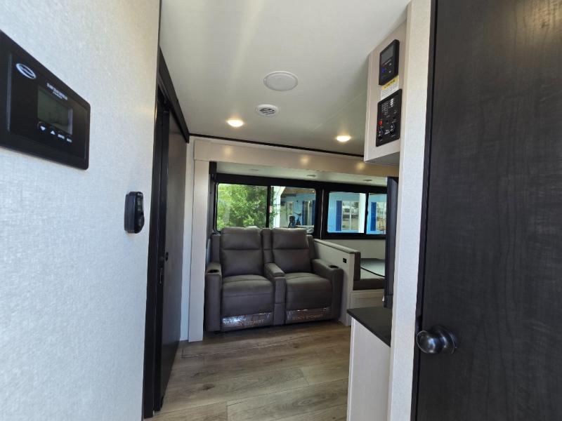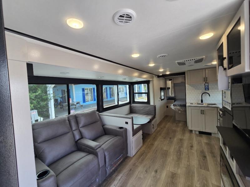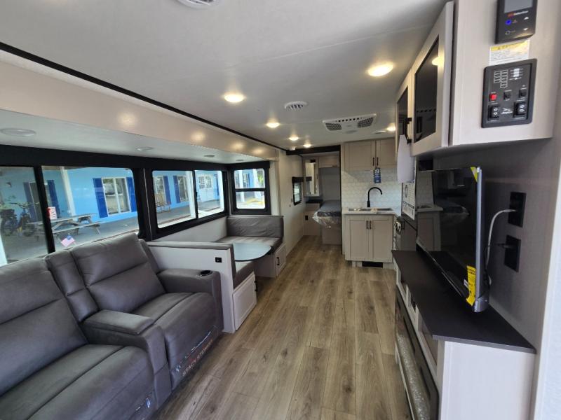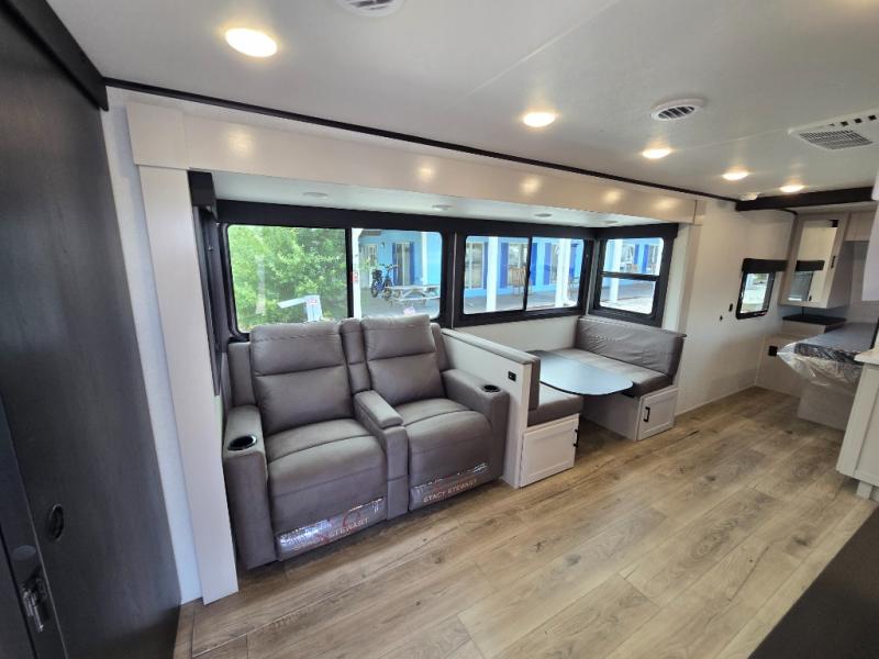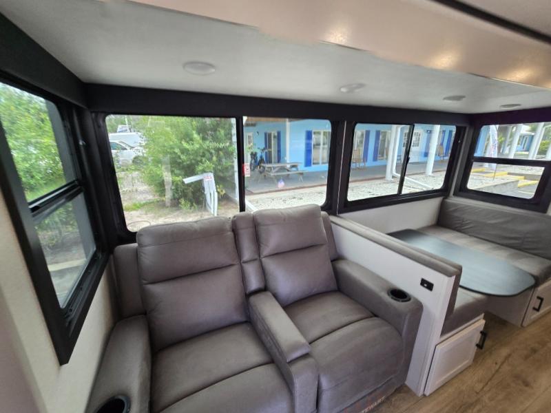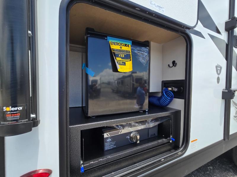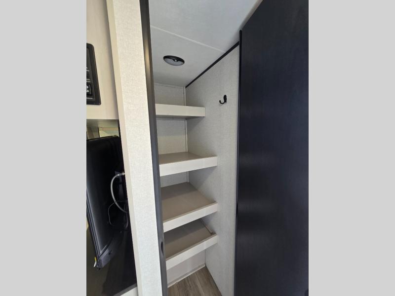 This travel trailer with a full rear bath is sure to bring you comfort wherever you camp. The front private bedroom with queen bed and dual wardrobes will have you feeling right at home. You can enjoy home cooked meals while at the campsite thanks to the three burner cooktop and 11 cu. ft. 12V refrigerator, plus there is a walk-in pantry to store all of your favorite snacks. The tri-fold sofa and booth dinette within the slide out offer comfortable places to relax. You can even cook breakfast outdoors using the outside kitchen and stay protected from the elements by the 19' power awning!