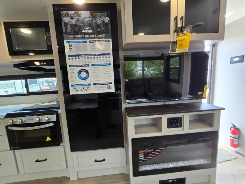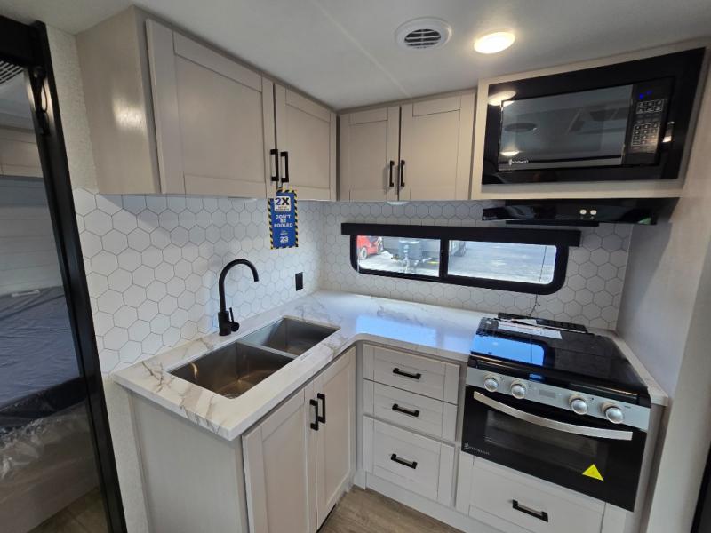 With any Jay Feather travel trailer by Jayco, you will enjoy lightweight towing, convenient exterior amenities, and at-home comforts inside! The Overlander 1 Solar Package included within the Jay Sport Package comes with a 200W solar panel and a 30-amp digital controller so you can enjoy some off-grid camping. There is also a modern graphics package with a dual-colored sidewall, LCI Solid Step fold-down aluminum tread steps on the main entry door, and Climate Shield 0 -100° F tested weather insulation package that will allow you to camp in all sorts of climates. The Customer Value Package will make time outdoors easier than ever with a power tongue jack and a Rock Solid stabilizer system, plus American-made nitro-filled Goodyear tires with self-adjusting electric brakes. More exterior features include a Keyed-Alike locking system, marine grade exterior speakers, a Magnum Truss roof system, and the list goes on! And we haven't even touched on the interior comforts, like the residential style seamless countertops and vinyl flooring throughout, decorative backsplash, handcrafted hardwood door/drawer fronts, and multiple USB charging ports to keep you going!