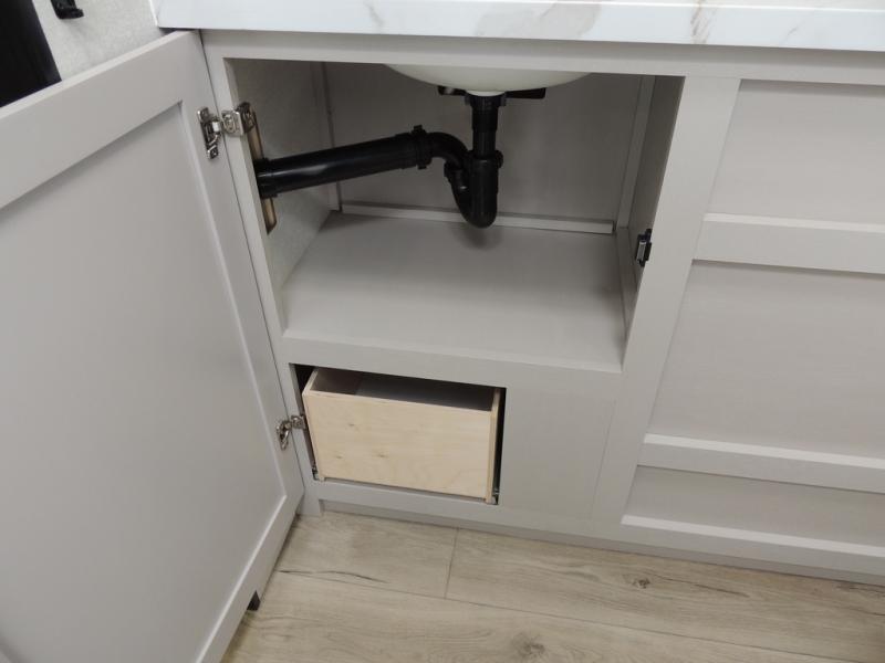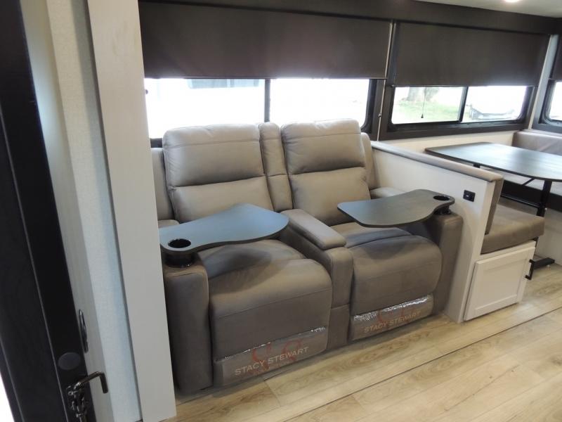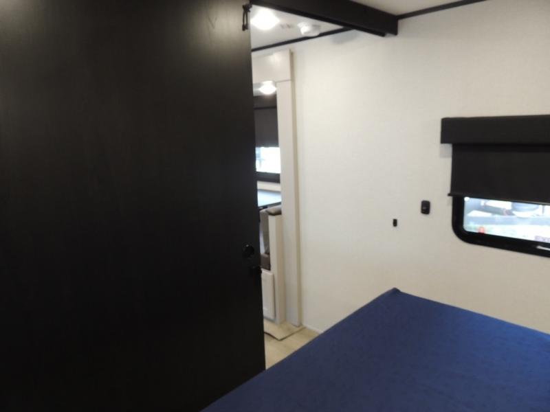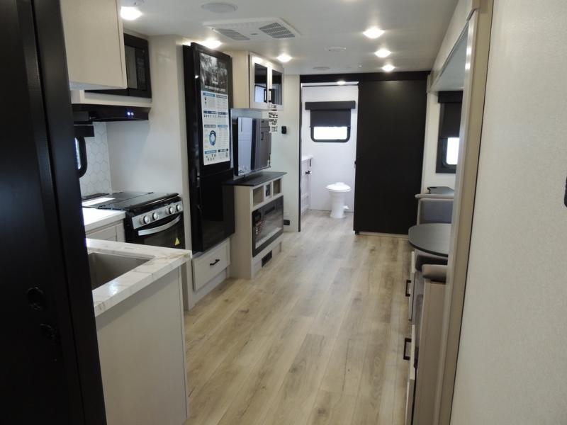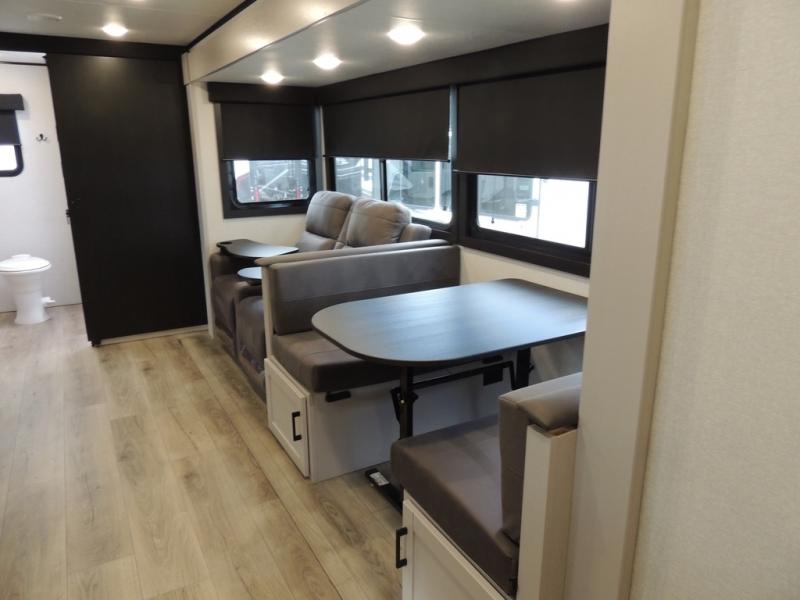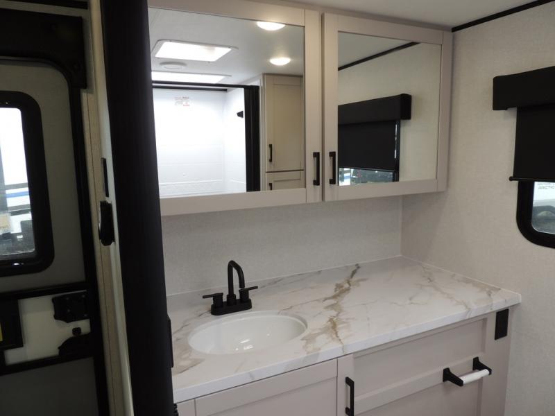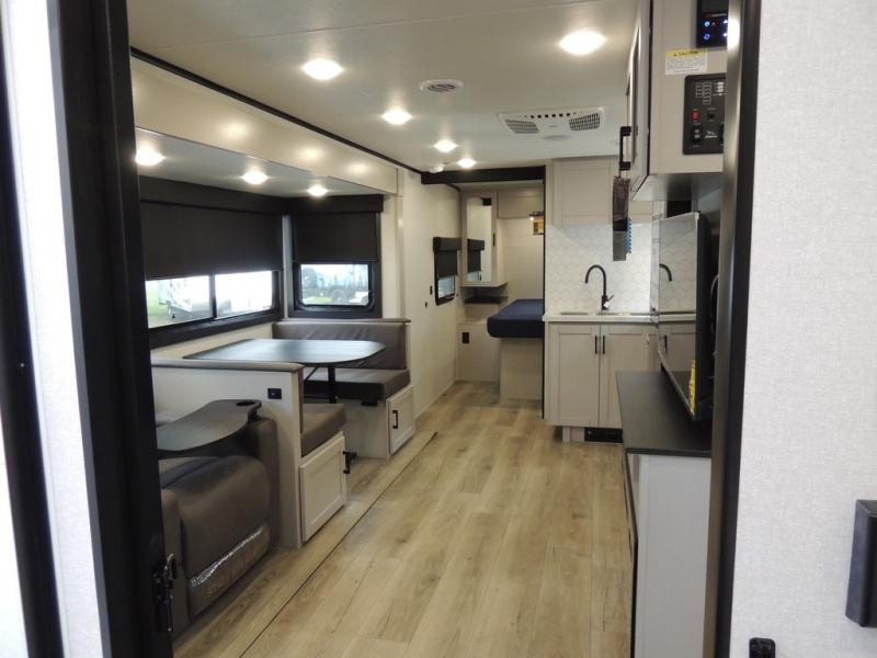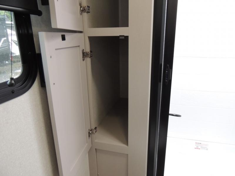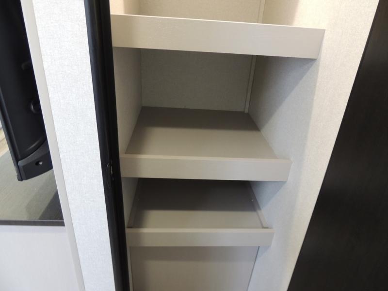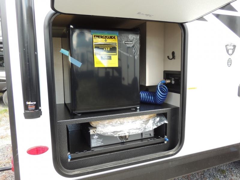 This travel trailer with a full rear bath is sure to bring you comfort wherever you camp. The front private bedroom with queen bed and dual wardrobes will have you feeling right at home. You can enjoy home cooked meals while at the campsite thanks to the three burner cooktop and 11 cu. ft. 12V refrigerator, plus there is a walk-in pantry to store all of your favorite snacks. The tri-fold sofa and booth dinette within the slide out offer comfortable places to relax. You can even cook breakfast outdoors using the outside kitchen and stay protected from the elements by the 19' power awning!
