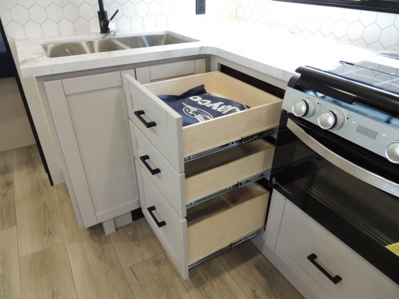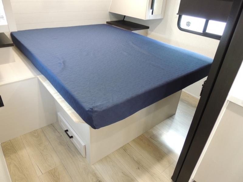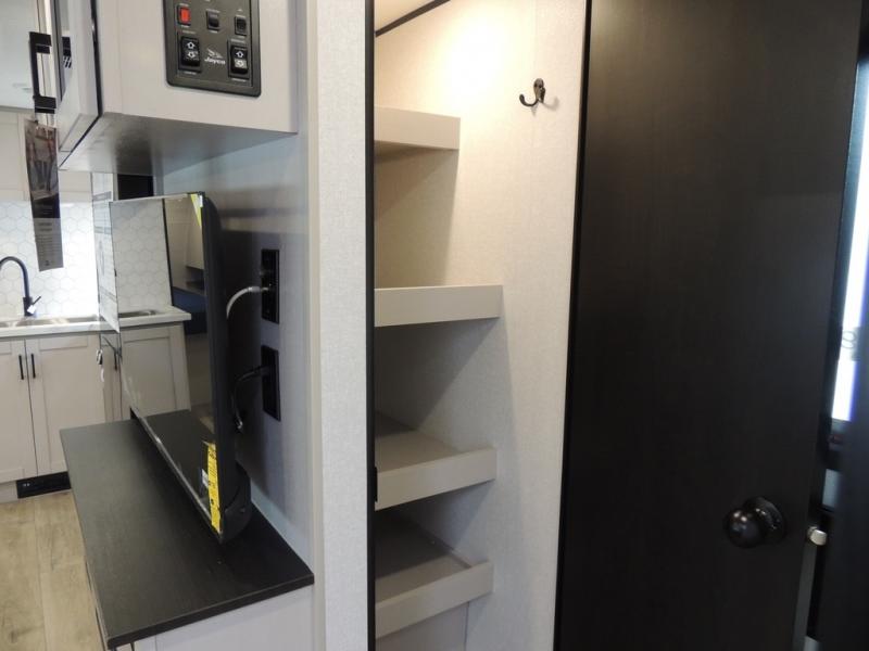 With any Jay Feather travel trailer by Jayco, you will enjoy lightweight towing, convenient exterior amenities, and at-home comforts inside! The Overlander 1 Solar Package included within the Jay Sport Package comes with a 200W solar panel and a 30-amp digital controller so you can enjoy some off-grid camping. There is also a modern graphics package with a dual-colored sidewall, LCI Solid Step fold-down aluminum tread steps on the main entry door, and Climate Shield 0 -100° F tested weather insulation package that will allow you to camp in all sorts of climates. The Customer Value Package will make time outdoors easier than ever with a power tongue jack and a Rock Solid stabilizer system, plus American-made nitro-filled Goodyear tires with self-adjusting electric brakes. More exterior features include a Keyed-Alike locking system, marine grade exterior speakers, a Magnum Truss roof system, and the list goes on! And we haven't even touched on the interior comforts, like the residential style seamless countertops and vinyl flooring throughout, decorative backsplash, handcrafted hardwood door/drawer fronts, and multiple USB charging ports to keep you going!