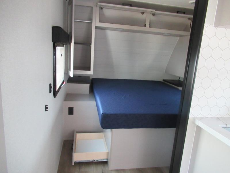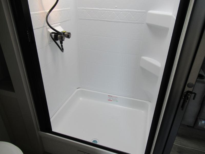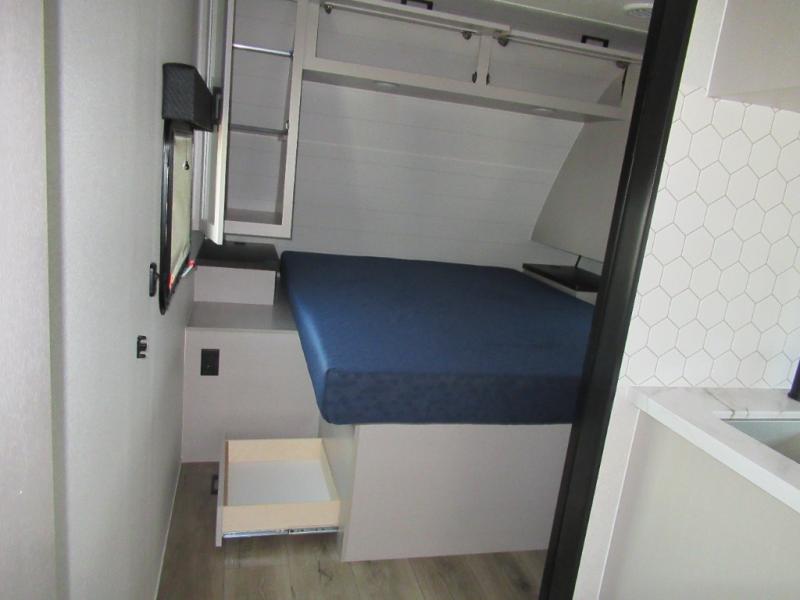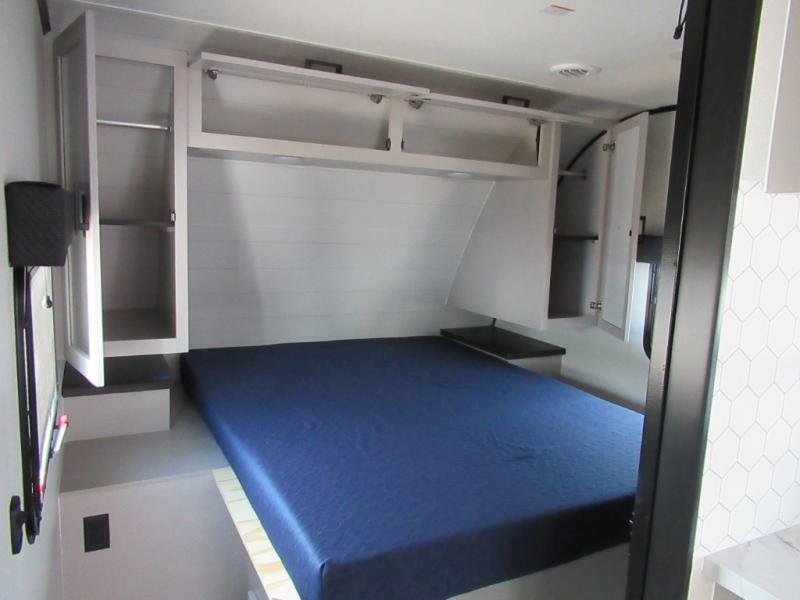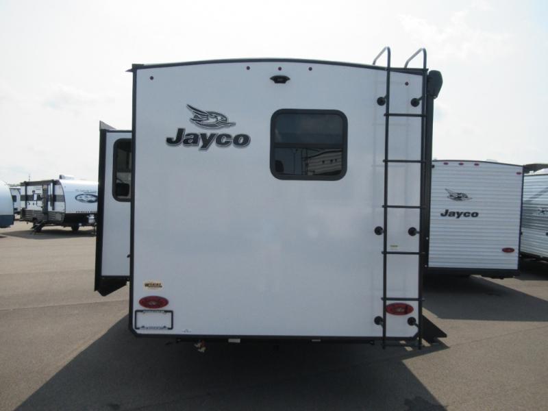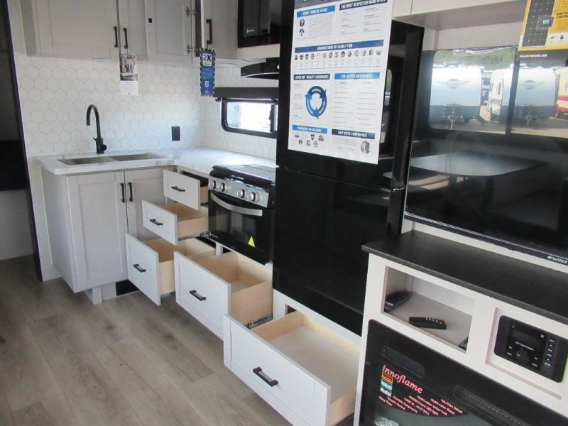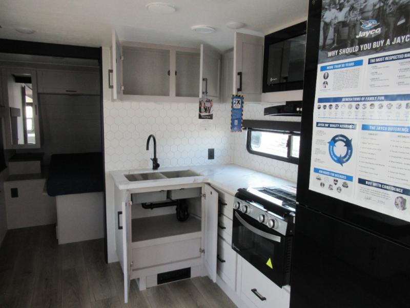 With any Jay Feather travel trailer by Jayco, you will enjoy lightweight towing, convenient exterior amenities, and at-home comforts inside! The Overlander 1 Solar Package included within the Jay Sport Package comes with a 200W solar panel and a 30-amp digital controller so you can enjoy some off-grid camping. There is also a modern graphics package with a dual-colored sidewall, LCI Solid Step fold-down aluminum tread steps on the main entry door, and Climate Shield 0 -100° F tested weather insulation package that will allow you to camp in all sorts of climates. The Customer Value Package will make time outdoors easier than ever with a power tongue jack and a Rock Solid stabilizer system, plus American-made nitro-filled Goodyear tires with self-adjusting electric brakes. More exterior features include a Keyed-Alike locking system, marine grade exterior speakers, a Magnum Truss roof system, and the list goes on! And we haven't even touched on the interior comforts, like the residential style seamless countertops and vinyl flooring throughout, decorative backsplash, handcrafted hardwood door/drawer fronts, and multiple USB charging ports to keep you going!