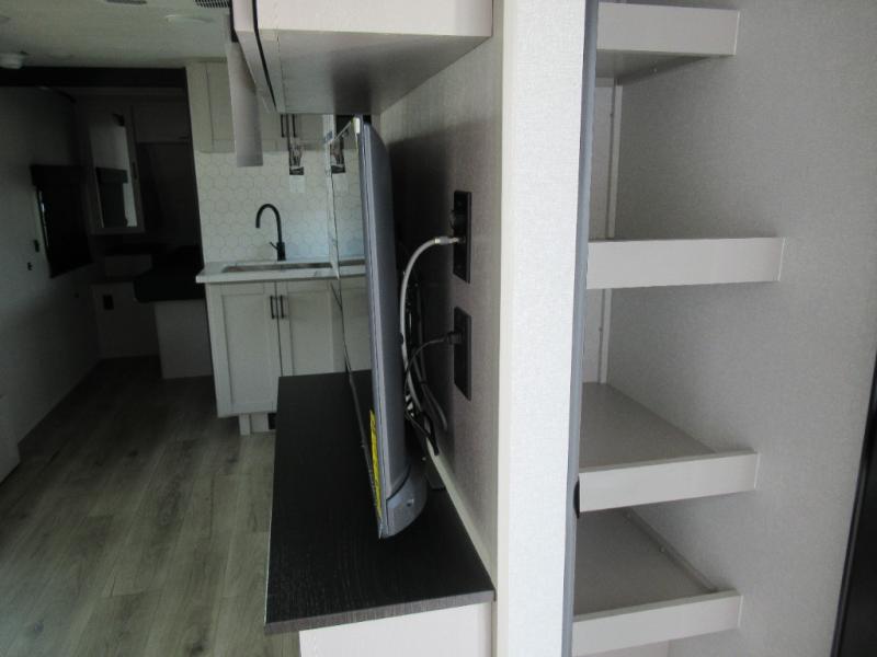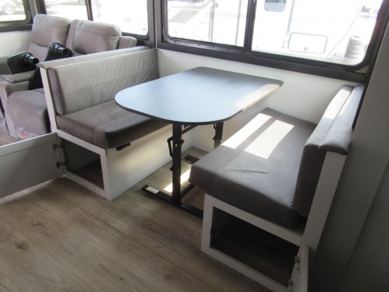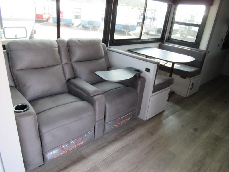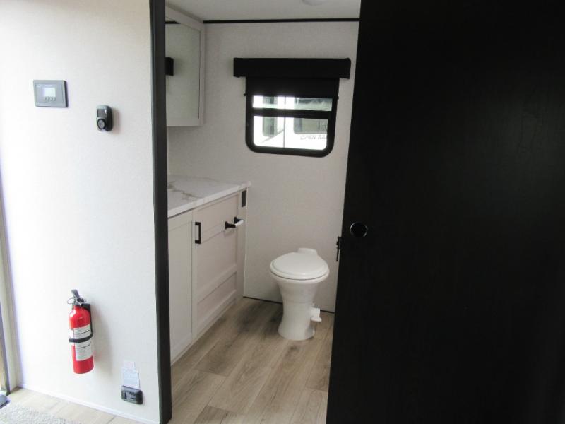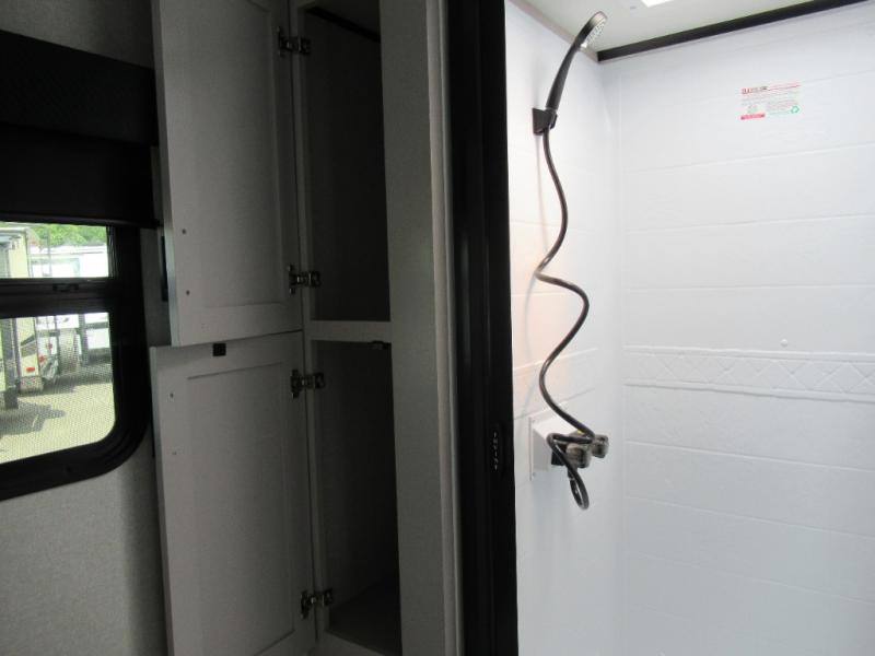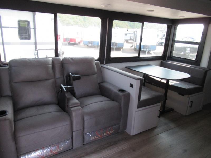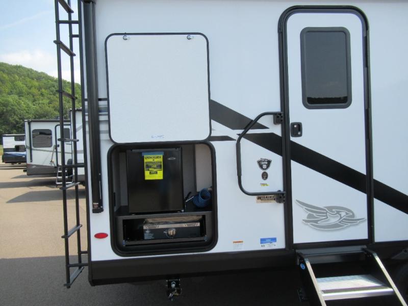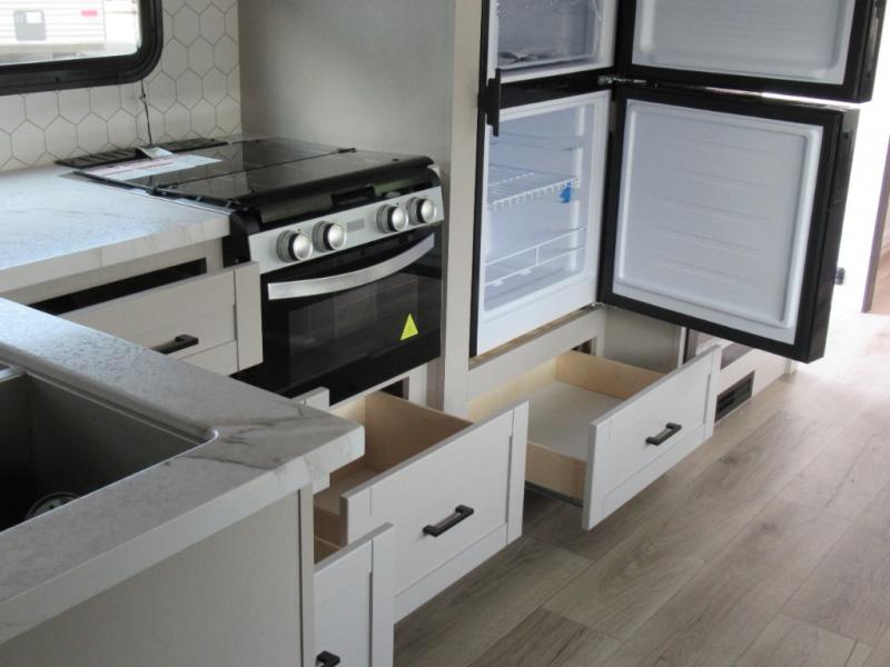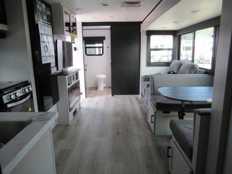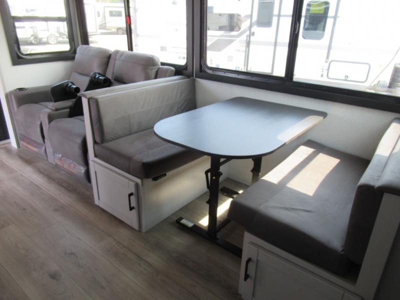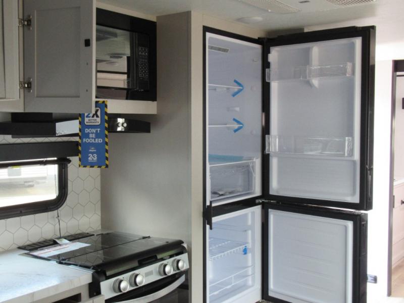 This travel trailer with a full rear bath is sure to bring you comfort wherever you camp. The front private bedroom with queen bed and dual wardrobes will have you feeling right at home. You can enjoy home cooked meals while at the campsite thanks to the three burner cooktop and 11 cu. ft. 12V refrigerator, plus there is a walk-in pantry to store all of your favorite snacks. The tri-fold sofa and booth dinette within the slide out offer comfortable places to relax. You can even cook breakfast outdoors using the outside kitchen and stay protected from the elements by the 19' power awning!