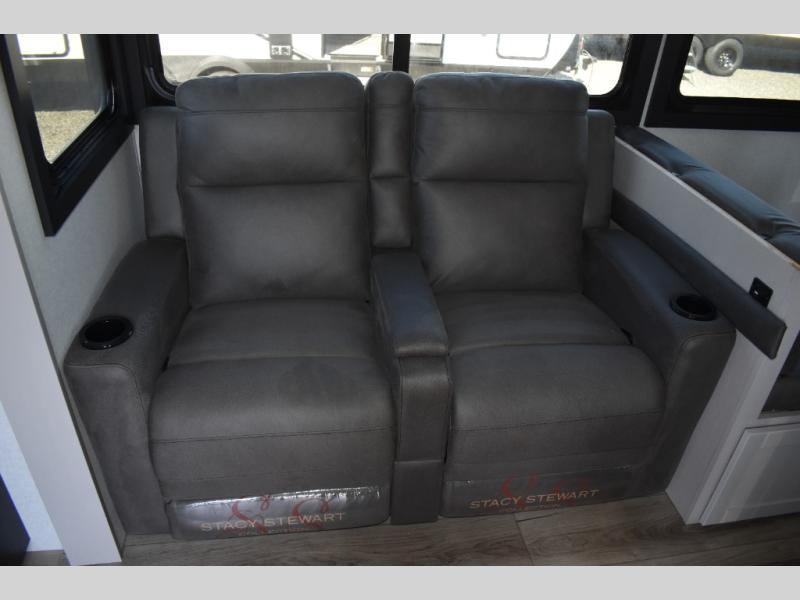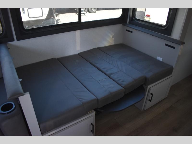 This travel trailer with a full rear bath is sure to bring you comfort wherever you camp. The front private bedroom with queen bed and dual wardrobes will have you feeling right at home. You can enjoy home cooked meals while at the campsite thanks to the three burner cooktop and 11 cu. ft. 12V refrigerator, plus there is a walk-in pantry to store all of your favorite snacks. The tri-fold sofa and booth dinette within the slide out offer comfortable places to relax. You can even cook breakfast outdoors using the outside kitchen and stay protected from the elements by the 19' power awning!