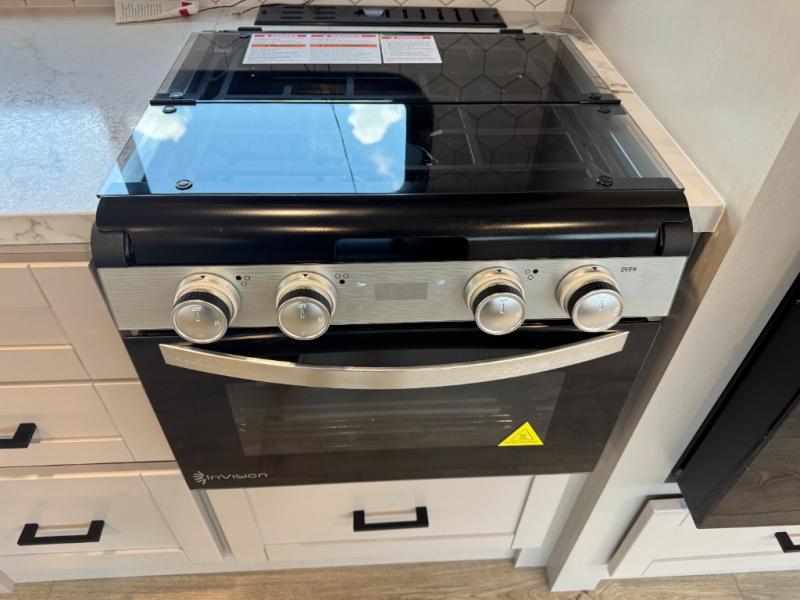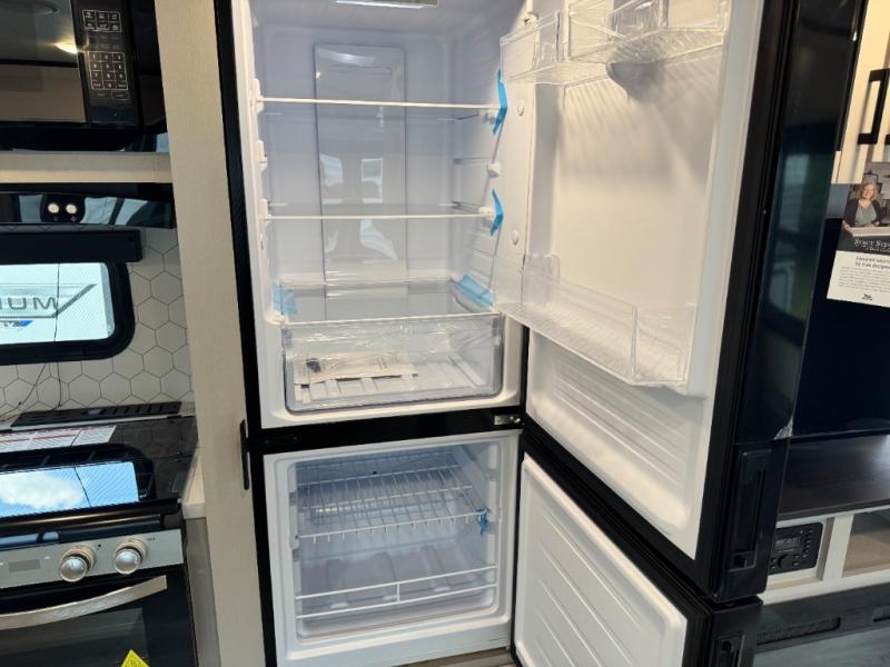 This travel trailer with a full rear bath is sure to bring you comfort wherever you camp. The front private bedroom with queen bed and dual wardrobes will have you feeling right at home. You can enjoy home cooked meals while at the campsite thanks to the three burner cooktop and 11 cu. ft. 12V refrigerator, plus there is a walk-in pantry to store all of your favorite snacks. The tri-fold sofa and booth dinette within the slide out offer comfortable places to relax. You can even cook breakfast outdoors using the outside kitchen and stay protected from the elements by the 19' power awning!
