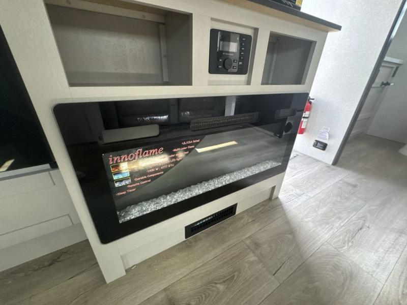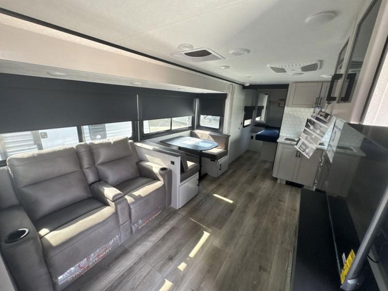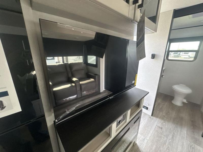 This travel trailer with a full rear bath is sure to bring you comfort wherever you camp. The front private bedroom with queen bed and dual wardrobes will have you feeling right at home. You can enjoy home cooked meals while at the campsite thanks to the three burner cooktop and 11 cu. ft. 12V refrigerator, plus there is a walk-in pantry to store all of your favorite snacks. The tri-fold sofa and booth dinette within the slide out offer comfortable places to relax. You can even cook breakfast outdoors using the outside kitchen and stay protected from the elements by the 19' power awning!