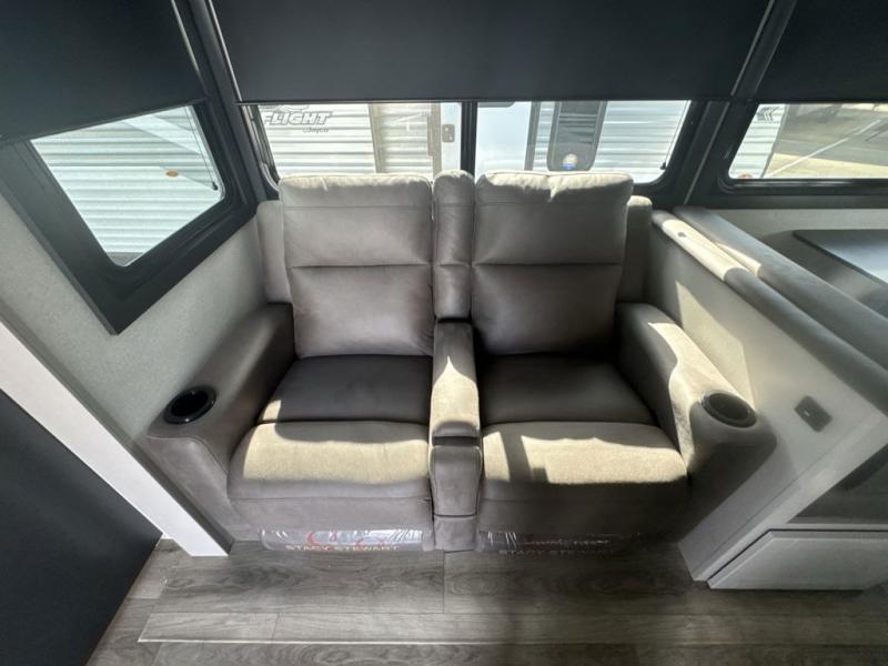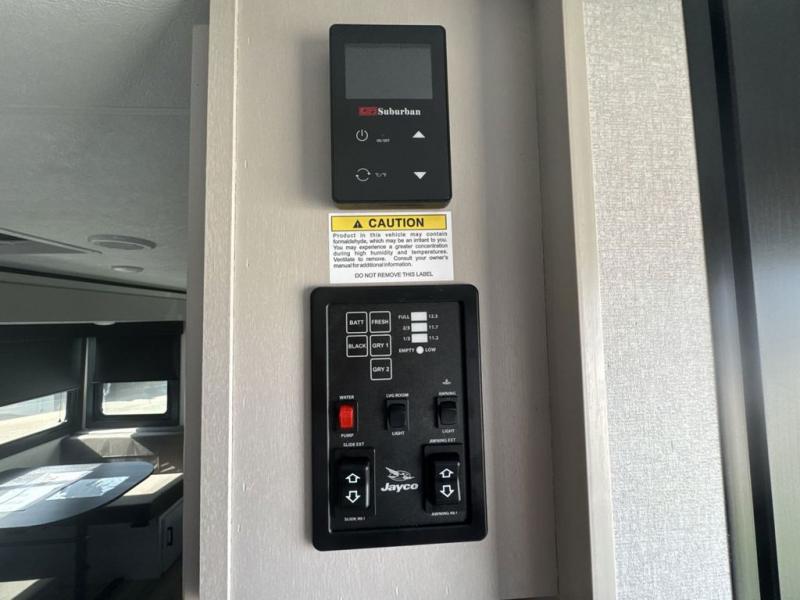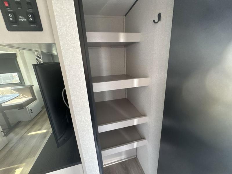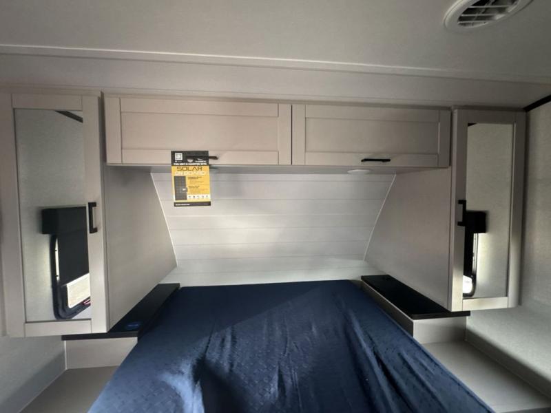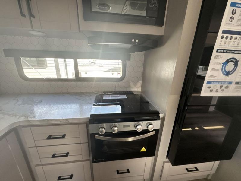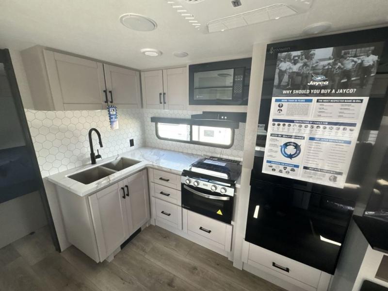 With any Jay Feather travel trailer by Jayco, you will enjoy lightweight towing, convenient exterior amenities, and at-home comforts inside! The Overlander 1 Solar Package included within the Jay Sport Package comes with a 200W solar panel and a 30-amp digital controller so you can enjoy some off-grid camping. There is also a modern graphics package with a dual-colored sidewall, LCI Solid Step fold-down aluminum tread steps on the main entry door, and Climate Shield 0 -100° F tested weather insulation package that will allow you to camp in all sorts of climates. The Customer Value Package will make time outdoors easier than ever with a power tongue jack and a Rock Solid stabilizer system, plus American-made nitro-filled Goodyear tires with self-adjusting electric brakes. More exterior features include a Keyed-Alike locking system, marine grade exterior speakers, a Magnum Truss roof system, and the list goes on! And we haven't even touched on the interior comforts, like the residential style seamless countertops and vinyl flooring throughout, decorative backsplash, handcrafted hardwood door/drawer fronts, and multiple USB charging ports to keep you going!