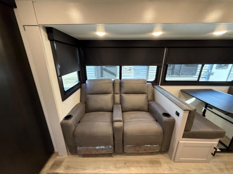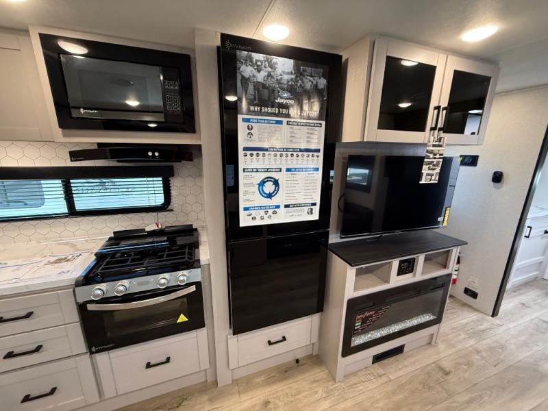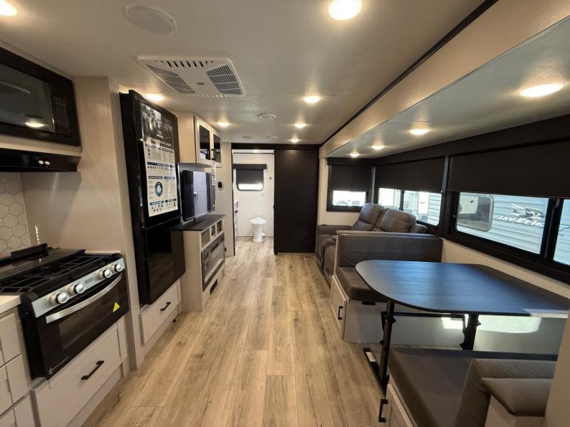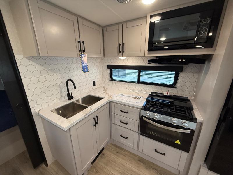 With any Jay Feather travel trailer by Jayco, you will enjoy lightweight towing, convenient exterior amenities, and at-home comforts inside! The Overlander 1 Solar Package included within the Jay Sport Package comes with a 200W solar panel and a 30-amp digital controller so you can enjoy some off-grid camping. There is also a modern graphics package with a dual-colored sidewall, LCI Solid Step fold-down aluminum tread steps on the main entry door, and Climate Shield 0 -100° F tested weather insulation package that will allow you to camp in all sorts of climates. The Customer Value Package will make time outdoors easier than ever with a power tongue jack and a Rock Solid stabilizer system, plus American-made nitro-filled Goodyear tires with self-adjusting electric brakes. More exterior features include a Keyed-Alike locking system, marine grade exterior speakers, a Magnum Truss roof system, and the list goes on! And we haven't even touched on the interior comforts, like the residential style seamless countertops and vinyl flooring throughout, decorative backsplash, handcrafted hardwood door/drawer fronts, and multiple USB charging ports to keep you going!