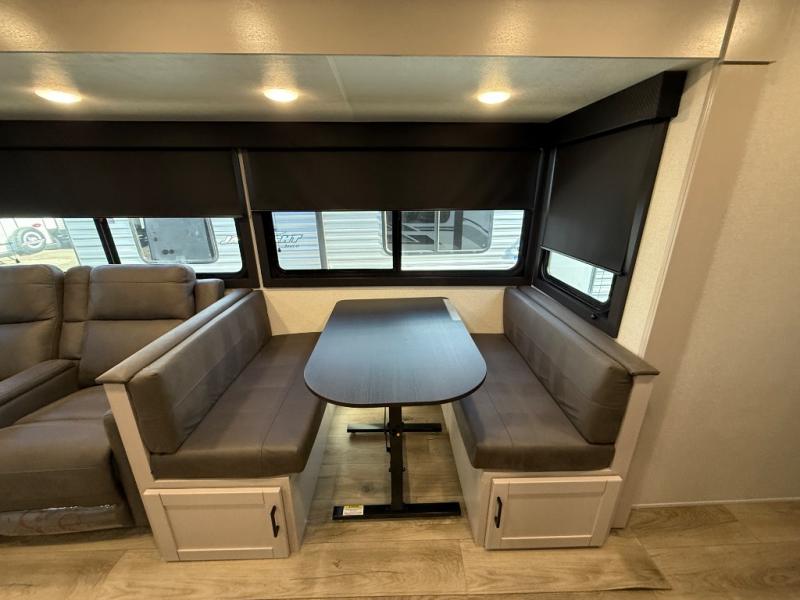 This travel trailer with a full rear bath is sure to bring you comfort wherever you camp. The front private bedroom with queen bed and dual wardrobes will have you feeling right at home. You can enjoy home cooked meals while at the campsite thanks to the three burner cooktop and 11 cu. ft. 12V refrigerator, plus there is a walk-in pantry to store all of your favorite snacks. The tri-fold sofa and booth dinette within the slide out offer comfortable places to relax. You can even cook breakfast outdoors using the outside kitchen and stay protected from the elements by the 19' power awning!