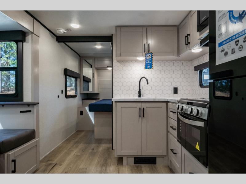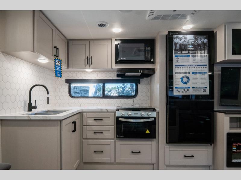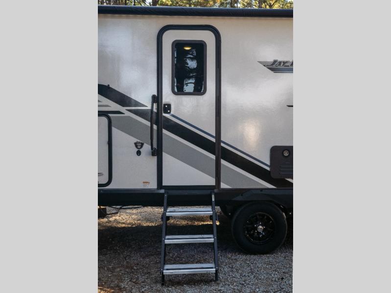 With any Jay Feather travel trailer by Jayco, you will enjoy lightweight towing, convenient exterior amenities, and at-home comforts inside! The Overlander 1 Solar Package included within the Jay Sport Package comes with a 200W solar panel and a 30-amp digital controller so you can enjoy some off-grid camping. There is also a modern graphics package with a dual-colored sidewall, LCI Solid Step fold-down aluminum tread steps on the main entry door, and Climate Shield 0 -100° F tested weather insulation package that will allow you to camp in all sorts of climates. The Customer Value Package will make time outdoors easier than ever with a power tongue jack and a Rock Solid stabilizer system, plus American-made nitro-filled Goodyear tires with self-adjusting electric brakes. More exterior features include a Keyed-Alike locking system, marine grade exterior speakers, a Magnum Truss roof system, and the list goes on! And we haven't even touched on the interior comforts, like the residential style seamless countertops and vinyl flooring throughout, decorative backsplash, handcrafted hardwood door/drawer fronts, and multiple USB charging ports to keep you going!