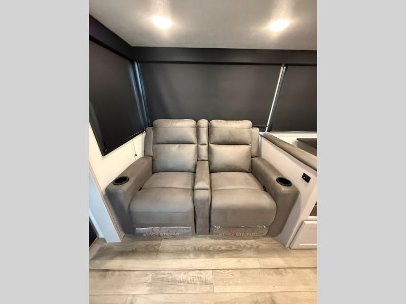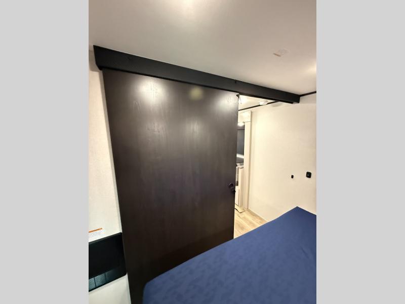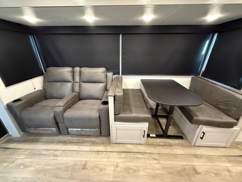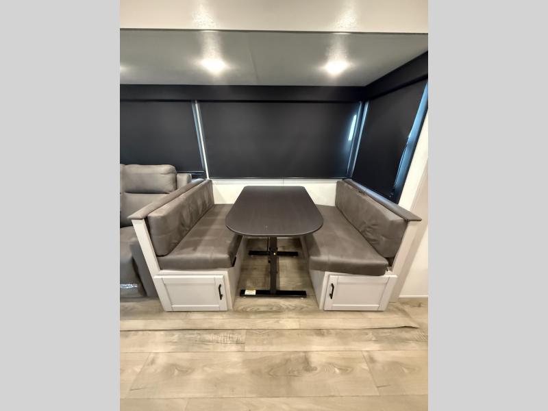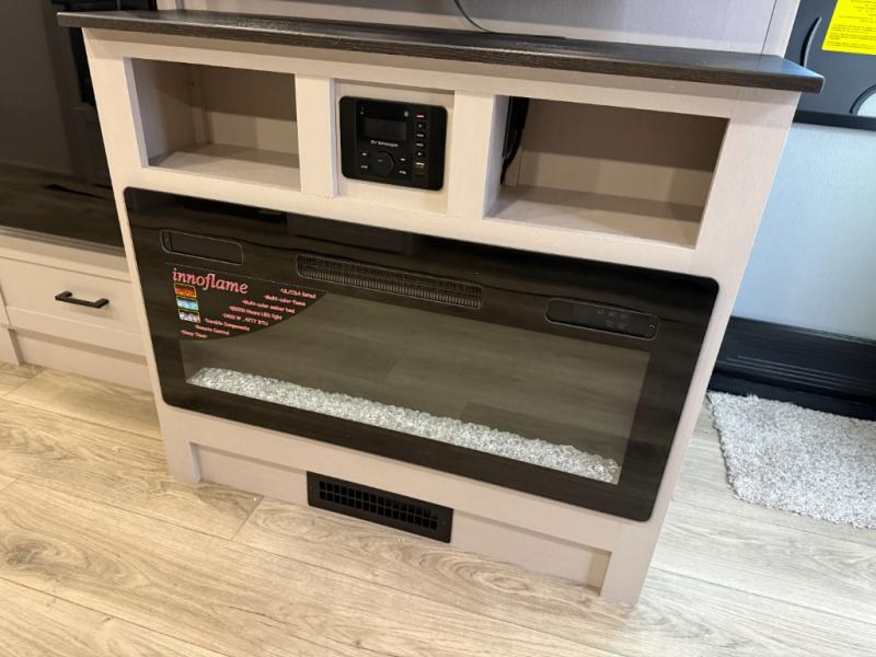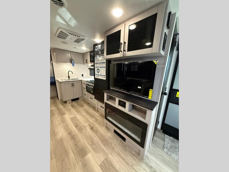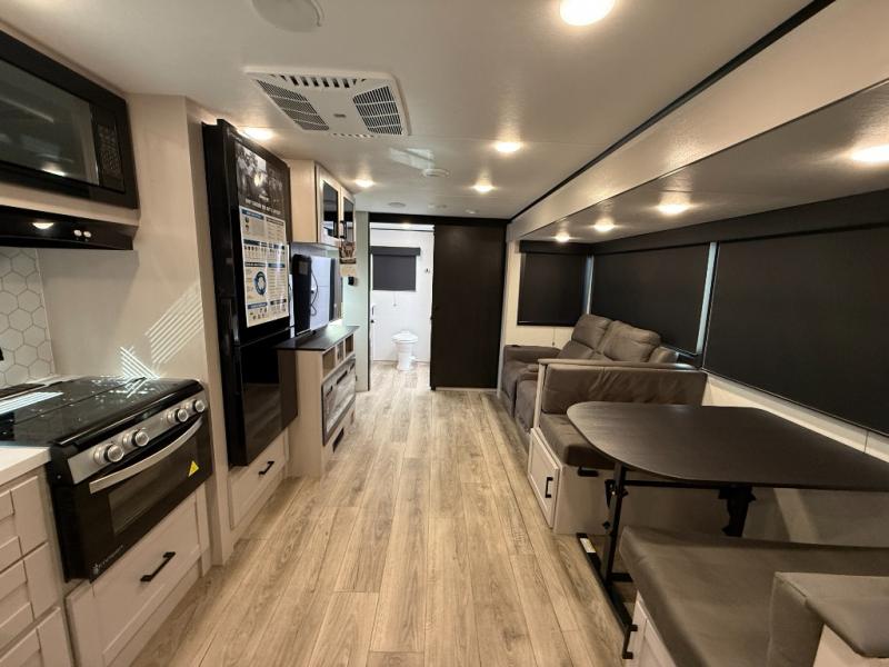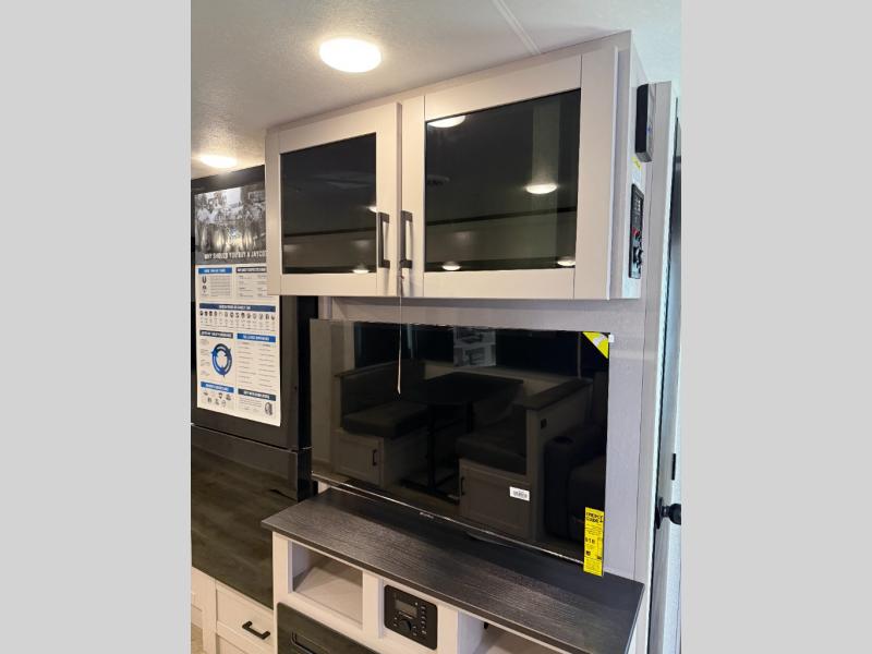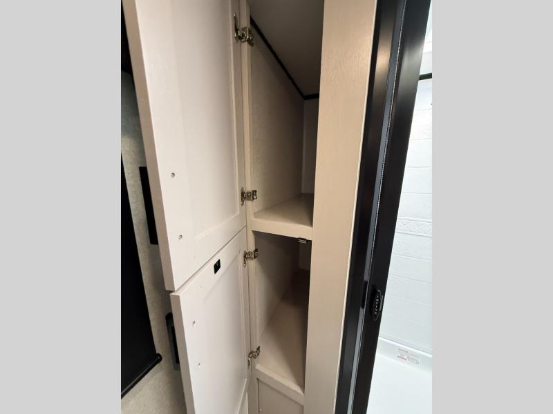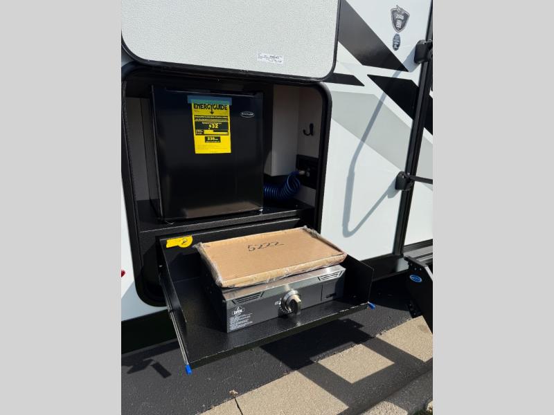 This travel trailer with a full rear bath is sure to bring you comfort wherever you camp. The front private bedroom with queen bed and dual wardrobes will have you feeling right at home. You can enjoy home cooked meals while at the campsite thanks to the three burner cooktop and 11 cu. ft. 12V refrigerator, plus there is a walk-in pantry to store all of your favorite snacks. The tri-fold sofa and booth dinette within the slide out offer comfortable places to relax. You can even cook breakfast outdoors using the outside kitchen and stay protected from the elements by the 19' power awning!